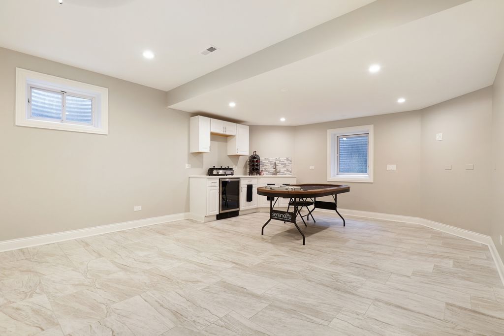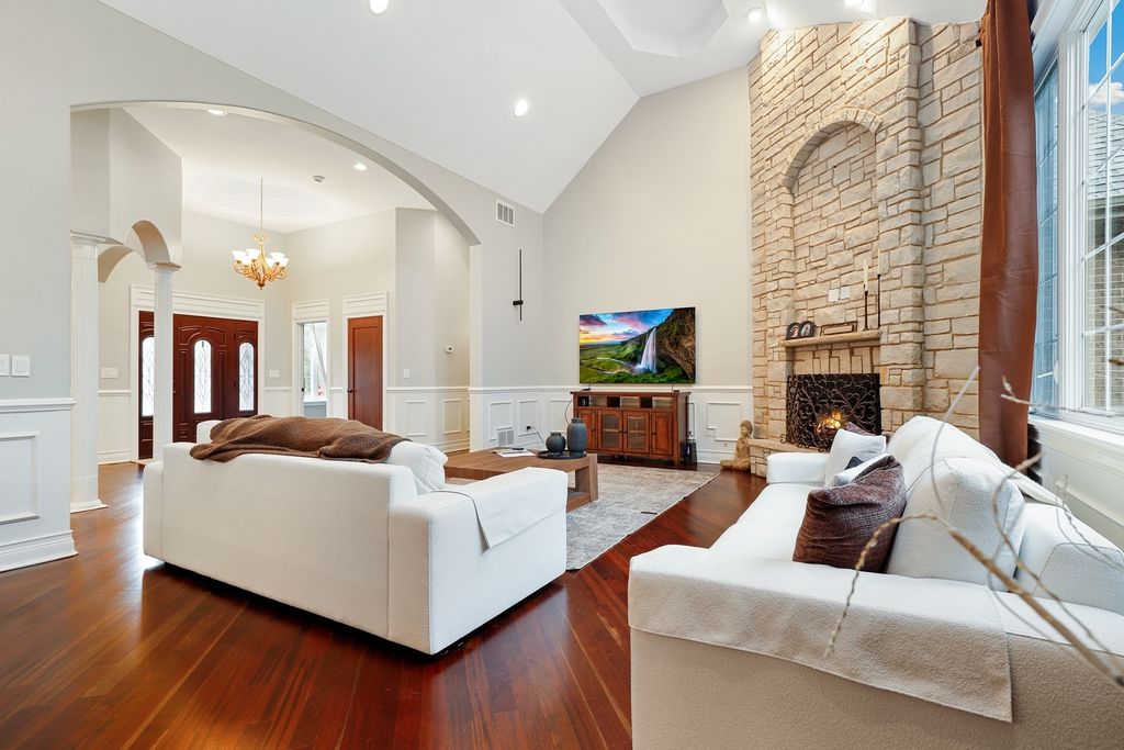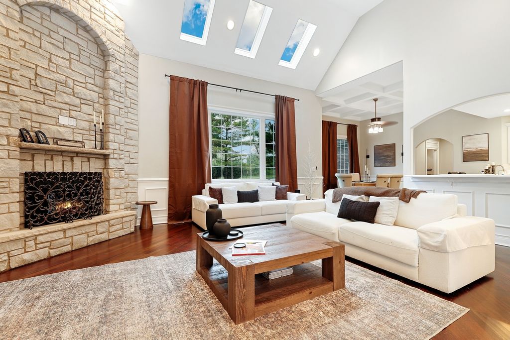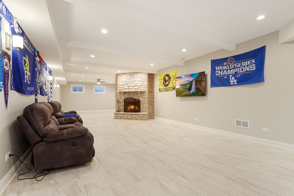 Welcome to this stunningly renovated 1.5-story luxury home in the highly desirable Lighthouse Pointe of Frankfort, nestled within the award-winning Lincoln-Way East High School district. Designed with elegance and functionality in mind, this home boasts an open and airy floor plan with soaring ceilings and abundant natural light throughout. The main living area is anchored by a gorgeous two-story fireplace (with a new insert installed in 2024), seamlessly flowing into the open-concept kitchen-a chef's dream featuring white cabinetry, new quartz countertops, high-end stainless steel appliances, and a charming eat-in area with coffered ceilings. A spacious formal dining room offers the perfect setting for elegant entertaining. Retreat to the incredible first-floor primary suite, complete with dual walk-in closets and a luxurious marble bathroom featuring a newly tiled shower with body sprays, jacuzzi tub, and high-end finishes. Two additional bedrooms on the main level provide flexibility for guests with an additional den to provide office space, playroom or formal sitting room. Upstairs, a large loft offers a great flex space, while a private en suite bedroom with its own full bath adds even more comfort and convenience. The entire main level features newly refinished hardwood floors with custom inlays, while all five full bathrooms throughout the home have been fully remodeled to reflect modern luxury. First-floor laundry room, all new solid mahogany doors, new wainscoting and trimwork, custom tray ceilings, and new plumbing fixtures throughout. All new lighting fixtures, including Lutron Caseta smart lighting system. Additional highlights include a gigantic fully finished basement with 9-foot ceilings, fireplace, and two bar areas (one with wine fridge and wet bar PLUS another custom bar in the front)-ideal for entertaining. A huge storage room in the basement for all your organizational needs. New Culligan full-home water filtration system with reverse osmosis (2024). Two new furnaces and A/C units and a new water heater (2023). Professionally landscaped backyard retreat, perfect for relaxation or gatherings. This home offers an unparalleled blend of timeless craftsmanship and state-of-the-art updates. A true must-see for those seeking luxury, space, and top-tier amenities in a premier location. Schedule your private showing today; this one won't last long!