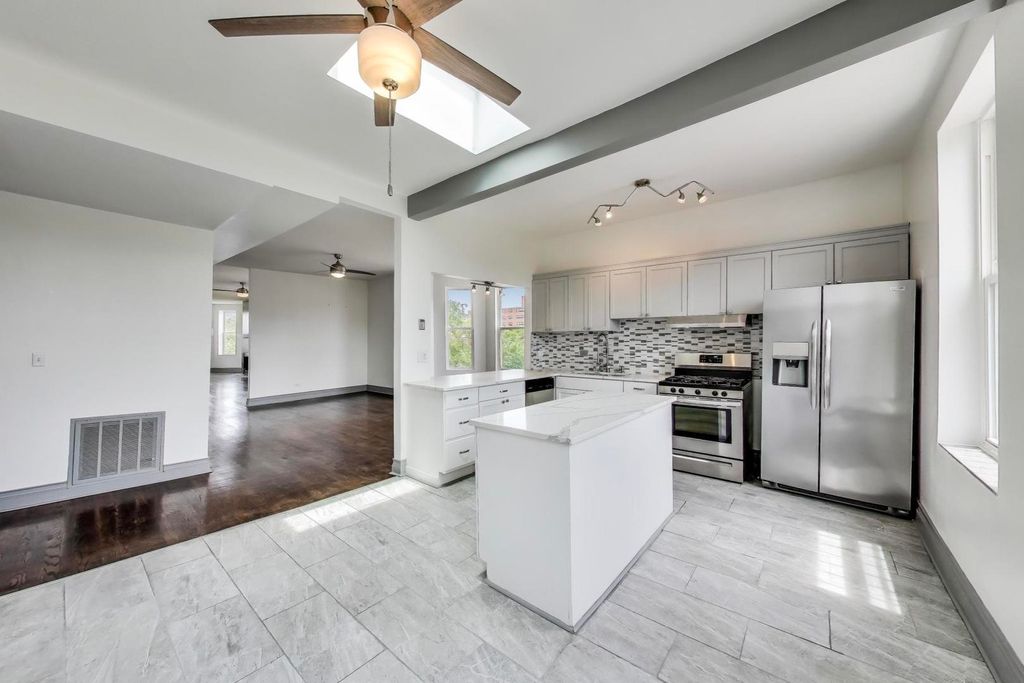 Move in this Fall! Beautifully updated 4 bedroom 4 bathroom 2,400+ square foot penthouse condo in PRIME Bronzeville featuring a living room and dining room, a gas fireplace in the living room, an open floor plan, skylights, hardwood floors, remodeled eat-in kitchen with island, granite countertops, white and grey cabinets and stainless steel appliances, an in-unit washer and dryer and two primary suites with their own en suite baths! There is a 1-car garage parking space in the rear, a nice sized rear deck for entertaining and assigned storage in the basement. This building has low assessments! Within short driving or walking distance to the 51st Street Green Line, Washington Park, Providence Hospital, U of C, Bronzeville Academy Charter School, parks, located within two blocks of the New Northwestern Medicine Bronzeville Outpatient Center, and the expressway.