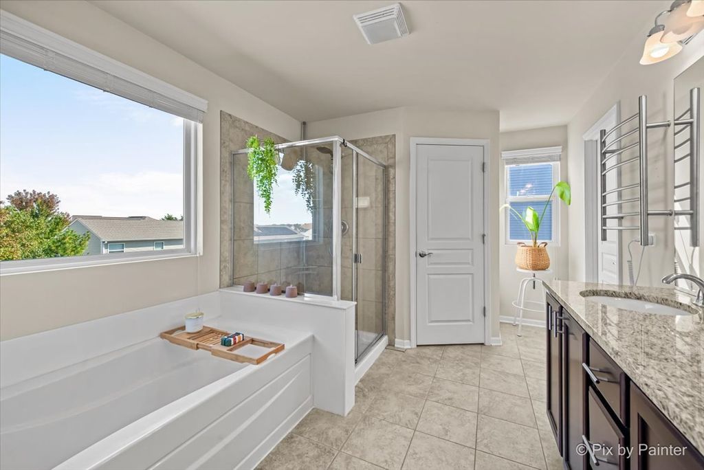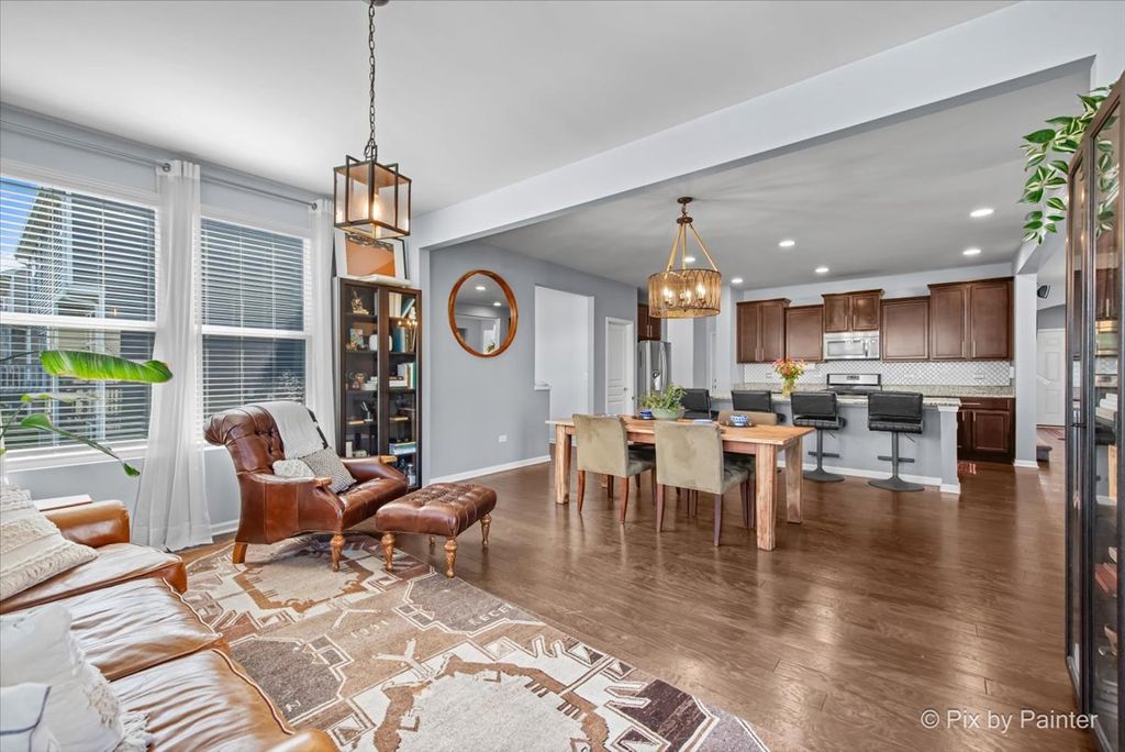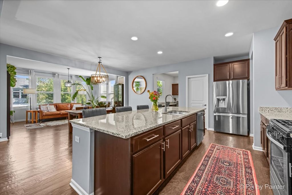 This home is a showstopper from the start, with gorgeous curb appeal, new roof and siding, and an elegant fence welcoming you the moment you arrive. Step inside to a wide, welcoming foyer that opens right into the spacious living room, where 11-foot ceilings and soaring windows make the whole space feel light, airy, and inviting. A cozy gas fireplace anchors the room, creating the perfect spot to gather and unwind. The living room flows seamlessly into the dining area and kitchen, designed for both everyday living and entertaining. The kitchen is a head-turner, featuring a huge island, rich chocolate cabinets, and a gorgeous backsplash. Just off the kitchen, the sunroom shines as one of the home's highlights-flooded with natural light, it's a dreamy space for plants or a quiet retreat. Step right outside to a large deck, great for BBQ's and kicking the feet up after a long day. The first floor also offers a stylish office, plus a bonus homework hangout, coffee bar room, or even a second office. A spacious laundry room with folding space and storage is tucked perfectly off the mudroom, keeping life organized and convenient. The 2.5-car garage gives you all the extra room and storage you need. Head up the wide staircase to the upstairs and you'll find a loft area and four oversized bedrooms, most with large walk-in closets. The primary suite is truly special, with generously sized windows, an accent wall, and a statement light fixture. The primary bath includes a tall double vanity, soaking tub, separate shower, private toilet room, and a massive walk-in closet with built-in organizers. The second full bath is just as impressive, featuring a double vanity and shower/tub combo. Downstairs, the walk-out basement is a rare find with 8.5-foot ceilings, huge windows, recessed lighting already in place, and a bathroom rough-in, making it full of potential for whatever you dream up. The backyard is just as wonderful, featuring a new elegant fence and plenty of space for relaxing, entertaining, or gardening. Get ready for a home that's as beautiful as it is functional, designed for both everyday life and entertaining!