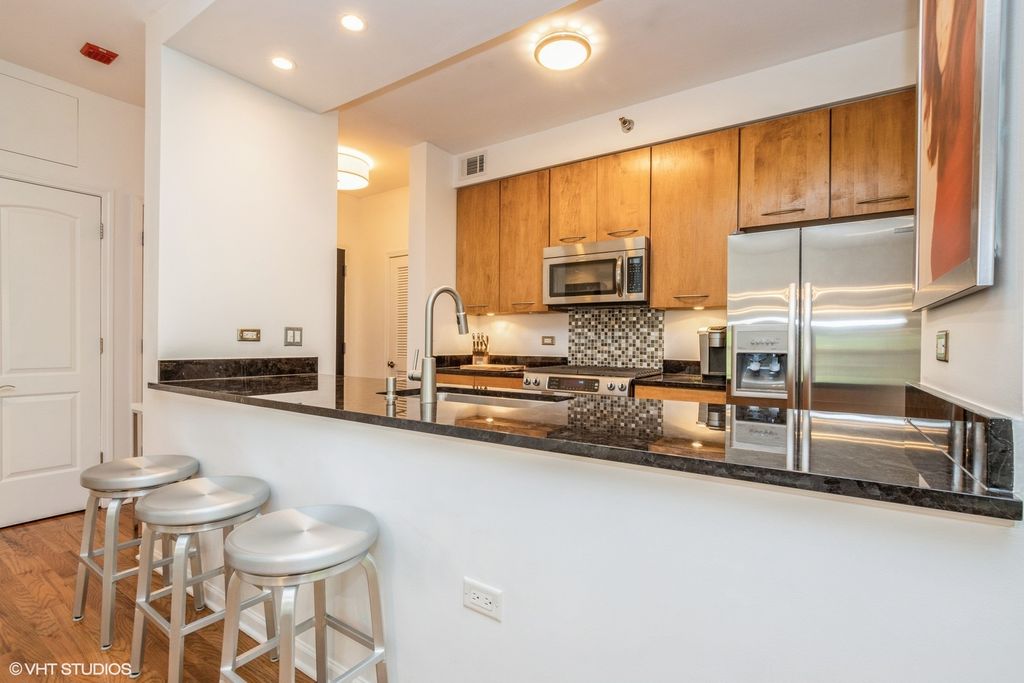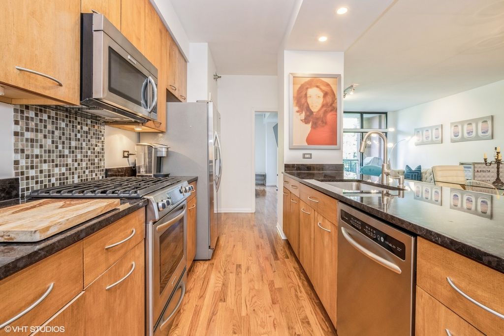 EAST LAKEVIEW - PLAZA32 - PRIME LOCATION. This beautiful home overlooks the tree-lined park and does not face Halsted. Stunning, renovated one bedroom, one bath with a balcony and heated garage parking space #126 is included in a boutique elevator building with 24-hour door staff. Beautiful kitchen with granite countertops, stainless steel appliances, and 42" Solid wood cabinetry with pull out shelves and soft close drawers. The spacious bathroom features porcelain heated tile floors, soaking tub/shower, and a custom cherry wood vanity w/marble top and an oversized under mount sink. Beautiful living room with designer lighting, marble gas fireplace, custom window treatments and wire for sound. Walk-in laundry room with front load washer/dryer and storage shelving. The building has a beautiful large common landscaped park. Assessments include nearly everything: All gas (heat & cooking), water (hot & cold), ASTOUND/RCN Digital TV with HBO MAX, and two TIVO HD DVRs, and high-speed internet/Wi-Fi included!! Storage cage included. Dog and cat friendly, building has a private dog run/park. Close to the lakefront, Target, Whole Foods, Mariano's, CTA-Belmont stop, Starbucks, shopping, & restaurants. Extremely well-managed building.