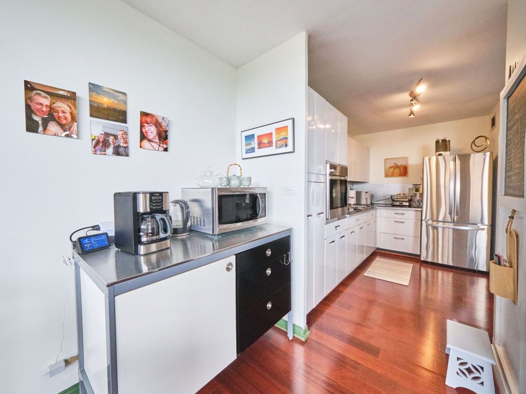 Immaculate condo with stunning lake, park & city views. Open floor plan, engineered wood floors, modern retro kitchen with Miele oven & new stainless fridge, oversized bedroom, and renovated bath with soaking tub. Ample closets & storage. Assessments 10/01/25: $1,010.91 + $73.78 cable/Wi-Fi, covering heat, water, scavenger, building maintenance, on-site management, 24/7 doorman/garage hikers, and master insurance. Building features 24-hr door staff, valet, bike room, rooftop deck, rec room & grilling area. Prime location near Montrose Beach, golf, tennis, restaurants & express bus to downtown.