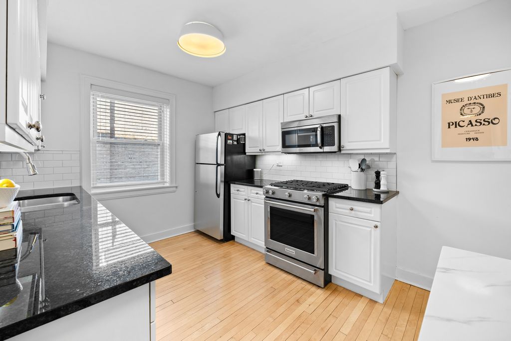 Welcome to this adorable 2-bedroom, 1-bath second-floor home in the heart of vibrant Roscoe Village. Sun filled with hardwood floors throughout; the living room showcases a wall of windows that flood the space with natural light, plus a cozy gas fireplace framed by custom "built-ins". The nice sized primary bedroom boasts ample, well organized closet space for all your storage needs. French doors open to the second bedroom/office, offering flexible space for work or guests. The galley kitchen provides ample counter space and a great layout for cooking/entertaining. Enjoy the convenience of in-unit laundry, a shared deck, and a huge private storage unit perfect for bikes, seasonal gear & extras. A layout that maximizes comfort and style. Just steps from neighborhood cafes, trendy bars, boutiques, and everyday shopping, it's an ideal city retreat with everything you need right outside your door. A perfect blend of character and location-don't miss this one!