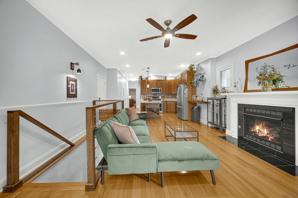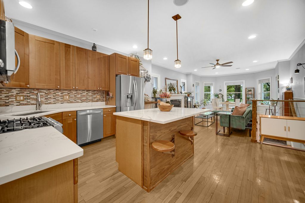Welcome to this bright and inviting duplex-down condo, perfectly situated across from a park offering peaceful green space and beautiful views in the walkable Albany Park area. Natural light pours in through large windows, creating a warm and welcoming atmosphere throughout. The main level features an open layout with kitchen and island, dining area nestled in the bay window (a dream spot for plant lovers), and a cozy living room with a gas fireplace and built in bluetooth speakers. Two generously sized bedrooms are also on this floor, including a primary suite with a walk-in closet and private bathroom. A second full bathroom is easily accessible for guests, with extra storage nearby. Off the back, you'll find a private deck, perfect for relaxing, gardening, or enjoying crisp fall evenings. The lower level has been freshly carpeted and painted, and offers a spacious family room, ideal for movie nights, entertaining, or extra living space. You'll also find a third bedroom, a full bathroom, and an abundance of storage, including a laundry room with side-by-side machines. There is a versatile nook under the stairs, for a home office, playroom, wine cellar, or just extra storage! This home lives like a single family, and comes with a private garage, plus access to a shared yard, giving you even more room to enjoy. With generous living space, thoughtful storage, and unbeatable light, this Albany Park condo truly checks all the boxes.