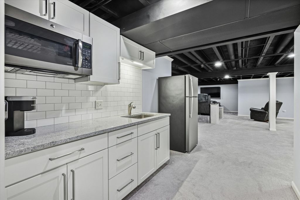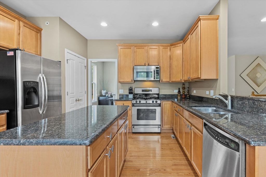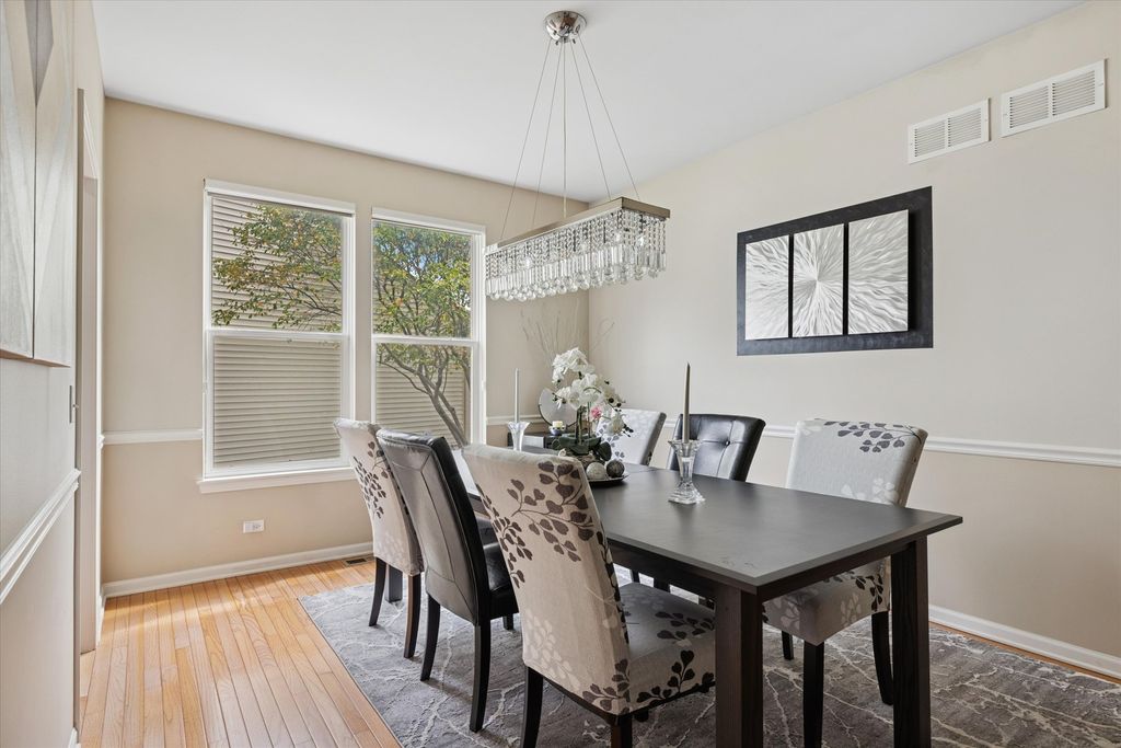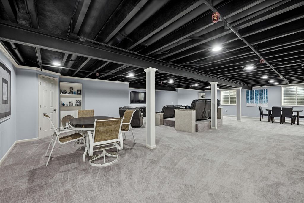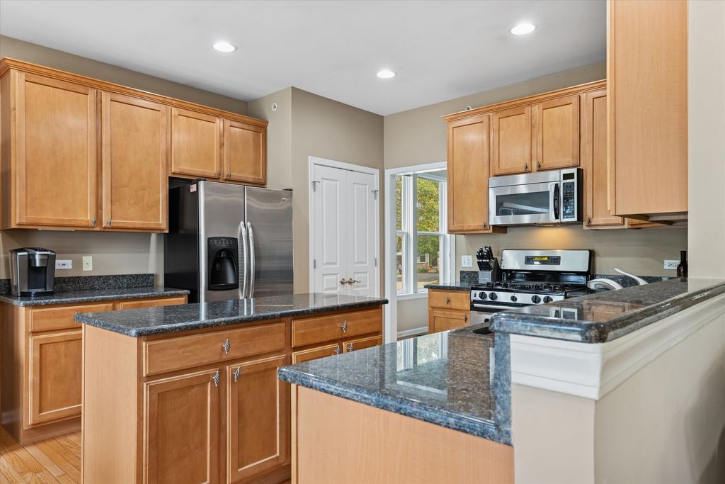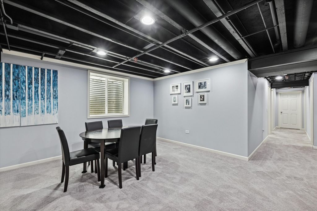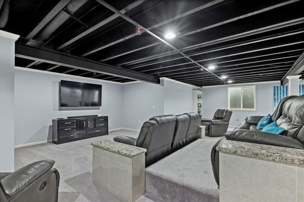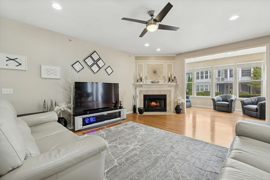 This elegant ranch home welcomes you with a large open foyer, highlighted by crown molding and custom millwork that add timeless character. A spacious open layout blends style and comfort, with gleaming hardwood floors and recessed lighting that flow through the main level into the expansive living room, complete with a striking gas fireplace and an adjacent sunroom. The fabulous eat-in island kitchen features 42" maple cabinets, granite counters, and stainless-steel appliances perfect for both everyday living and entertaining. The primary suite is a true retreat with a spa-like bath, soaking tub, separate shower, dual sinks, and a generous walk-in closet. 9ft ceilings and a den with cherry built-ins add to the home's warmth and sophistication. The enormous finished basement offers high ceilings, a theater area, 3rd full bath with quartz and custom tile, plus a kitchenette with quartz counters, sink, microwave, and fridge. Two additional rooms are currently used as bedrooms (not legal bedrooms). Step outside to a large deck with a built-in direct-connect gas grill overlooking a lovely yard. A lawn sprinkler system, upgraded electrical in the garage, and owned solar panels-no lease, just savings-are all included. All in a highly convenient location near walking paths, ponds, I-90, Sherman Hospital, Metra, and shopping!