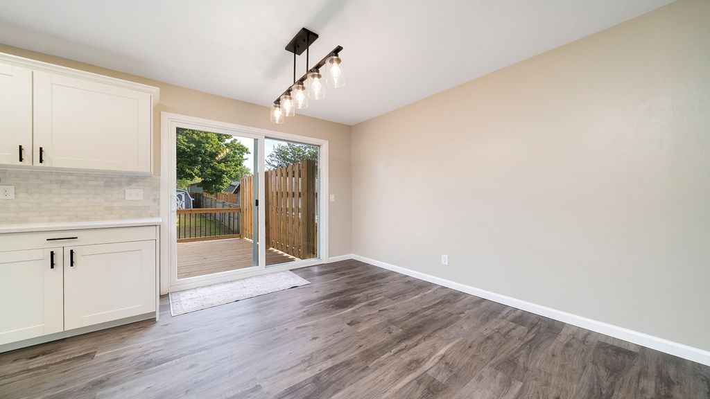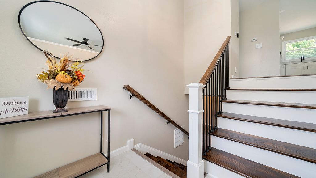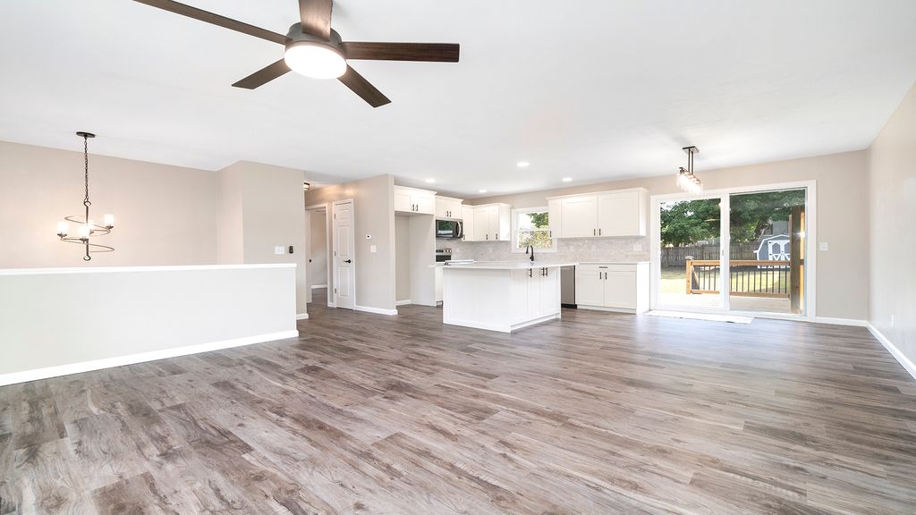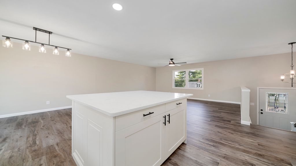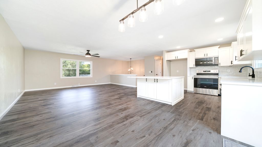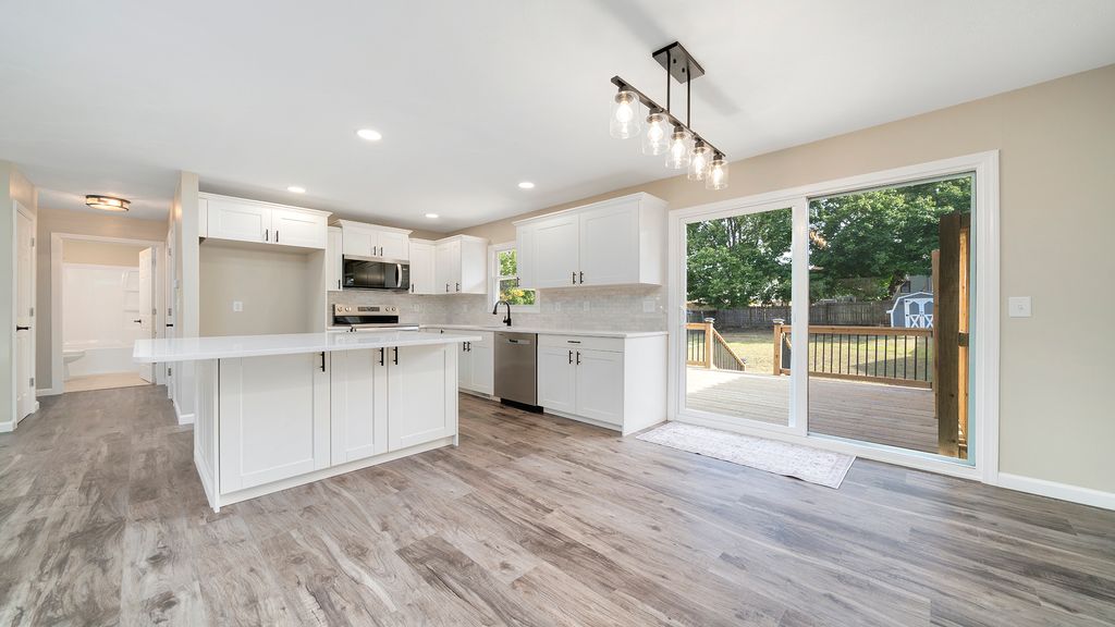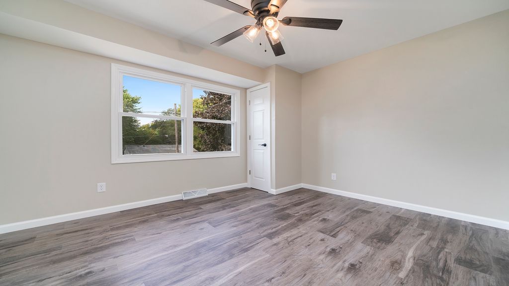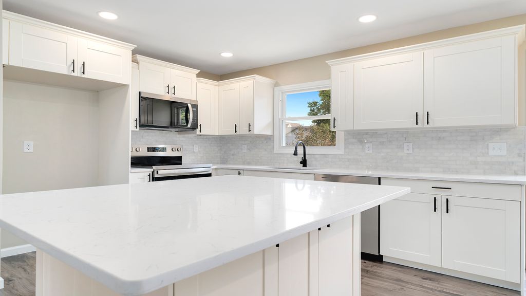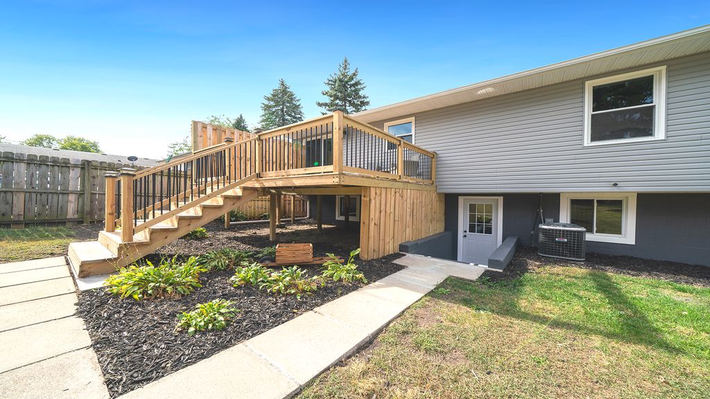 Just like brand new !!! Fully renovated and ready to move in! This 4 bedroom - 2 full bath home with walk out lower level has been totally remodeled with no detail missed. New siding, windows, doors, flooring, trim, all fresh paint, light fixtures, bathrooms, kitchen cabinetry with quartz counter tops and 50x60 island and brand new Whirlpool convection/air fryer stove, microwave, and dishwasher, new 12x16 deck off the dining area. Fenced backyard with a 8x10 shed. Roof, furnace and central air 2022, water heater 2023