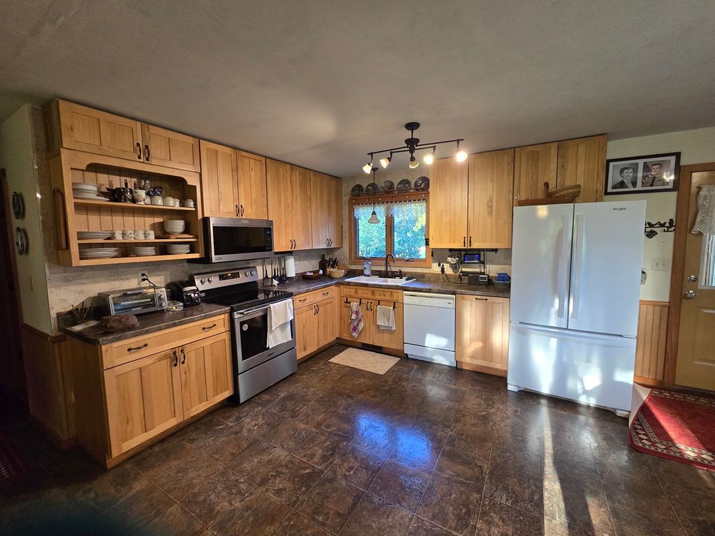 Great opportunity to have your own private retreat on 7.85 acres! Lovely custom-built cabin/ranch home with an open layout. Kitchen, living room and dining room are all combined. All appliances are newer and will remain with the property. Enjoy the tranquil prairie views from the covered porch. Oversized 2 car garage with workshop areas.