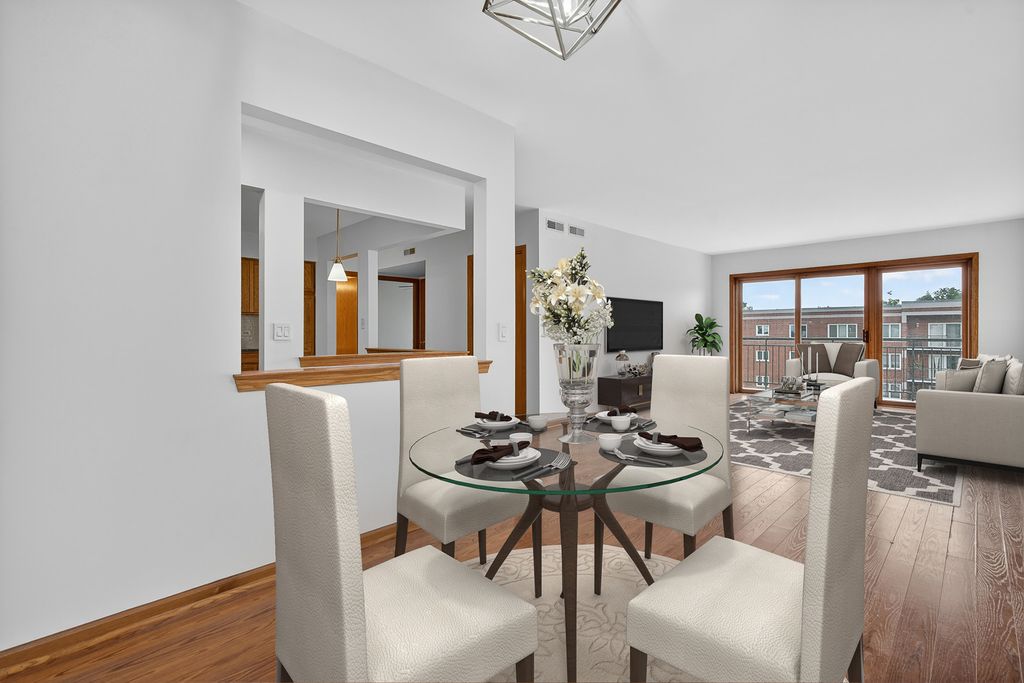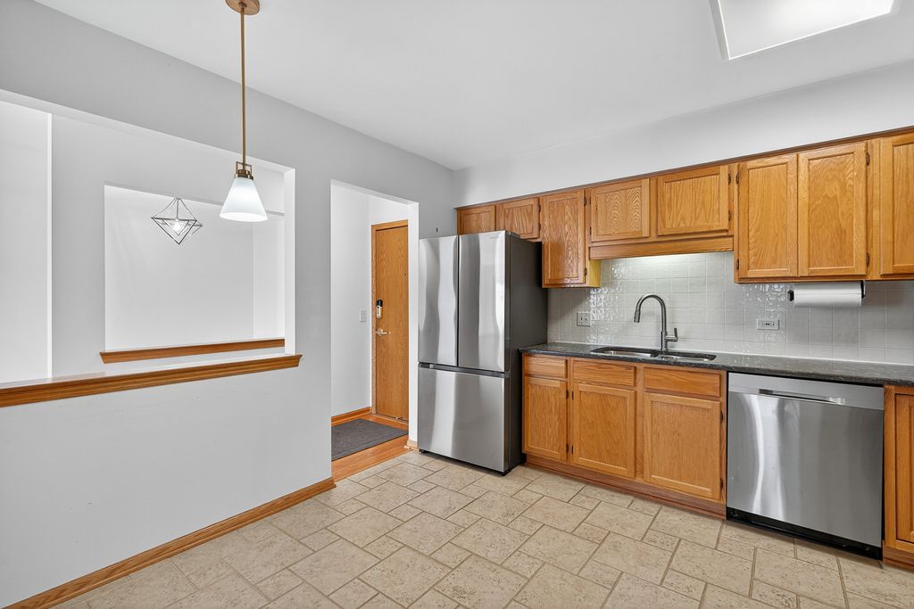 Meticulously maintained 2 bed/2 bath condo in the highly desirable and well-managed "Building 5" in the River's Edge condominium complex. This top-floor unit features skyline views enhanced with studio wall mirrors to light up the spacious living room and formal dining area. The eat-in kitchen features newer Samsung smart appliances, granite countertops, and a deeper kitchen sink installed for large cookware. The primary bedroom features a generously sized ensuite bath with a walk-in shower and plenty of storage. Separate laundry room. Wi-fi and cable included in the assessments along with radiant floors which keep the unit warm in the winter with minimal use of central heat. Heated garage space with bike rack and adjacent storage closet. Herbicide-and-pesticide-free grounds. The rear of the building has direct access to LaBagh Woods and the North Branch River, with bike/running trails connecting the community to the north suburbs. Grocery stores, shopping, parks, and the I-94 expressway are all within walking distance. This is the epitome of quiet and peaceful city living and is an ideal location for nature enthusiasts.