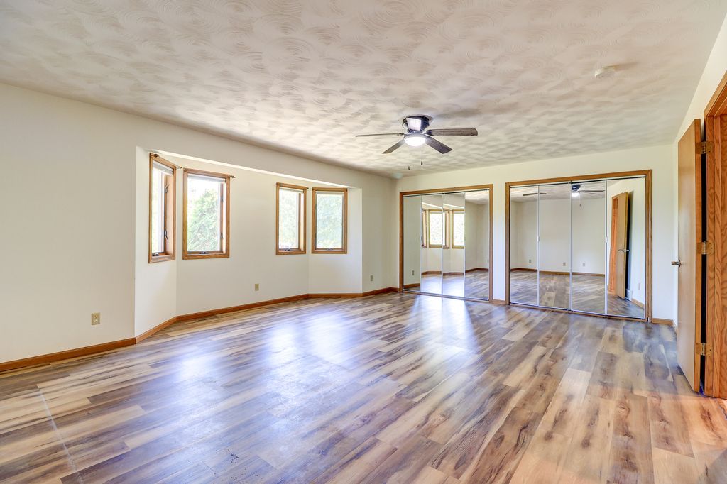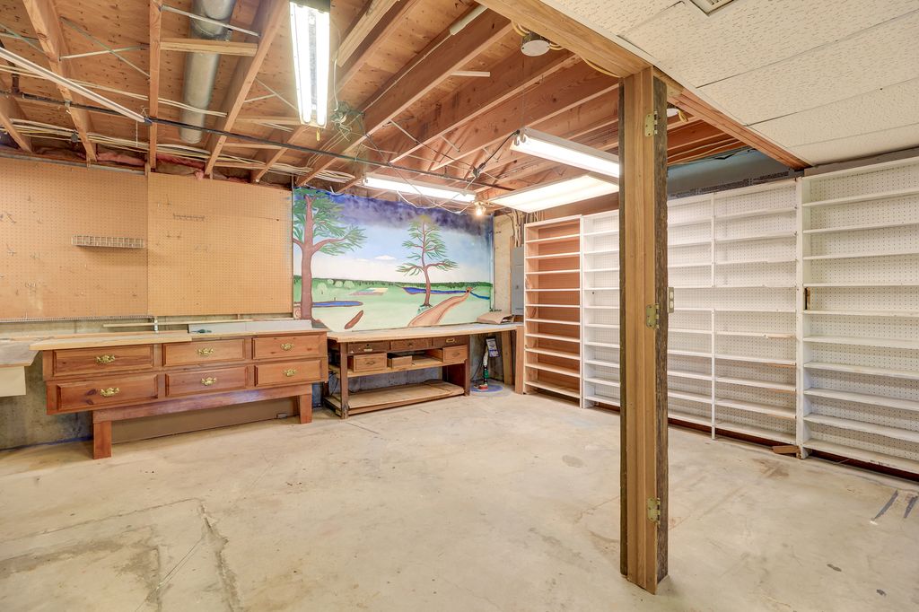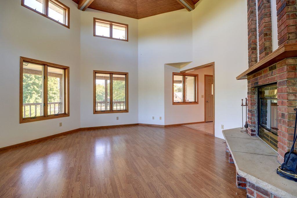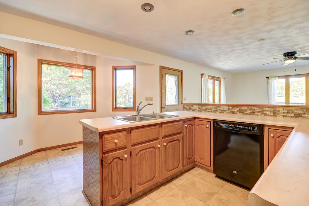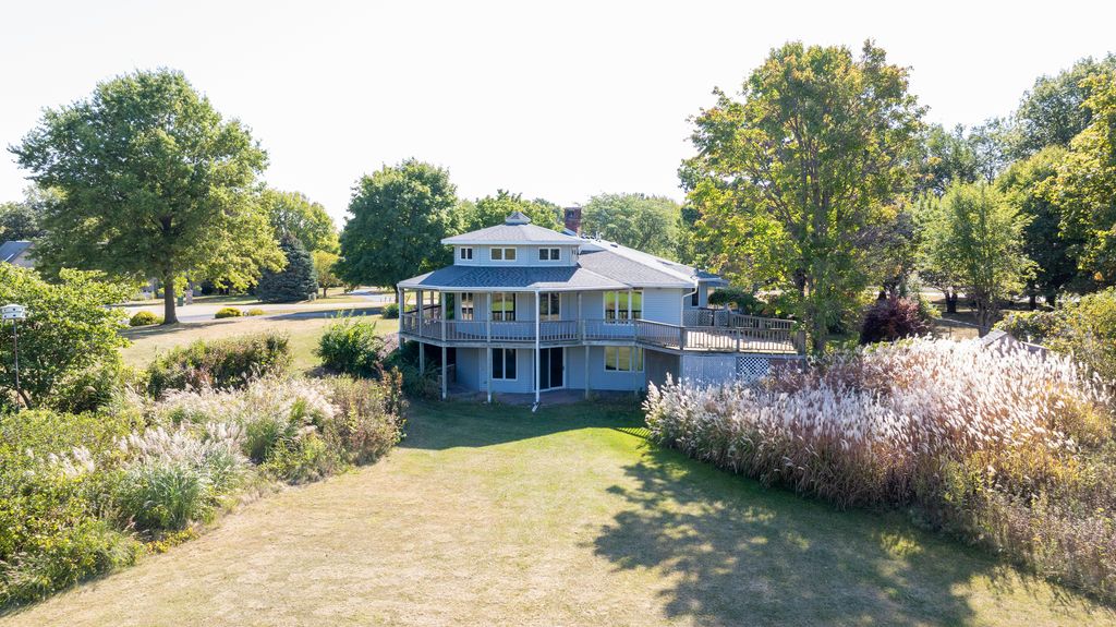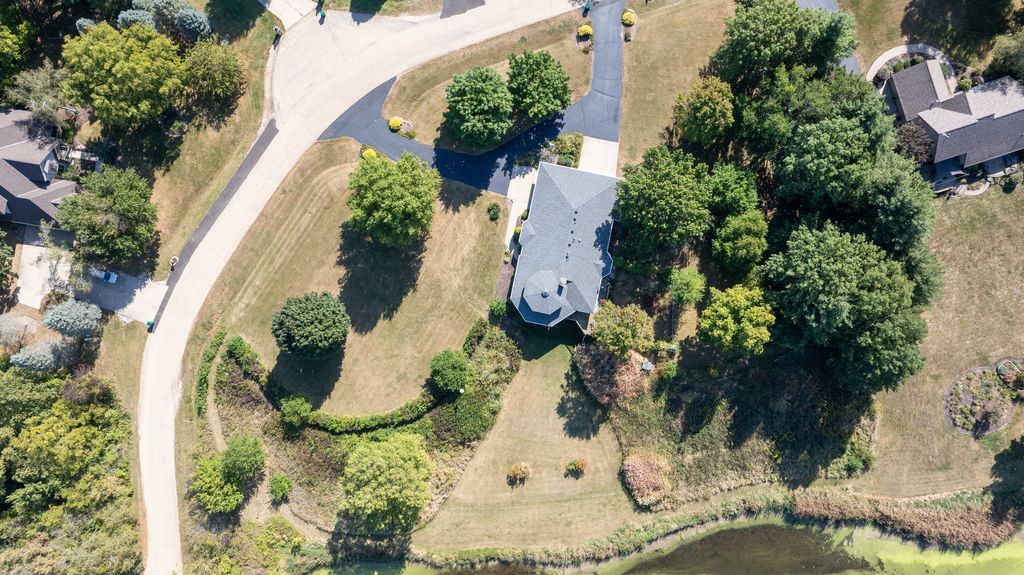 Welcome to this beautifully maintained ranch-style home with a walkout basement offering flexible living space, thoughtful updates, and serene outdoor features. Situated on a spacious lot with peaceful views and a fish-stocked common-area pond, this property blends comfort, functionality, and charm. The inviting wrap-around porch extends to a large deck perfect for relaxing or entertaining outdoors. Inside, the freshly painted main level features an open-concept kitchen that flows into a living area, ideal as a dining room or cozy family space. A uniquely shaped living room with a cathedral ceiling and a gas fireplace adds warmth and character. The main floor offers two bedrooms, including a spacious primary suite with ample closet space, a walk-in tub, and double sinks, plus the convenience of main-level laundry. The walkout basement adds even more living space with a third bedroom, a full bathroom, and a family room featuring a second fireplace, plus additional space perfect for storage, a recreation room, gym, workshop or hobby area. The impressive four-car garage, with epoxy floors and two double-door entrances, is perfect for car enthusiasts, hobbyists, or for extra storage. Outdoors, enjoy a partially fenced yard, enclosed lean-to, and landscaped yard. Notable upgrades include a new roof (July 2025), whole-home generator, leaf gutter guards, new windows in select areas, hallway bathroom (2020), French drain, and two sump pumps.