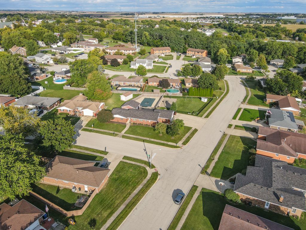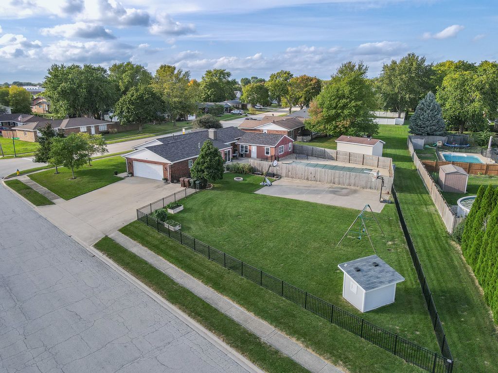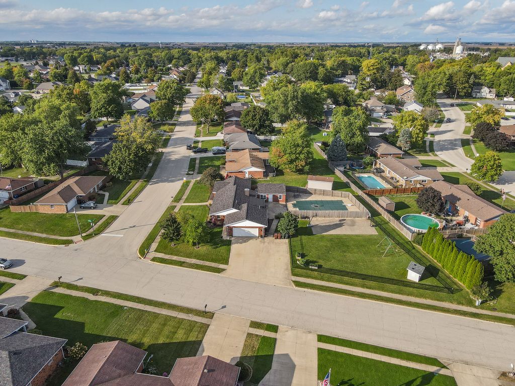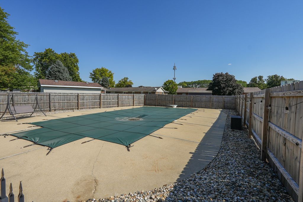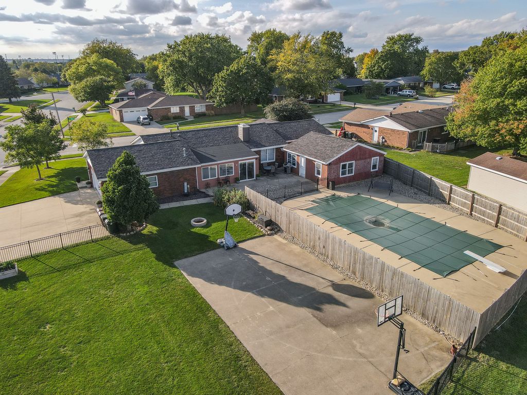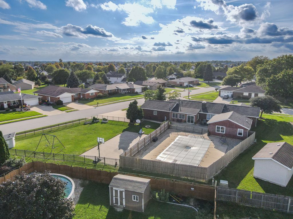 All brick 3 bedroom with a possible 4th, 2 bath ranch situated on a huge double corner lot! Step inside to a spacious eat in kitchen featuring bright white cabinetry, stainless steel appliances, and new quartz countertops. The focal point of the living room is the stunning floor to ceiling brick fireplace, creating a warm and inviting atmosphere that's perfect for gatherings or quiet evenings at home.The finished basement offers additional living space with a cozy brick fireplace, living room, possible 4th bedroom, and a multipurpose room. Unwind in the Florida room while enjoying views of your inground pool, complete with a diving board, the ultimate setting for summer fun and entertaining. A pool house with plumbing and electrical offers great potential but will need rehab to make it your own. Outside, a massive fenced yard with a basketball court and fire pit sets the stage for endless outdoor recreation. This one of a kind home is ideally located near schools and Heritage Park, offering over 3,600 square feet of living space. A must see, don't miss your chance to make this one yours! Roof 23, Furnace 22