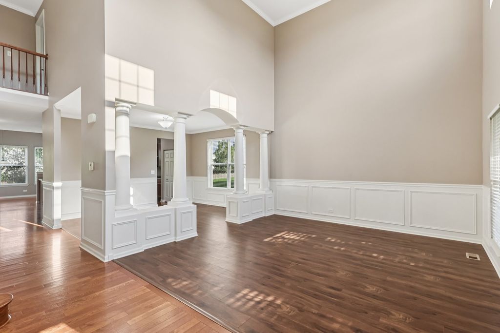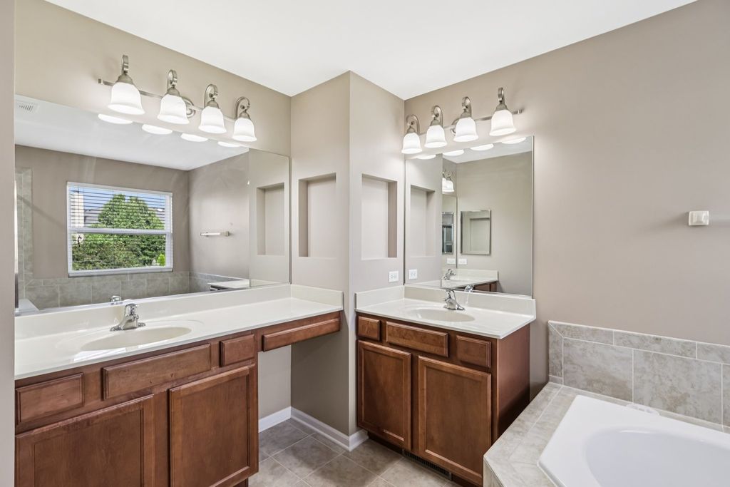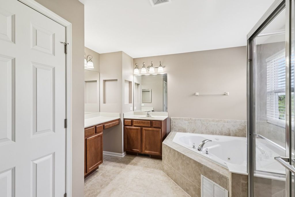 Beautifully upgraded 4-bedroom, 3.5-bathroom east facing Haverford model. The moment you walk through the front door, the two-story vaulted foyer welcomes you with natural light that pours in through soaring windows, creating a bright and inviting atmosphere. The gourmet kitchen is a true showpiece, featuring 42-inch maple cabinets, sleek Corian countertops, and stainless steel appliances. A perfect blend of style and function, the kitchen opens seamlessly to the family room, accented by classic columns and an integrated surround sound system. Arched doorways and custom chair and crown moldings add elegant character throughout the main floor. A versatile first-floor office/den/bedroom offers flexibility for your lifestyle needs. Upstairs, the oversized primary suite is a luxurious retreat with a tray ceiling, dual sinks, a whirlpool tub, and a separate shower. The additional three bedrooms are spacious and comfortable-two share a convenient Jack-and-Jill bath, while the other enjoys its own private bathroom. Brand-new carpet on the stairs and in the primary suite adds a fresh touch. The FULL unfinished basement with rough-in plumbing offers endless possibilities for expansion, while the expanded laundry room makes daily tasks easier. Outdoors, enjoy a private fenced backyard with a paver patio and built-in firepit, perfect for entertaining or relaxing. The 3-car garage provides plenty of space for vehicles and storage. This home is part of a vibrant community with outstanding amenities, including a pool, clubhouse, tennis and pickleball courts, and beach volleyball. Its prime location is just a short walk to the nearby elementary school, making everyday living convenient and connected. Close to shopping and restaurants.