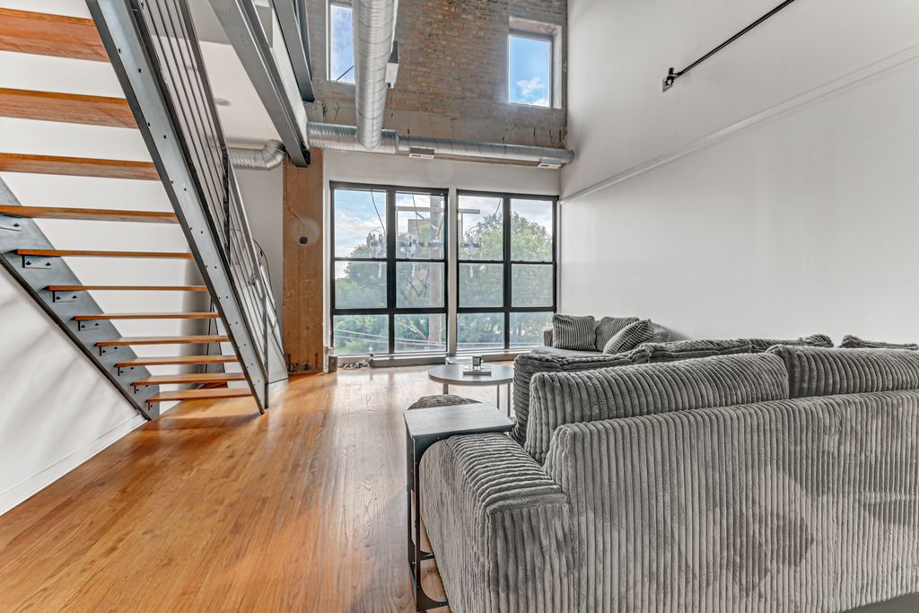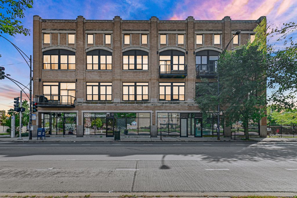 Step into this stunning top-floor duplex loft, uniquely set in a solid concrete building with exposed brick and floor-to-ceiling south-facing windows flooding the space with natural light. Offering 2 fully enclosed bedrooms and 2 full bathrooms across two levels, this home blends modern comfort with urban style. Completely refreshed in 2024, the home features all-new stainless steel appliances, updated light fixtures, fresh paint, new shades for privacy and ambiance, and updated flooring in select areas. The open-concept main floor showcases a spacious living and dining area with oak hardwood floors, alongside a sleek kitchen with shaker cabinetry, granite countertops, and a large eat-in island-perfect for cooking or entertaining. One bedroom and full bath are conveniently located on the main level, while the upper floor hosts a second private bedroom with full bath. Additional highlights include a walk-in laundry/utility room, abundant closet space, and gated attached outdoor parking. Enjoy the convenience of having a coffee shop right in the building, plus parks, dining, and public transit just steps away. With no neighbors above you, this rare top-floor loft offers a quiet retreat in one of Chicago's most vibrant and evolving neighborhoods.
