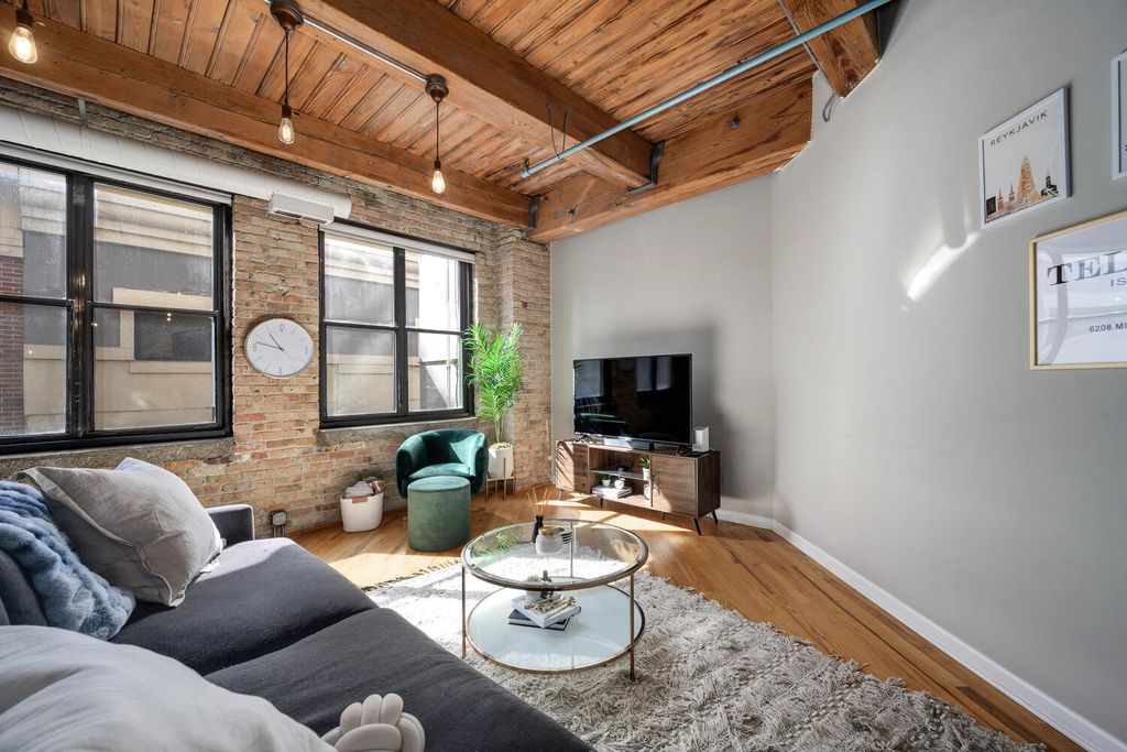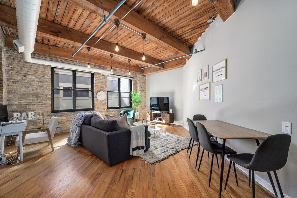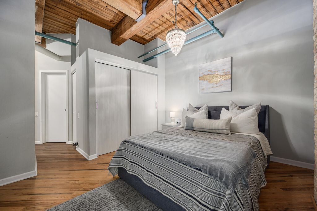 Perfectly updated oversized 1 bedroom brick and timber loft with great south light! Located in a great boutique elevator building, this loft features great living space, an open kitchen, and hardwood floors throughout! Crisp updated white kitchen open to the living space with stone counters and stainless appliances! Hardwood floors throughout! Great bedroom with chandelier, and large custom built out closets and new closet doors! Newer bathroom with soaking tub and amazing storage! In unit washer and dryer, newer furnace, NEST thermostat and great updates throughout! Solid professionally managed building with roof deck, gym, bike storage, and evening door staff! Solid River North location seconds to restaurants, shopping, galleries and transportation!