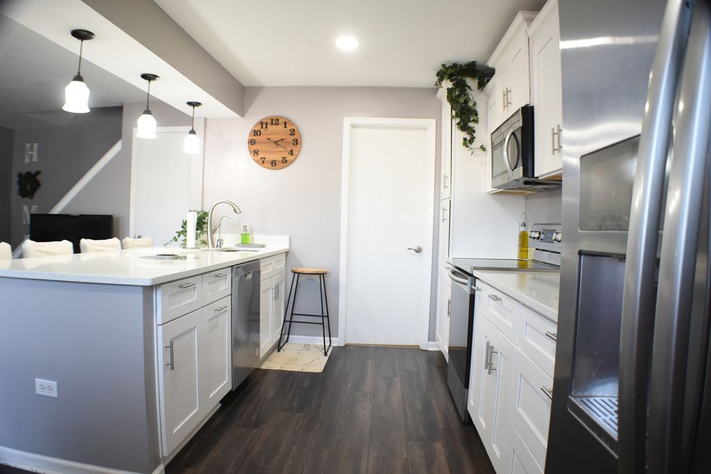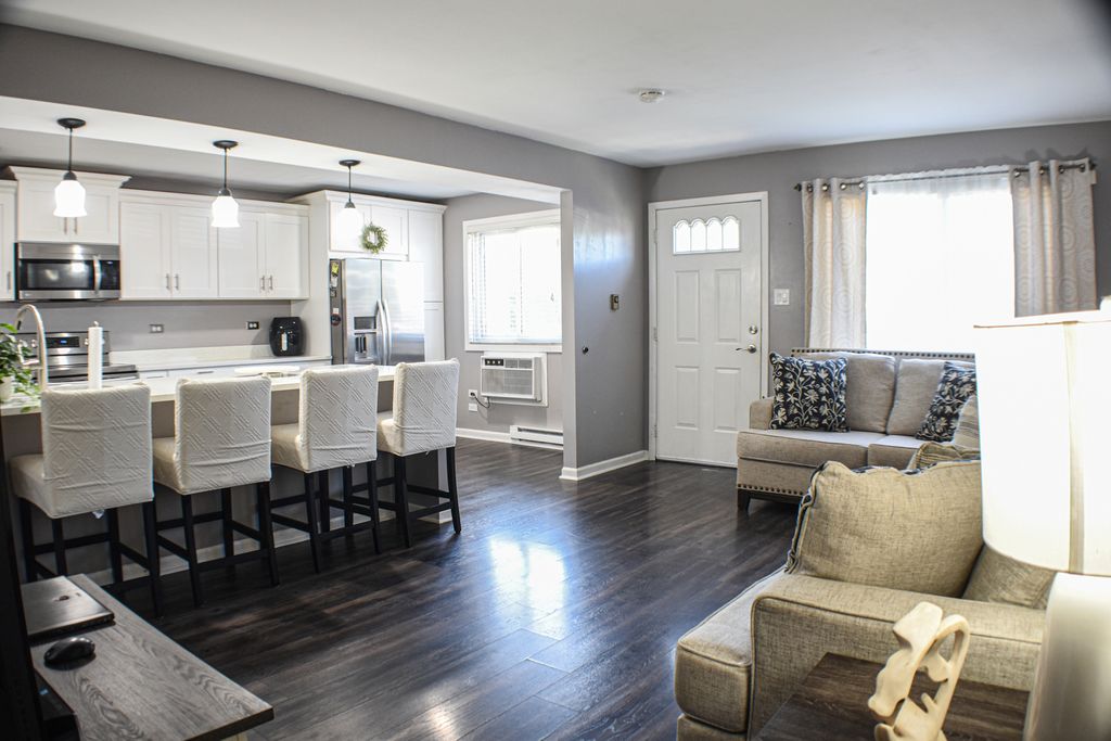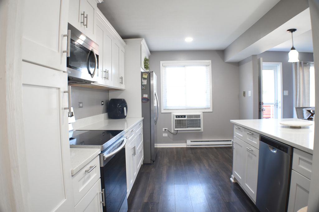 Move-in ready 2-story townhome! Features 2 bedrooms, 1.5 full baths, Remodeled kitchen with open concept also featuring quartz countertops, beautiful flooring on the main level, and cozy carpet in bedrooms. Spacious master suite with walk-in closet. Finished attic with plenty of storage. Convenient in-unit laundry. Minutes from shopping, dining, and Metra - perfect location for commuters! A must see!
