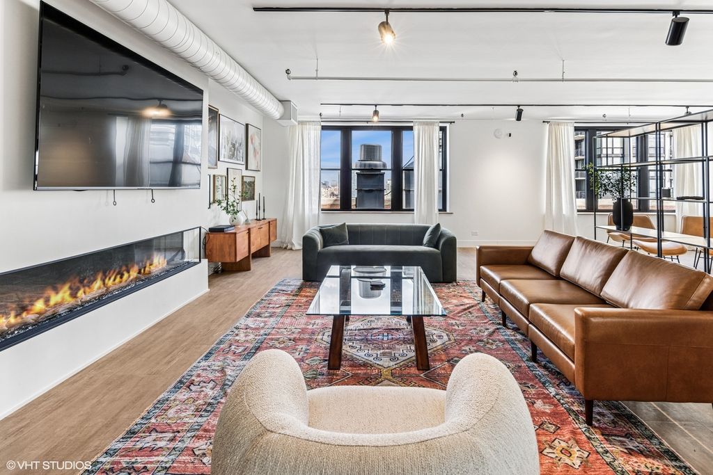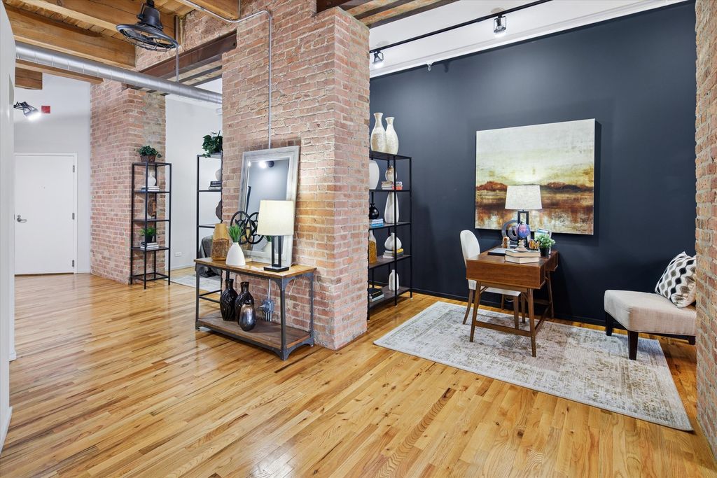 Step into one of the most unique condos at the popular Haberdasher Square Lofts, a massive 1,406 sq. ft. that is the largest one-bedroom layout in the building, boasting incredible character and architectural details throughout. This residence perfectly blends modern luxury with industrial charm, featuring exposed brick, 11' 7" timber ceilings, and thick timber beams, all complemented by exceptional finishes and thoughtful design. The Chef's Kitchen is fully updated with modern cabinetry, sleek granite counters, a tile backsplash, and stainless steel appliances, while the massive master suite features a totally renovated luxury bathroom with a spa-like walk-in rain shower, heated floors, and a floating Robern dual vanity & medicine cabinets with integrated lights. A unique highlight is the 25-foot gallery wall and a versatile room ideal for a library, home office, or cocktail bar. Also an opportunity for a two-bedroom conversion in the current dining space. The space, framed by a brick/timber door entry, is currently used as a dining room. Residents enjoy fantastic amenities like a rooftop sundeck, an indoor half basketball court, an exercise room, and 24-hour door staff, all set within a fantastic West Loop & Greektown location steps from Randolph Street Restaurant Row and convenient to both Union/Ogilvie train stations and the Blue Line. Parking options may be available in the building.