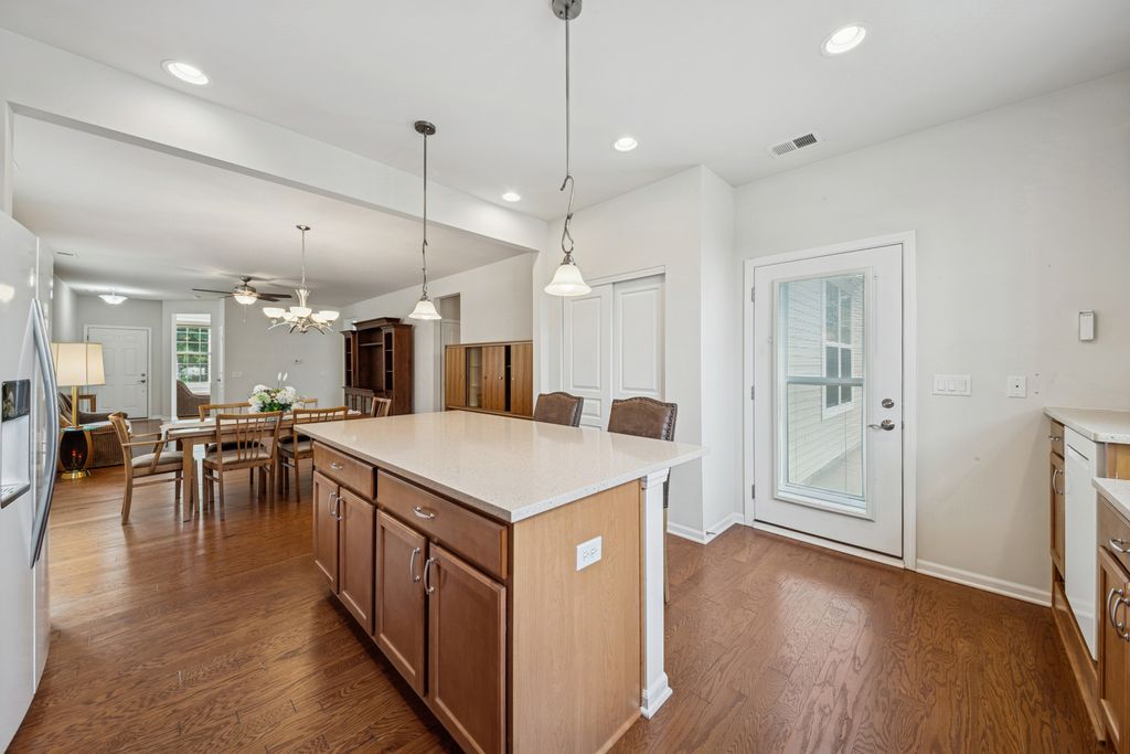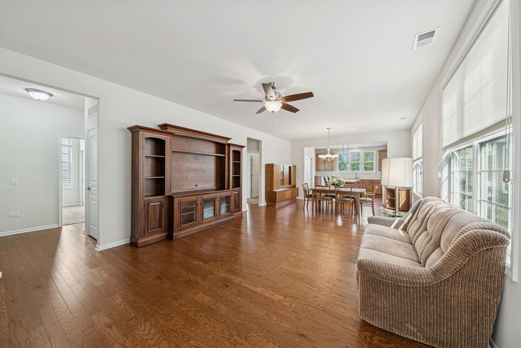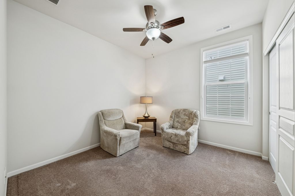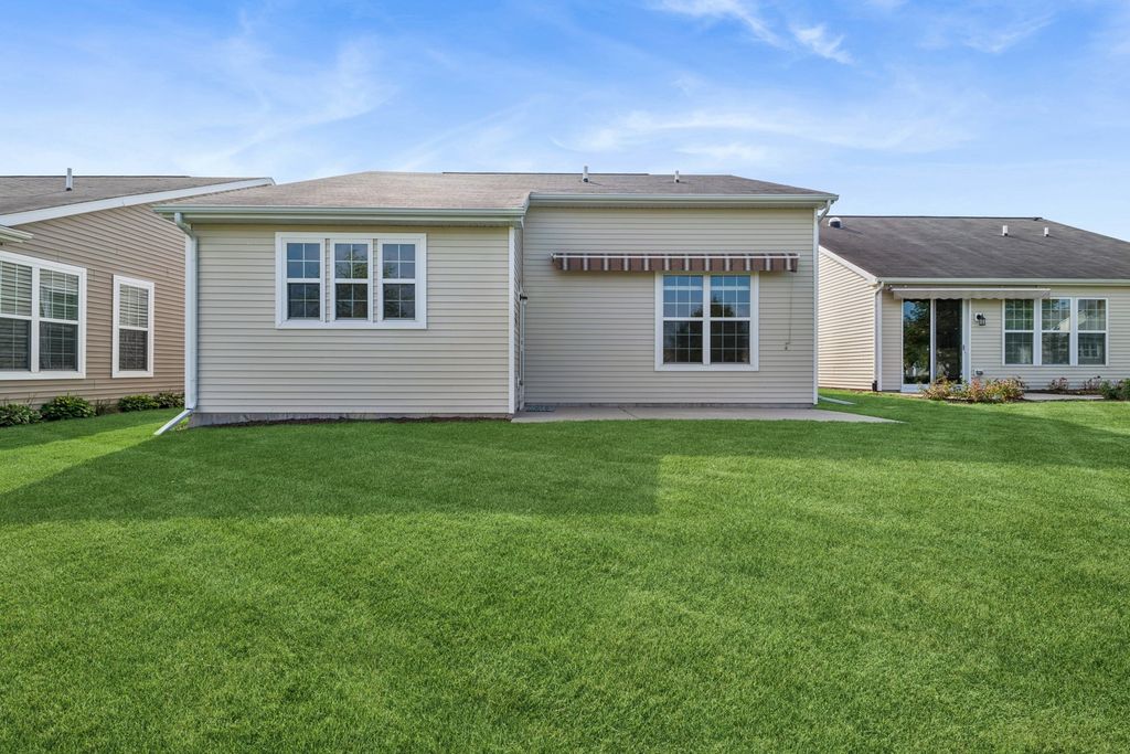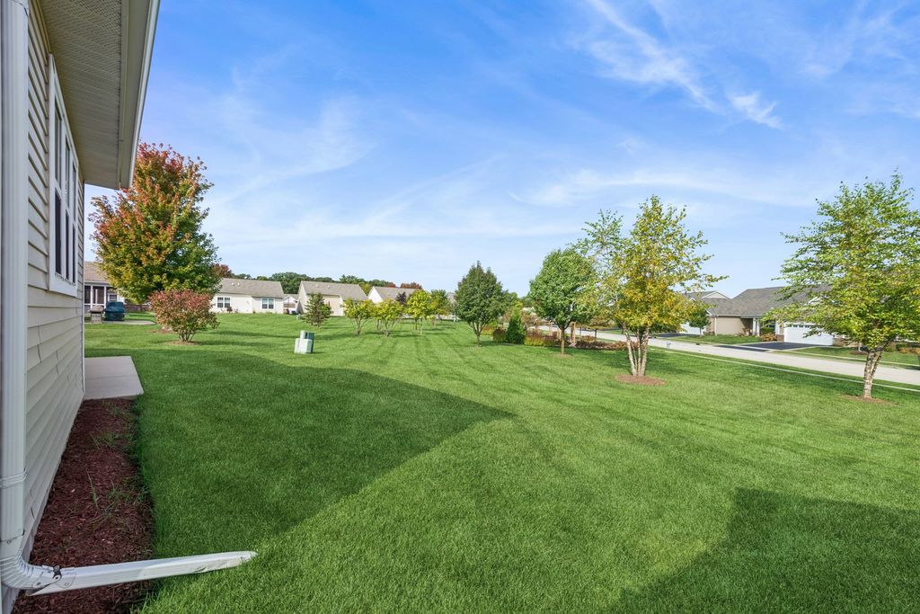 Edgewater by Del Webb* Hard-to-Find PASSPORT Model built in 2015! This model has 2 bedrooms, 2 bath, den, and extra space in 2 car garage for storage or a golf cart! "Premium Lot" with vacant lot with trees and a park behind! WOW! Home is only 10 years "young" so house is working well.Hardwood floors everywhere except bedrooms. Kitchen has granite counters, large island, tall kitchen cabinets, soft close drawers, and a double pantry. Utility room has full size stackable washer and dryer and utility sink. Master bath has two sinks, shower with seat, and linen closet. Quick close possible. Visit Lodge and see the indoor pool, hot tub, outdoor pool, fitness center, billiards room, library, and so much more. Edgewater also takes care of grass and snow and seal coats drive and mulchs beds every other year!This is an Active Adult Community and one resident in home must be at least 55!