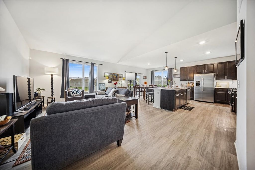 This Siena model is an elegant ranch-style home that features an attached two-car garage, a modern open-concept floor plan, three bedrooms, two full bathrooms, and a full basement. Upon entering the home, the foyer leads you to the family room. To the left are the owner's suite and secondary bedrooms. The Owner's suite features a walk-in closet and private bathroom. Past the foyer, the kitchen, dining room, and family room lay in an open concept for easy entertaining or spending time with loved ones. The modern kitchen features a pantry, beautiful Quartz countertops, ample cabinet space, and a stunning, oversized island with a breakfast bar. This home was built with superior quality. Included when it was newly constructed was top-of-the-line features. The fully appointed kitchen includes Aristokraft cabinets and GE SS appliances. This home also feature 9' first floor ceilings, Decorative Rail, LED surface mounted lighting in the hallways and bedrooms, modern two-panel interior doors and colonist trim, vinyl flooring in the kitchen, foyer, powder room, bathrooms, and laundry room, a garage door opener, 30-year architectural shingles and so much more, all of which is included with your home. This Connected Home by Lennar now provides even more convenience and peace of mind with the Ring Video Doorbell Pro and Alarm Security Kit. The home is wifi guaranteed with no dead spots and include the most desired home features such as Flo by Moen TM Smart Water Shutoff, MyQ Smart Garage Control, Honeywell Home T6 Pro Z-Wave smart thermostat, Level Touch invisible smart lock, Ring Video Doorbell Pro, and Ring Alarm Security Kit. Recently built deck with access from the dining area. West Bay is located just west of Wonder Lake, an 816 acre, 3.5-mile-long private lake that features a private gated entry boat launch, a bird island, Lookout Point Park, walking paths located along and throughout the community. * Tax Year 2024 $11,647 w/Homestead Exemption.