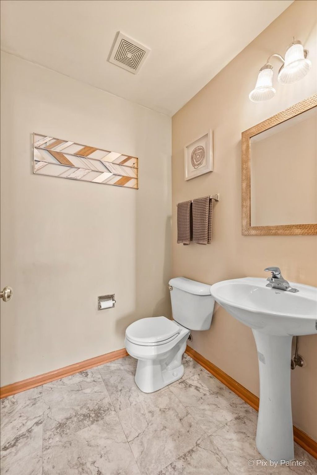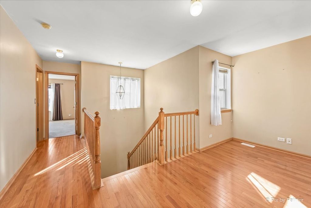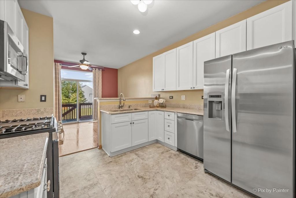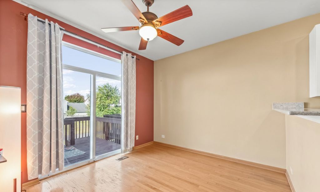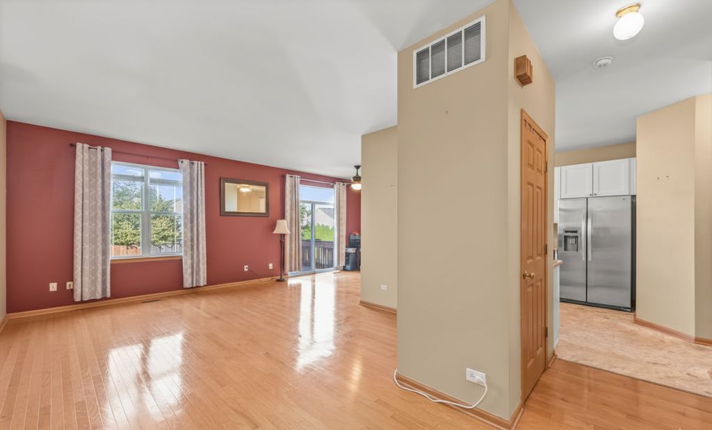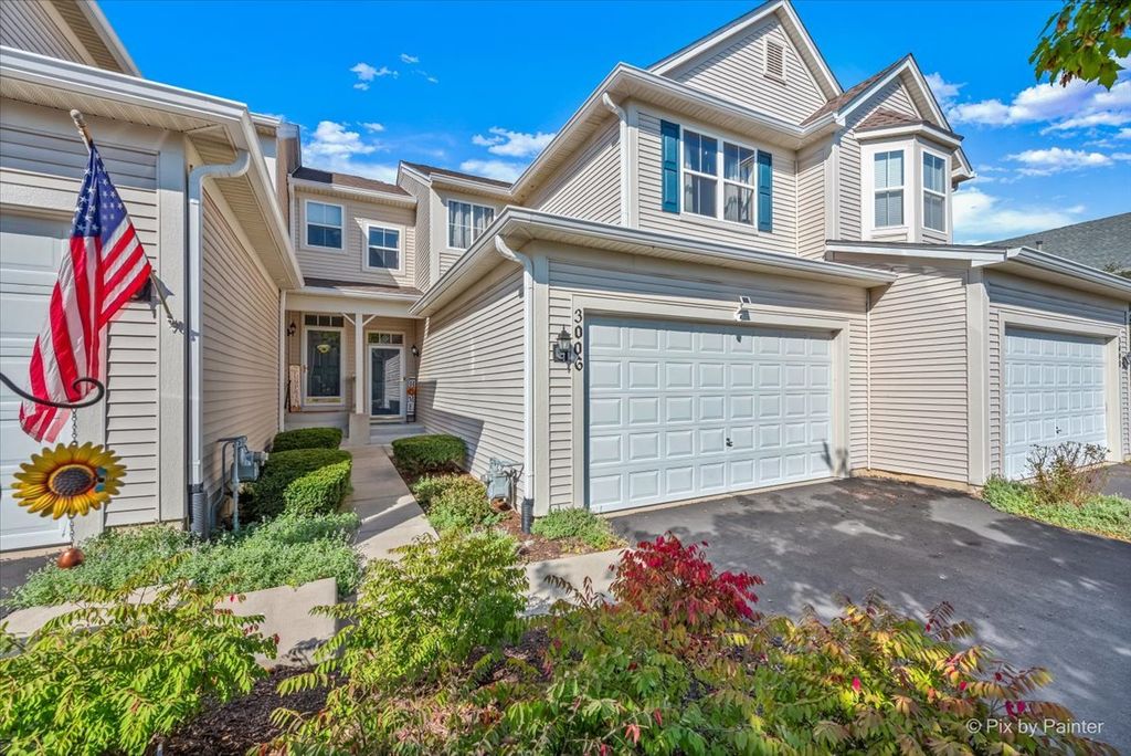 2-story townhome with 3 bedrooms, 2.1 bathrooms, updated kitchen and open green space in the Harvest Hills subdivision. Step through the private entrance into the foyer with adjacent living room featuring tons of natural light and lovely hardwood flooring that flows through the dining area with ceiling fan and glass sliders that lead to the private deck. Updated kitchen with ample white cabinets, quartz counters and stainless steel appliances. A laundry room and powder room complete the main level. Head upstairs to the master suite with volume ceiling and ensuite bath with extended vanity and shower over tub combo. 2 additional bedrooms with sizable closets, full hall bath and loft space round out the 2nd level. Full deep pour walk-out basement is waiting for your finishing touches. Relax on the deck or play in the abundant green space that backs up to walking paths that lead right to Harvest Hills Park with a playground and tennis courts. Nearby endless shopping and dining options.
