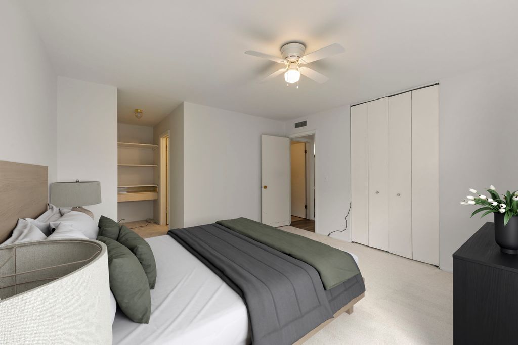 Clean and bright 2 Bedroom, 2 Bath Condo! New flooring and freshly painted throughout! Spacious living room with floor to ceiling bookshelves. Sliding door to patio brings in lots of natural light. Dining area is connected to the kitchen with lots of counterspace and cabinets. Comfortable secondary bedroom perfect for family, guests, or a home office, and is served by its own full bathroom. Primary bedroom suite is large and private. Tons of closet space all over this unit. Unit is conveniently located near the side entrance for easy in-out. Patio is spacious and inviting. HVAC system recently inspected and tuned up. Well-maintained building (no weird smells!) and nice amenities including a pool. Unit comes with 2 exterior parking spaces and there is plenty of guest parking. Nearby to grocery stores, shopping, highway, and Busse Woods for enjoying nature. Association covers gas heat, central air, water, hot water, trash, basic cable & internet, lawn care, snow removal, & parking. Large & clean common laundry rooms on 2nd and 4th levels. Dedicated storage locker on main level. Common Rec Room on 5th level.