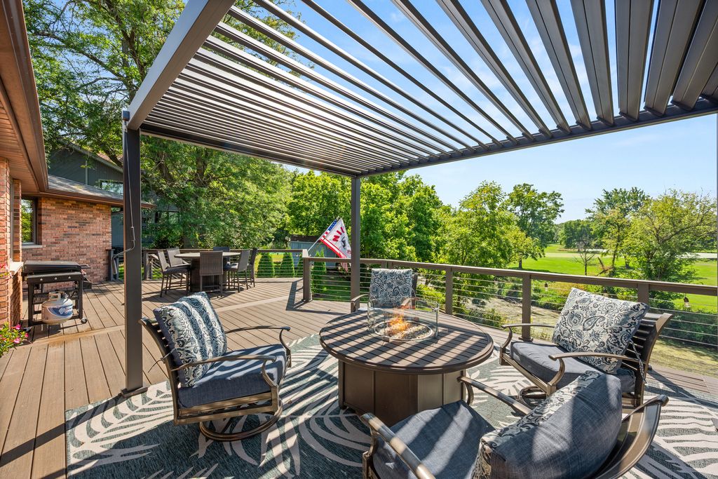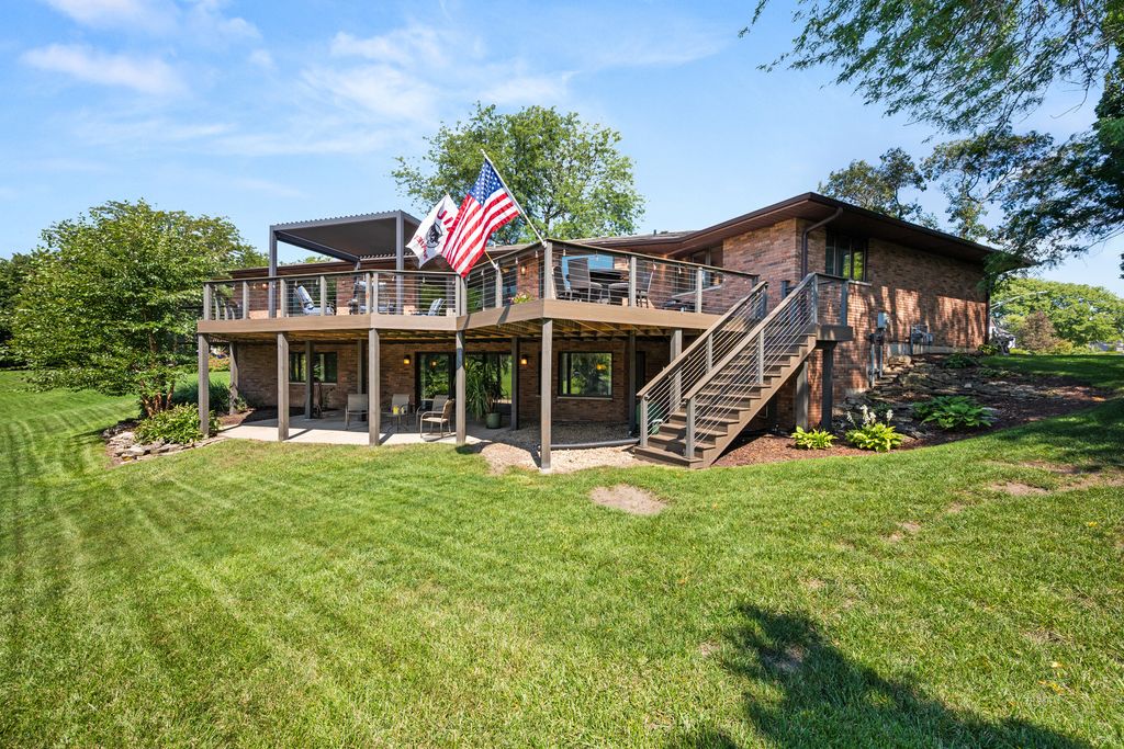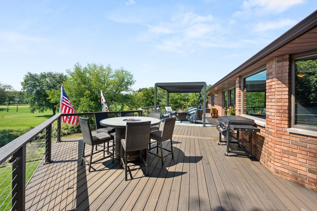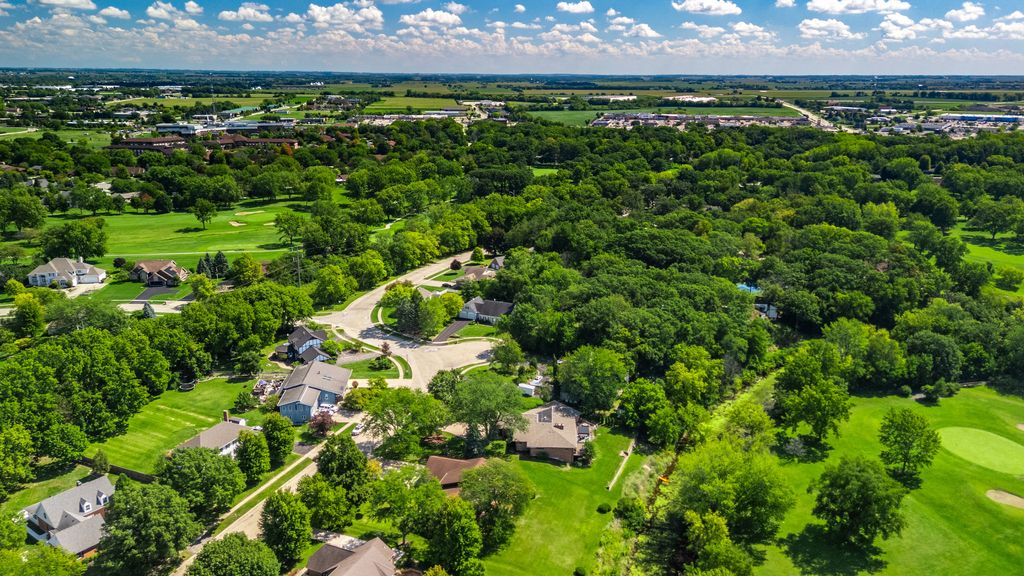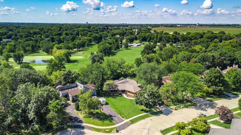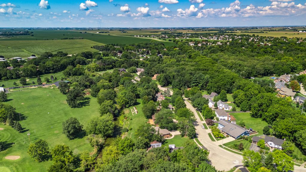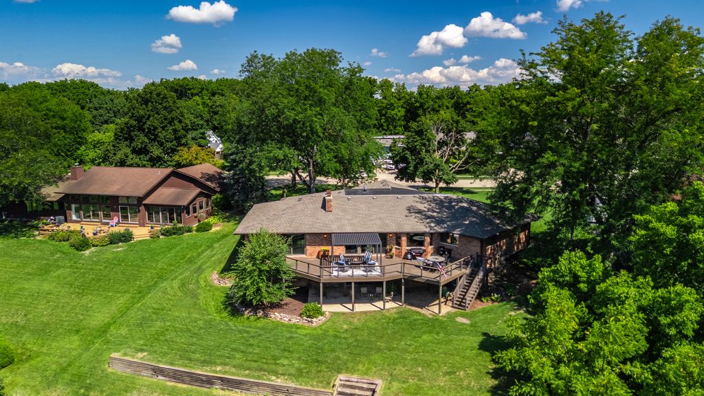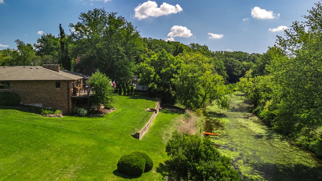 ***Click on spectacular Cinematic Home Tour!*** This timeless all-brick 6,973 sq. ft. ranch home with a "finished walkout basement" showcases an expansive maintenance-free viewing deck! Immerse yourself in nature's beauty while enjoying a serene water view of the Kishwaukee River and views of the Buena Vista Golf Course's holes #1 and #2! This upper-level outdoor oasis is the entire width of the back elevation, capturing a fantastic panoramic view of sunrises, sunsets, nature, water, and the golf course. A Mirado pergola has an operational open and close roof system and a west-facing pull-down shade screen. Black carriage lighting, deck lighting, and cable deck spindles complete this amazing outdoor living space. Step down to the river and gather around the stone fire pit, or take a float in your kayak to explore! The covered front porch welcomes you into the open foyer, showcasing Tigerwood hardwood flooring and a Mission-style staircase to the finished walkout lower level. Step down into a 30'x19' Living Room featuring three Andersen viewing windows, plush carpeting, and 9' ceilings. A gray color scheme unites the Living and Dining Room. Tigerwood flooring continues into the Dining Room with a brushed nickel chandelier. The heart of this lovely home presents an inviting kitchen with black granite countertops and backsplash illuminated with copper flecks, white cabinetry with earthtone green contrasting lower cabinetry, an island, pendant lighting, and a 9' breakfast bar. Wolf gas cooktop, KitchenAid built-in convection oven, Bosch dishwasher, and an eating area with A+ outdoor views complete this chef's delight kitchen. The Family Room boasts a vaulted and beamed ceiling and a floor-to-ceiling majestic stone gas log-lit fireplace. The wide glide Andersen sliding glass door opens to the deck area. Through double doors discover the owner's bedroom suite, presenting deck access, a walk-in closet, and a spa-like bath with radiant in-floor heating, granite vanity tops, a 36" comfort height rich wood vanity, Kohler undermount sinks, and a stunning custom tiled shower with a glass door. A 2nd linen closet and full bath with a comfort height vanity, granite top, 2 sinks, and a tile surround tub/shower are shared by other bedrooms. A signature Tigerwood staircase invites you to an additional level of finished living space, especially designed for entertainment and enjoyment! The dark gray brick gas log-lit 2-way fireplace makes a grand statement, embraced by candle-like sconces and a wood mantle. There is a 2nd family room, a dry bar, a game area including a billiard light fixture, and a dedicated fitness area displaying a rubber floor and mirrors. Wait, there is more! Imagine a 21'x19' home office space hosting a floor-to-ceiling white brick gas log-lit fireplace, black track lighting, and 19' of wall-to-wall bookshelves and cabinetry! A 5th bedroom and a 3rd full bathroom accommodate additional living and guest convenience. This walkout lower level leads you to a covered patio. Abundant landscaping, scenic beauty, and cascading stone embrace this patio space. Two Goodman furnaces, storage, a shop, and a cellar area are a few more features. This bespoke residence is nestled on a .66 acre premier lot with professional landscaping enhanced by direct river access, comes equipped with a 3-car wide concrete driveway, and is located on a cul-de-sac street, near walking and bike paths, golf courses, and mature tree-lined streetscapes. Average utility costs: Nicor gas at $117.00 a month and ComEd at $210.00 a month. Seller Improvements List available upon request. This is an excellent opportunity to LOVE your new HOME and its BREATHTAKING SETTING!