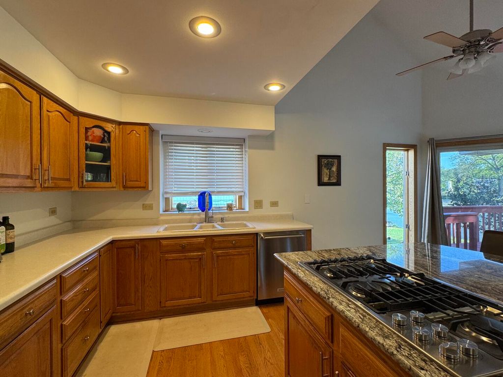 Unbeatable location on a level lake lot close to everything, yet waterfront location seems miles away. First floor master, new AC and water heater, Anderson casement windows, doors and skylights with lots of natural light, 2x6 energy efficient construction, masonry fireplaces, water softener, humidifier. Fisherman's and nature lovers' paradise on the lakefront in Lake in the Hills, with quick access to the best shopping on Randall road in McHenry county with theaters, Home Depot, Costco, Trader Joe's and the Commons Mall right down the road. The location makes it seem like you are in your own private nature retreat with wildlife, birds, beavers, ducks, geese, heron, fish, deer, fishing, swimming, boating and more. Walkout lower level has family room, large bedroom and bath, separate kitchen and laundry; great for a home office or extra rental income. As Is.