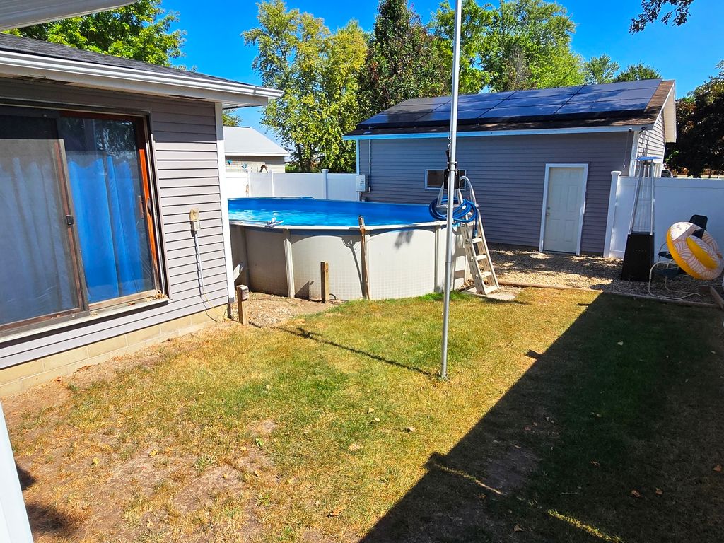 You're looking at a well maintained single story 3 bdrm/2 bath home on a large double corner lot in Chenoa. New roof, gutters and siding in August of 2025. Newer Trane furnace and A/C. The utility/laundry room features a new smart washer/ductless dryer all-in-one combo that you can start/stop from your phone and have alerts sent to your phone and tv when the loads are done!!! Above ground pool and 6 ft vinyl fence is less than 3 yrs old. Solar panels on the roof of the garage are leased and transferrable to the new buyers for a low monthly fee to eliminate most electricity bills. There's an eat-in kitchen with all kitchen appliances staying, nice sized living room, both bathrooms are very nicely updated and lovely french doors leading to the main bdrm. The main bdrm features a gorgeous updated bathroom showcasing a deep corner soaking tub/shower with ceramic surround and walk-in closet. The main bdrm also includes a sliding door that leads out to the enclosed back yard with the above-ground pool. Buyers could add a nice wood deck that leads directly to the pool. This home also features a 2-car insulated garage with storage loft that's wired for 220 amps so you could easily add a heater to the garage. There's more yard space for a firepit or additional parking/storage on the other side of the garage that has 2 older sheds which will remain. Call your favorite Realtor for a showing!! You'll want to look at this home quickly, as it won't last long!!