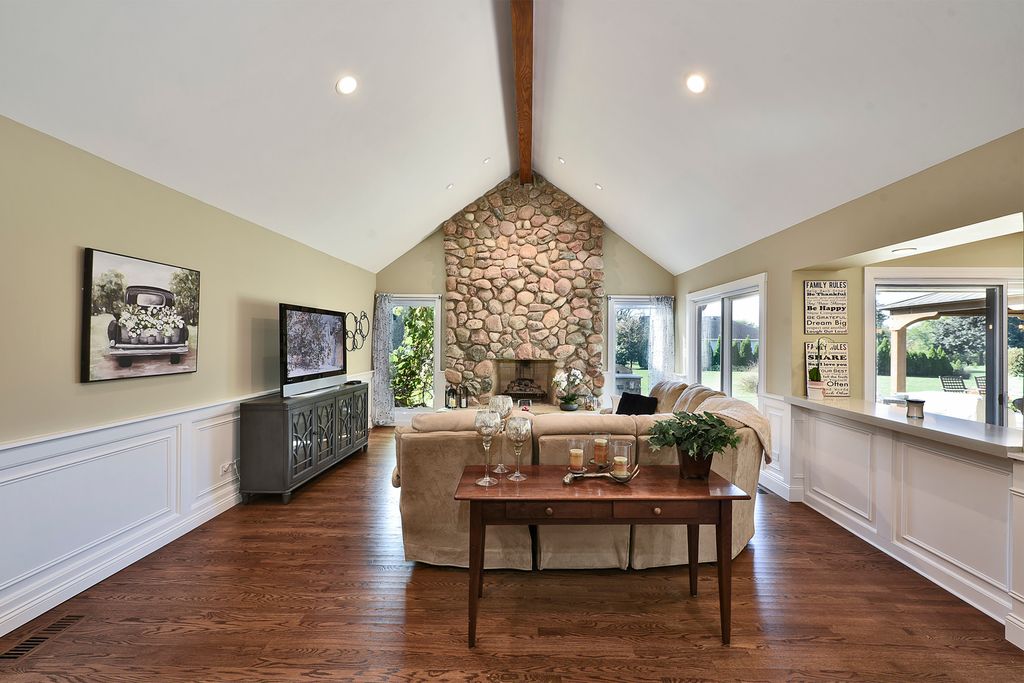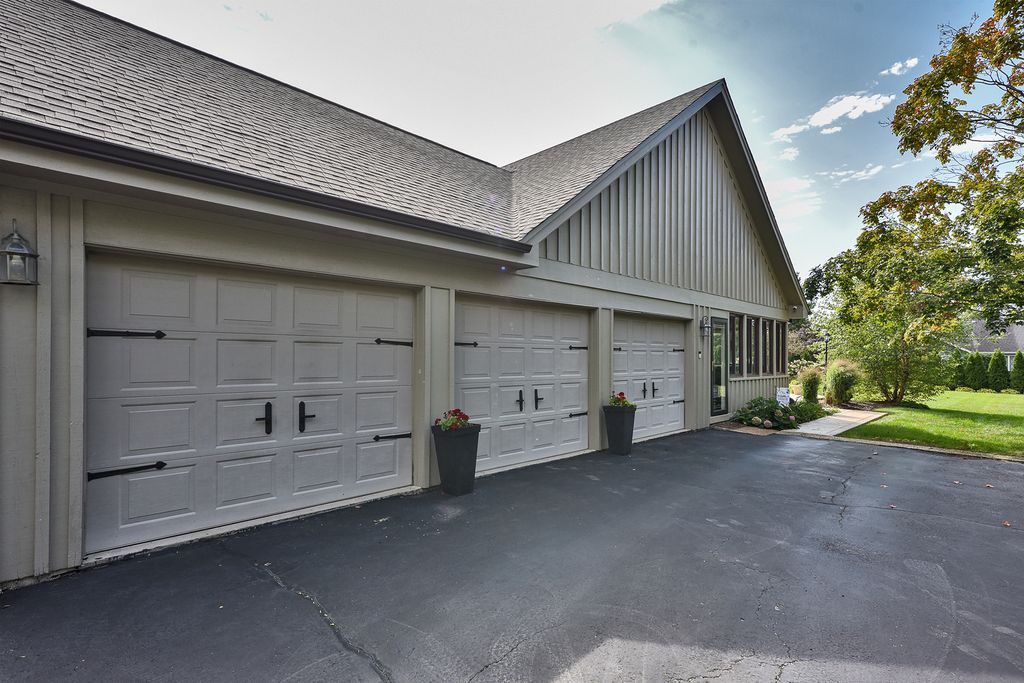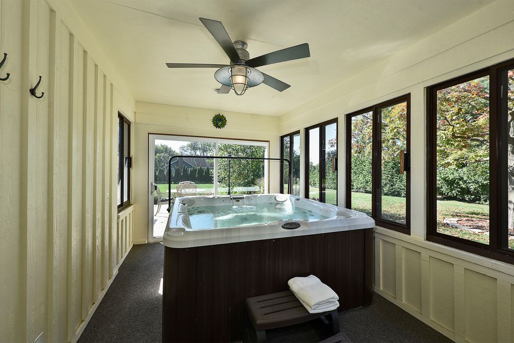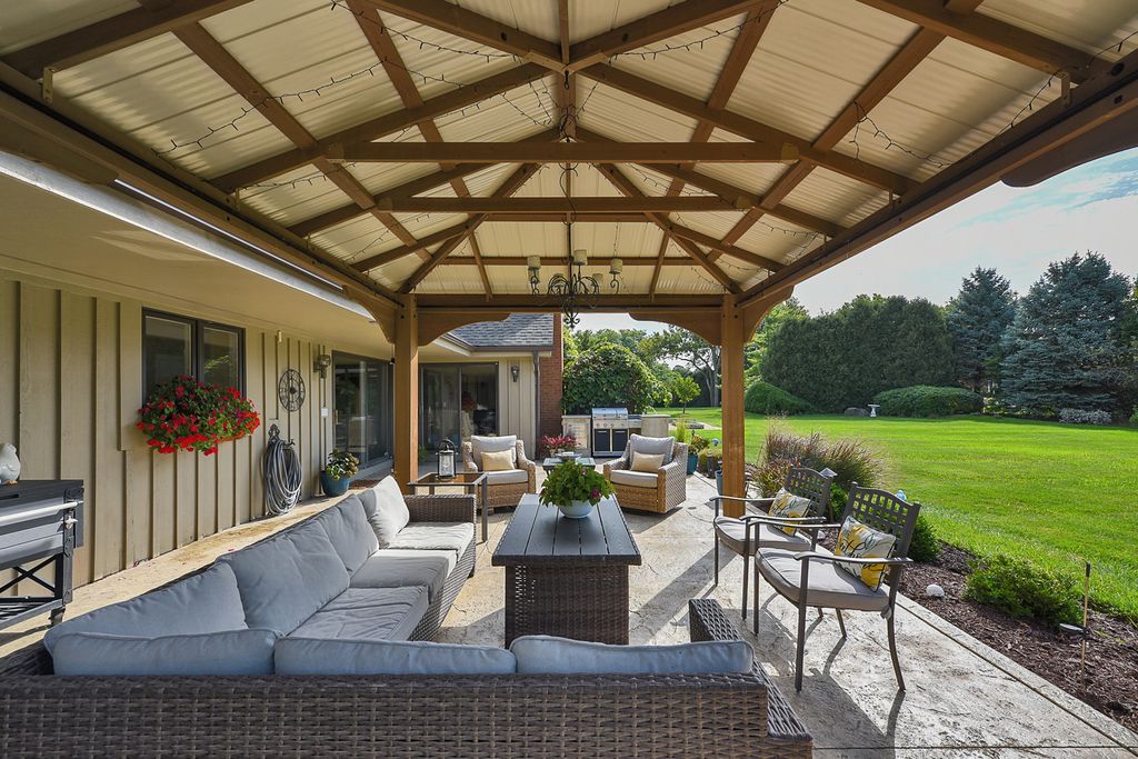 A rare opportunity awaits with this expansive and beautifully appointed four-bedroom ranch, situated in Cheviot Hills subdivision. From the moment you step inside, the welcoming foyer sets an elegant tone. Flanked by the formal living and dining room, it opens to the spacious family room showcasing a dramatic vaulted ceiling, striking stone gas-log fireplace, and a wet bar, all flowing effortlessly into the island kitchen. Here, culinary inspiration abounds with abundant counter space, butcher-block island top, a walk-in pantry and a casual dining area. With seamless access to a sprawling stamped-concrete patio the kitchen stands ready for outdoor entertaining as well. A versatile den provides the perfect home office or study. A charming three-season room, main-floor laundry, and a three-car side-load garage further enhance the home's functionality. All four bedrooms are conveniently located on the main level, including a luxurious primary suite that offers a stunningly remodeled spa-inspired bath. The bath features a double-sink vanity, curbless shower and a freestanding soaking tub. Back in the bedroom, a sliding door opens to a secluded patio, ideal for morning coffee or quiet reflection. The impressive lower level continues to elevate the living experience with impressive nine-foot ceilings, a generous recreation area, a stylish bar/kitchen space with countertop seating, a beautifully finished full bath, dedicated exercise room, and an additional office area. Stepping outside, you will discover a backyard sanctuary. These are meticulously landscaped grounds with lush green space, a covered patio area, built-in grilling station, and a hot tub accessible both from here or inside. This area has been designed for effortless entertaining and personal enjoyment. Properties of this quality, scale, and sophistication are increasingly rare and highly coveted. Don't miss the chance to make this extraordinary home your own.