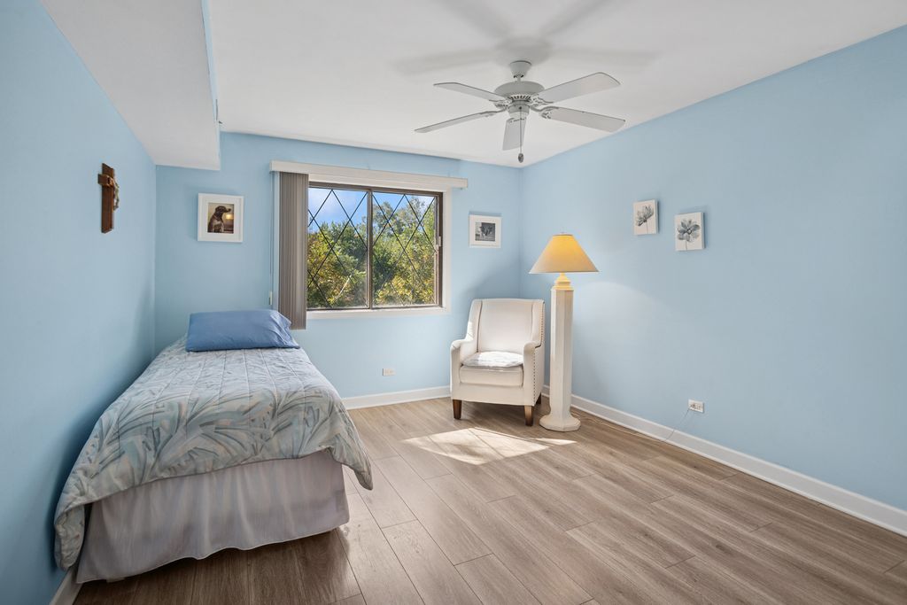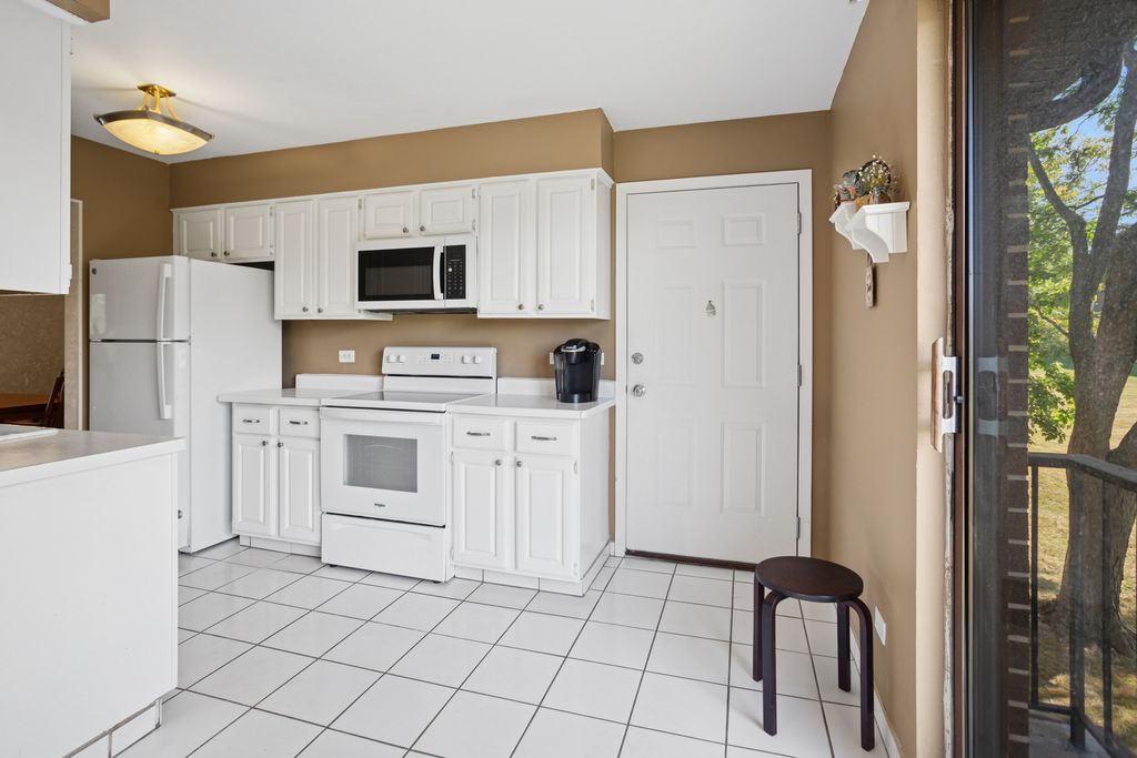 Fantastic, move in ready condo. This two bedroom, two full bath comes with one car garage and one assigned exterior parking spot. Large balcony overlooks the beautiful courtyard with trees and flowers. Extra storage garage off of patio.Back slider overlooks private green area. Beautiful newer vinyl single plank flooring. Super large living room with electric fireplace. Large dining area with built-in buffet and dry bar. In unit, laundry with newer washer and dryer. Spacious kitchen with eating area, lots of cabinets, beautiful views and pantry. Two large bedrooms. Master bedroom is nice and bright with ceiling fan and private master bath. Front and back entrances. Plenty of visitor parking,close to interstate, downtown Elmhurst and a quick trip the airport. why rent when you can own.