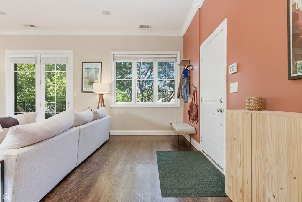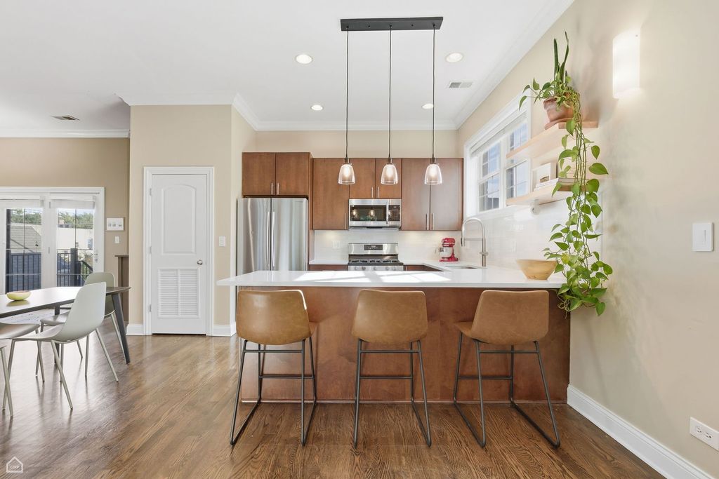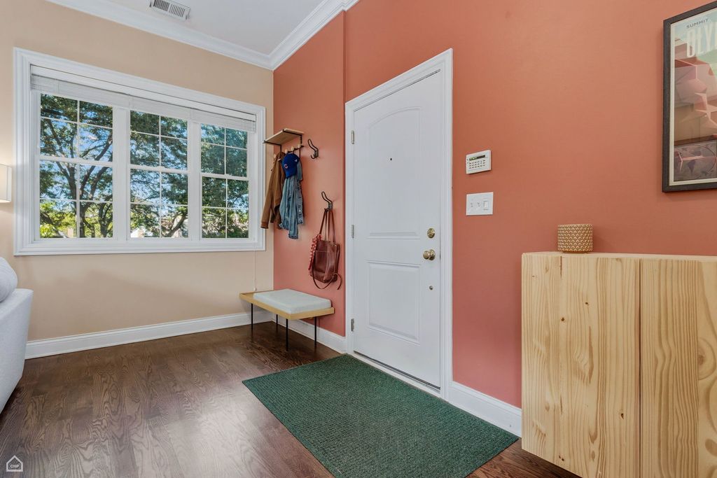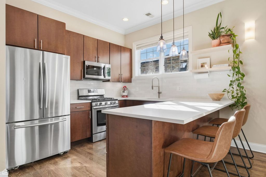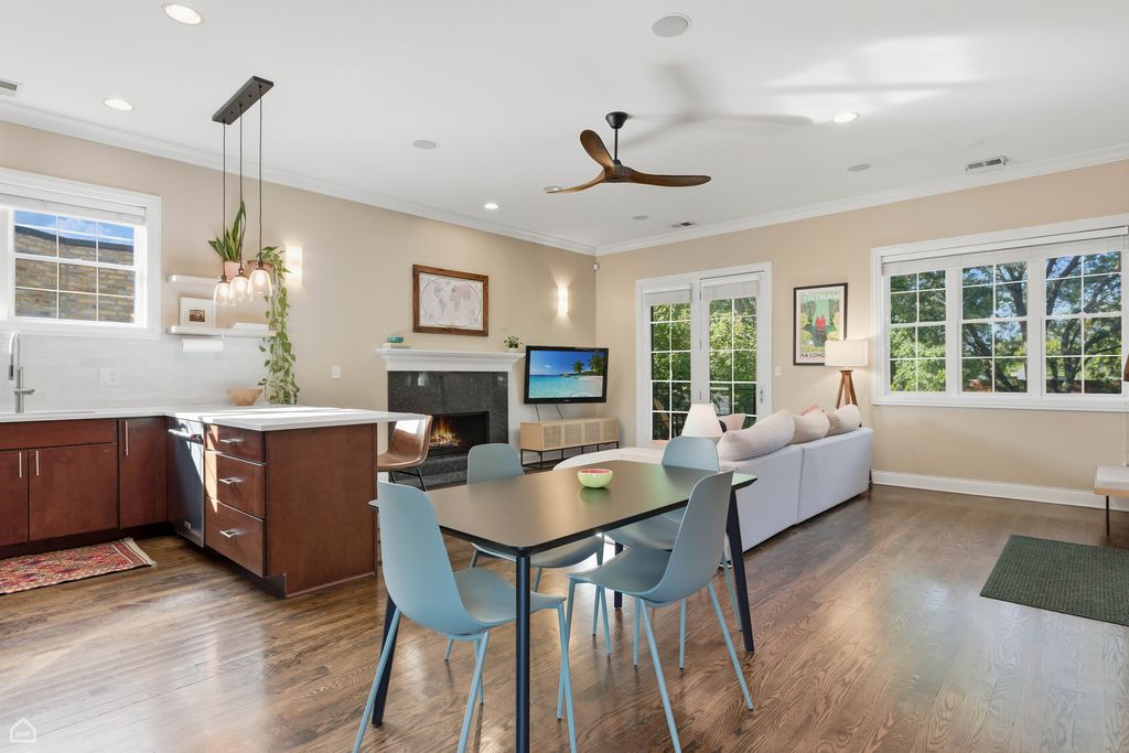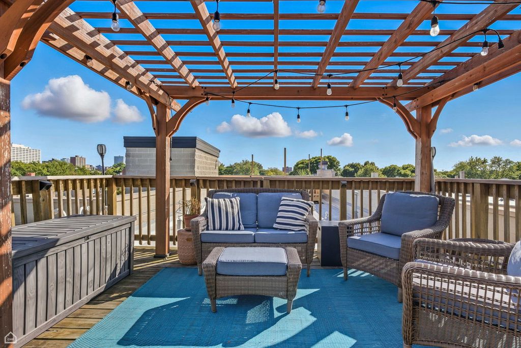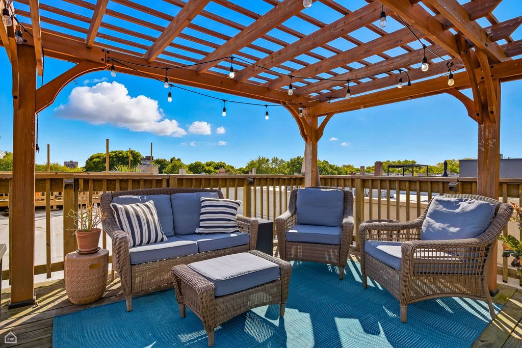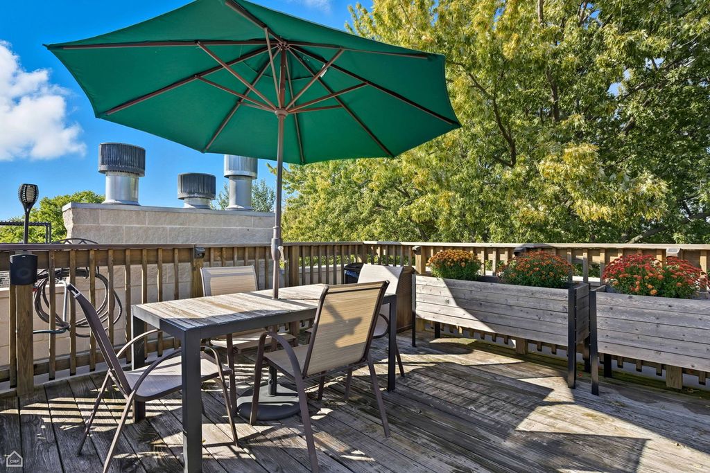 Spacious & bright, 2 bed, 2 bath Andersonville penthouse, perched among the trees with private roof deck! This intelligently designed home features a stunning great room with 10-foot ceilings: handsome kitchen with rich cabinetry, crisp white quartz counters, stainless steel appliances & breakfast bar, connected to dining area and large living room (with wood burning fireplace) plus a private balcony - the first of 3 outdoor spaces. The real star is the private roof deck - 1 flight up, with tree-top views and plenty of space for outdoor fun. Movie Night? Check. Dinner Party? Check. Sunbathing? Check! The list goes on! Back inside, enjoy king-sized primary suite with large, organized walk-in closet and attached bath with double sinks and shower with body sprays. There's also a sizable guest bedroom that easily fits a queen-sized bed, and with large window is perfect as a home office combination, with adjacent full bath for your guests. Bonus coffee bar area (with dual wine & beverage fridge) off the kitchen leads to your grilling balcony & rear stairs, that take you to your assigned parking space and basement storage unit. Hardwood floors, crown molding, central air/heat plus in-unit laundry complete this well-maintained home. A+ location convenient to brand-new CTA Red Line stop and Clark Street dining/shops/nightlife, with easy access to gyms, coffee shops, Lake Shore Drive/lakefront...everything that makes Andersonville one of the best neighborhoods to call home!
