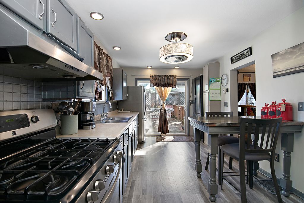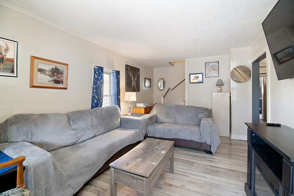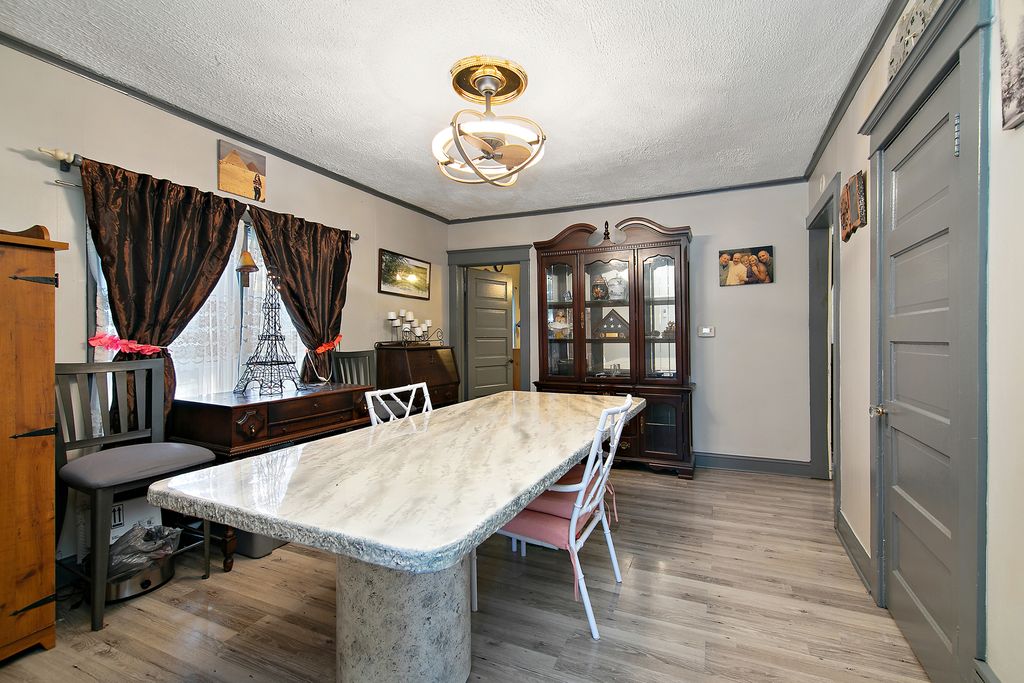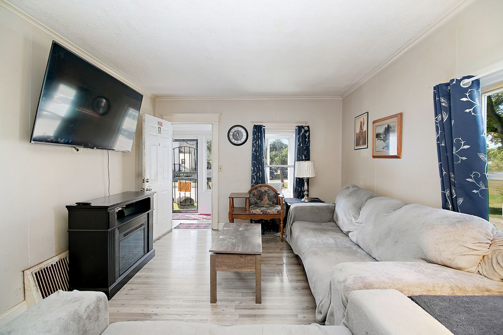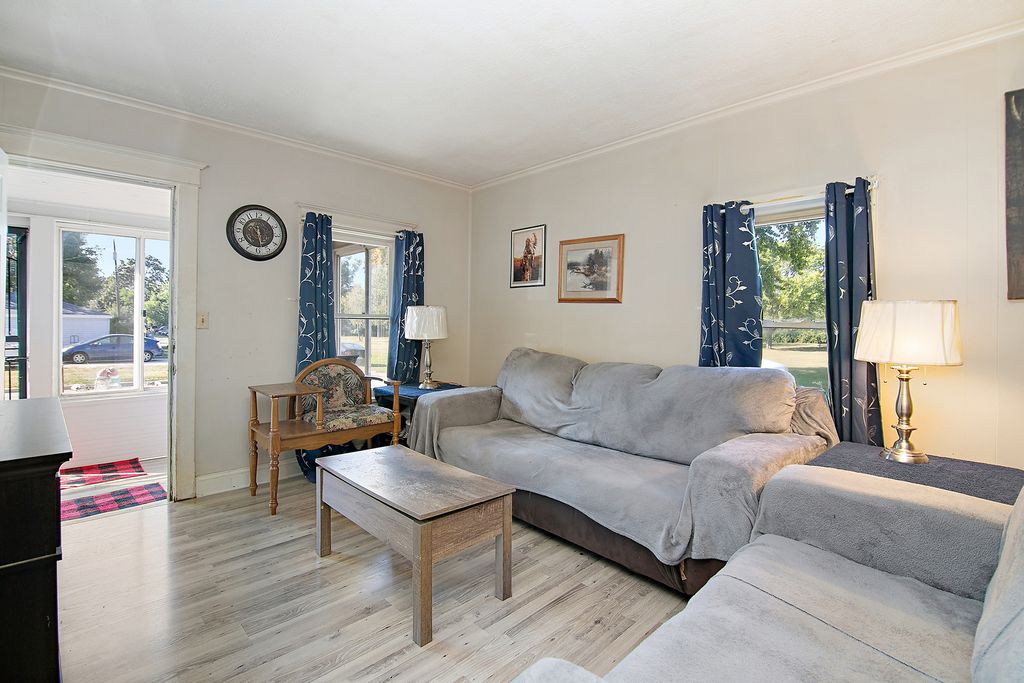 Charming and Move-In Ready Home on a Private Corner Lot Next to Scenic Legion Park! This beautifully updated home offers an unbeatable location adjacent to Legion Park and the river, with access to walking paths, benches, fishing spots, and a sandbar-perfect for outdoor enjoyment. Relax in the enclosed front sunroom with peaceful views, or step inside to a spacious main floor featuring a large living room, formal dining room, full bathroom, bedroom, kitchen, and convenient laundry area. The home was tastefully updated in 2019 with wood-look vinyl plank flooring, fresh paint on doors and trim, modern light fixtures, and an updated kitchen with painted cabinetry, stainless steel appliances, and a sliding glass door that opens to a lovely deck, brick paver patio, and private fenced yard. Upstairs offers two generously sized bedrooms. The full, unfinished basement includes a newer furnace and hot water heater (2019). Major updates also include new siding, roof, A/C unit, and select windows (2019). Don't miss this opportunity to own a charming, updated home in a serene and convenient location!