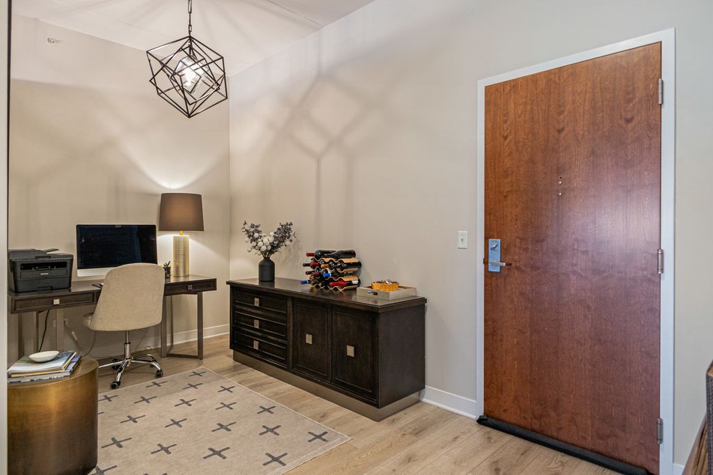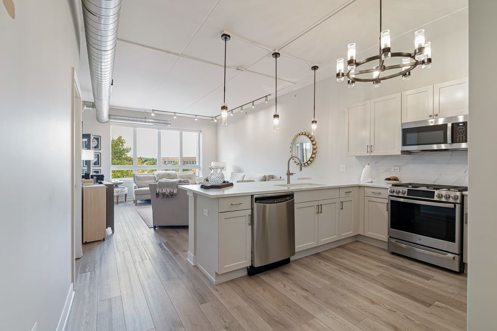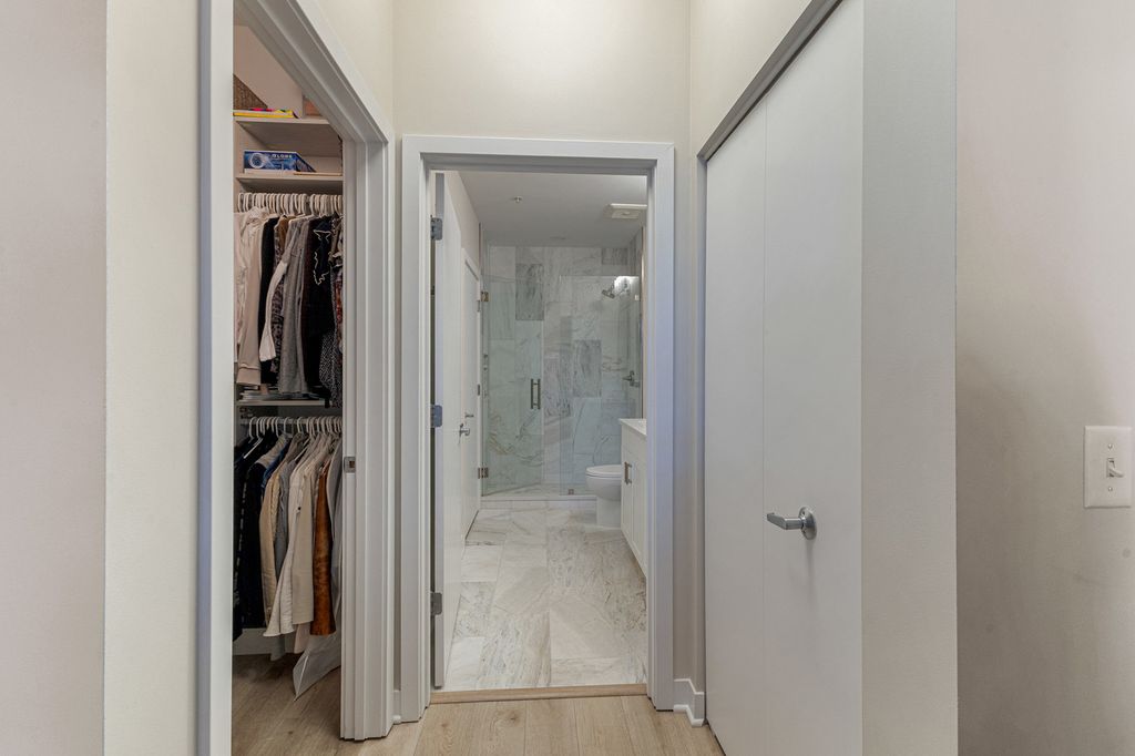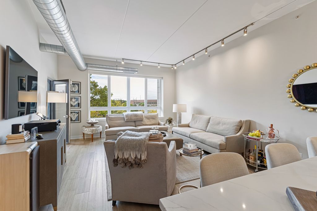 MOVE RIGHT IN TO PERFECTION IN THE POPULAR 450 VILLAGE CENTER. THIS MODERN AND CHIC UNIT FEATURES 10 FT CEILINGS, OVERSIZED WINDOWS, 1 BEDROOM AND A DEN, GREAT STYLE, CONVENIENCE AND LOCATION. STUNNING WITH A REDONE KITCHEN, SLEEK SINGLE PIECE QUARTZ COUNTERTOP AND QUARTZ BACKSPLASH, NEW HIGH END STAINLESS APPLIANCES, HUGE ISLAND FOR CASUAL DINING. NEW RICH LVP FLOORS, FRESHLY PAINTED, NEW ELECTRIC BLINDS AND CUSTOM WINDOW TREATMENTS, IN UNIT LAUNDRY, NEW SMART THERMOSTAT, AND NEW LIGHTING. OPEN CONCEPT LIVING SPACE INTEGRATES KITCHEN AREA, DINING AND LIVING ROOM. THE CONDOS DEN CAN BE USED AS A SPARE BEDROOM, OFFICE OR DINING ROOM. THE GENEROUS SIZED PRIMARY SUITE INCLUDES WALK-IN CLOSETS WITH CUSTOM ORGANIZERS. A BRAND NEW, UPSCALE EN-SUITE MARBLE BATHROOM WITH AN OVERSIZED GLASS ENCLOSED SHOWER. THERE'S A LARGE COVERED BALCONY WITH ACCESS FROM LIVING ROOM AND PRIMARY BEDROOM, PERFECT FOR YOUR MORNING COFFEE, WITH AN ENJOYABLE VIEW OF THE ACTIVE VILLAGE CENTER. HEATED PARKING AND STORAGE CLOSET ARE INCLUDED. SECURE ELEVATOR BUILDING. SHOWS LIKE A MODEL.