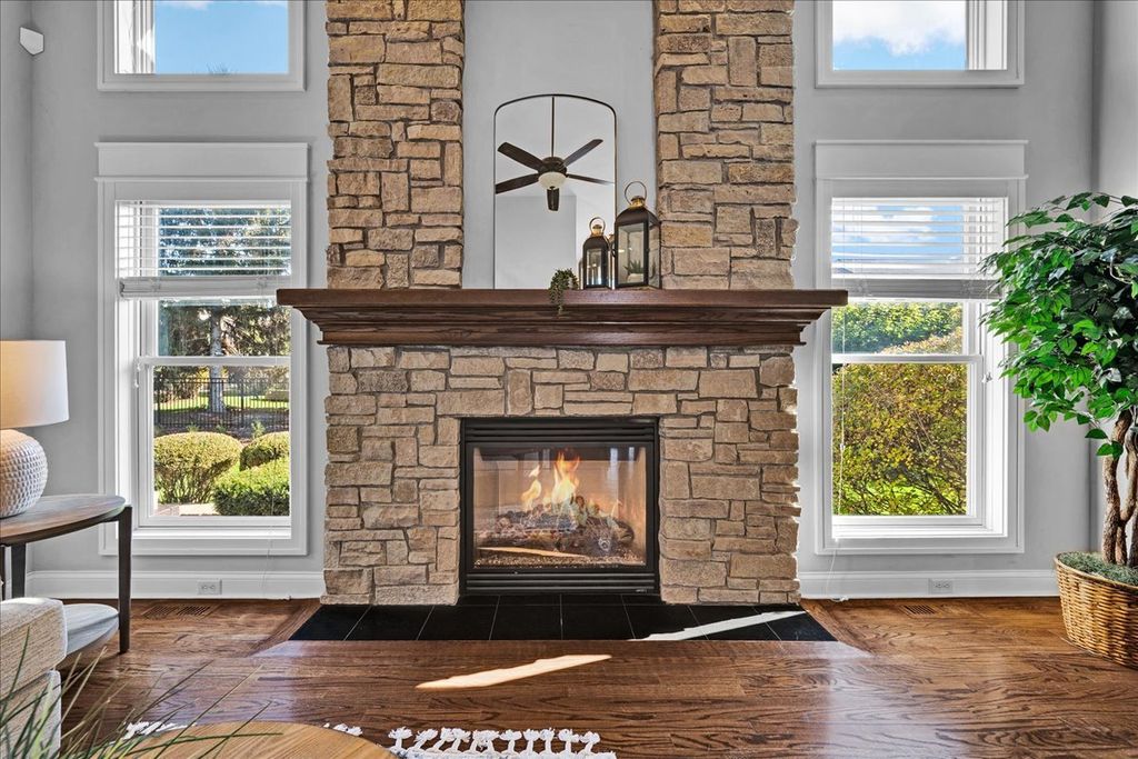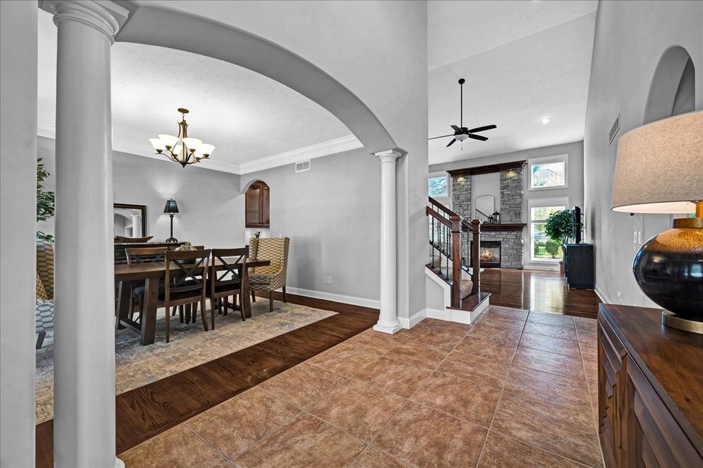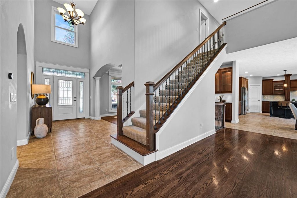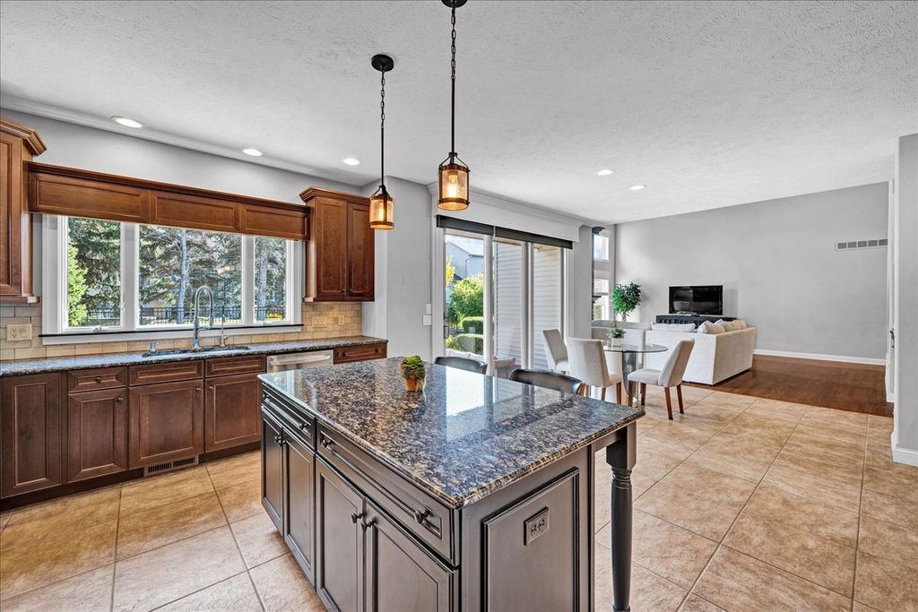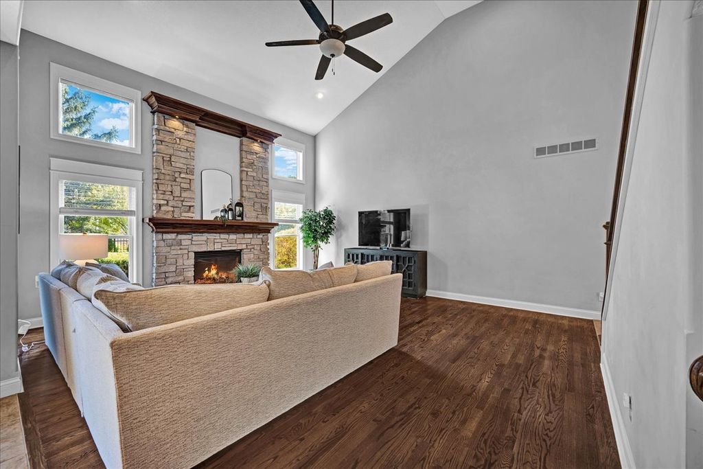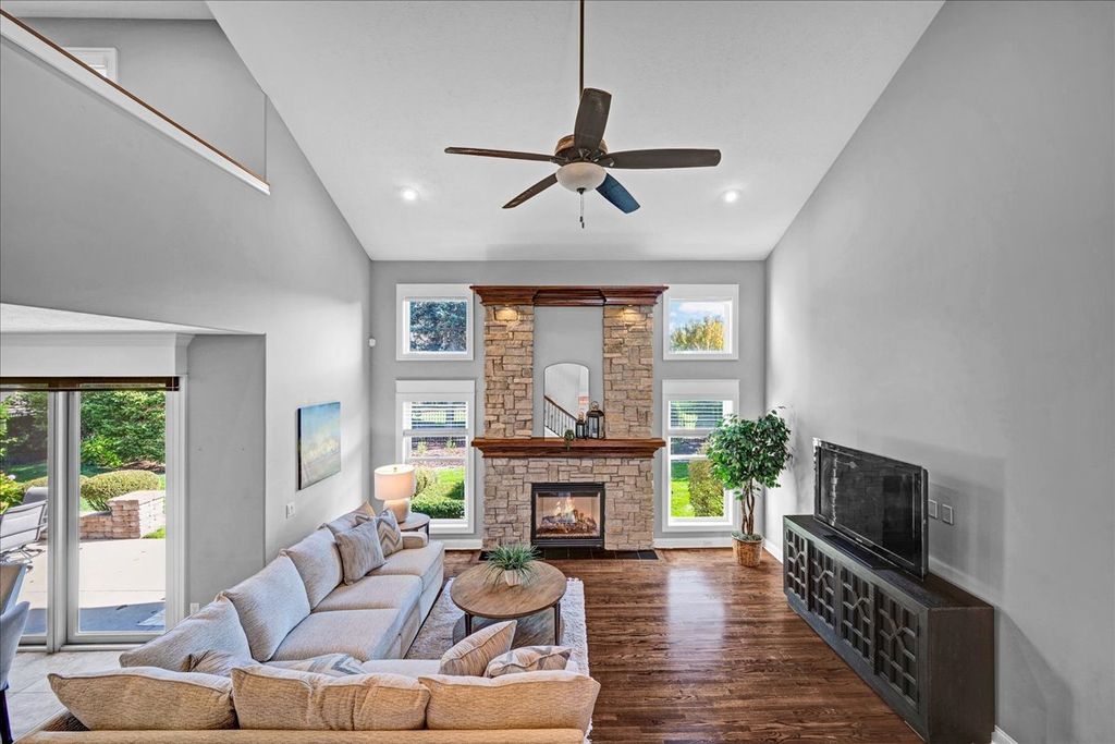 Step into timeless elegance with this stunning custom-built 1.5-story luxury residence, ideally located in the prestigious Royal Links subdivision. Home highlights and recent updates: high-end Anderson windows throughout, new Whirlpool Smart capable front load washer and dryer Oct 2023, Central Vac system, New Goodman high efficiency furnace 2023, New high efficiency Goodman .96 AC 2023 & air ducts cleaned 2023, New 5' Steel fence for backyard that's rust-resistant steel 2024, new updated sprinkler system includes new pump and new sprinkler heads in front and backyard 2023, new reverse osmosis, whole house water filter and Halo ion water conditioner purchased 2023. Every detail of this meticulously maintained home exudes sophistication-from the soaring two-story foyer and grand formal dining room with architectural columns, to the expansive great room showcasing a dramatic floor-to-ceiling stone fireplace framed by oversized Anderson windows. Designed for both everyday living and elevated entertaining, the chef's kitchen features an oversized island, granite counter-tops, custom 42" soft-close cabinetry, designer tile backsplash, high-end GE Profile Refrigerator, wall oven and Microwave oven. LG low-decibel dishwasher, and a reverse osmosis system (2025), all flowing seamlessly into a spacious walk-in pantry and triple Anderson sliding door. For your added comfort, the heating and cooling is zoned allowing you to adjust the temperature on the upper, main and basement levels of the home separately. The main-floor master retreat impresses with cathedral ceilings, a luxurious en-suite with jetted tub, tiled shower, double vanities, ambient lighting, and a generous walk-in closet. Upstairs offers three additional bedrooms, a full bath, and a versatile area ideal for a home office or relaxation lounge. The fully finished basement level has 9" ceilings throughout and is an entertainer's dream-complete with a sleek wet bar, theater room pre-wired for surround sound and projector, a 5th bedroom, full bathroom, as well as has an expansive family room. Outdoor living is equally refined, with a professionally landscaped backyard, a rust-resistant steel fence, brand-new sprinkler system with new heads and pump, large patio with elegant paver walls, and space for children to play under a canopy of mature trees. This home is the perfect blend of luxury, comfort, and modern convenience.