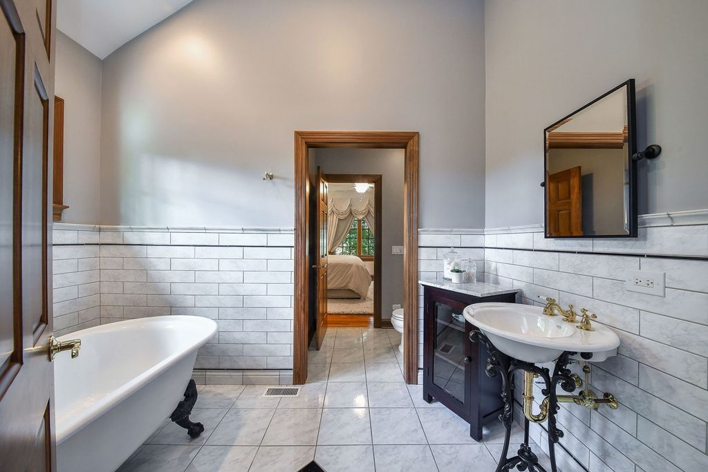 Custom-built with timeless design and a perfect floor plan, this stunning all-brick Georgian-style residence is nestled on a quiet cul-de-sac in the heart of Wheaton. Situated on one of the largest lots in the neighborhood-nearly half an acre (.46 acres)-this home offers serene privacy while nestled in close to Chicago Golf Club. From the moment you enter, you'll be captivated by the architectural elegance and thoughtful layout that make this home ideal for both everyday living and grand-scale entertaining. The dramatic foyer features a soaring ceiling and is flanked by a formal living room and dining room, each with its own gas fireplace and refined ambiance. A richly paneled main floor library with coffered ceilings and built-in bookcases provides an ideal space for working from home or enjoying a quiet retreat. The expansive family room boasts a vaulted ceiling and a striking floor-to-ceiling brick fireplace, flowing seamlessly into the gourmet kitchen. Designed with high-end appliances and ample workspace, the kitchen also features a sunlit sitting area-perfect for morning coffee or unwinding at the end of the day. Just outside, a bluestone patio with built-in grill, burners, and beverage fridge extends your living space, ideal for alfresco dining and entertaining. The beautifully landscaped backyard is a true sanctuary, complete with lush vegetation, a crushed granite walking path, a second bluestone patio, limestone retaining walls, and elegant built-in planters. Upstairs, all bedrooms are generously sized with custom built-in closets. One bedroom features an ensuite bath, while the luxurious primary suite offers two large walk-in closets, an in-room laundry area, and a spa-like marble bathroom with walk-in shower, jetted tub, dual vanities, and a private water closet. The English-style basement offers 2,415 square feet of unfinished space with large windows and plumbing already in place for a full bathroom-providing incredible potential for future customization. A spacious 3-car garage and an expansive driveway offer ample parking for family and guests. Lovingly maintained by the original owners, this remarkable home is now ready for its next chapter. Don't miss this rare opportunity to own a truly exceptional home in one of Wheaton's most sought-after locations.
