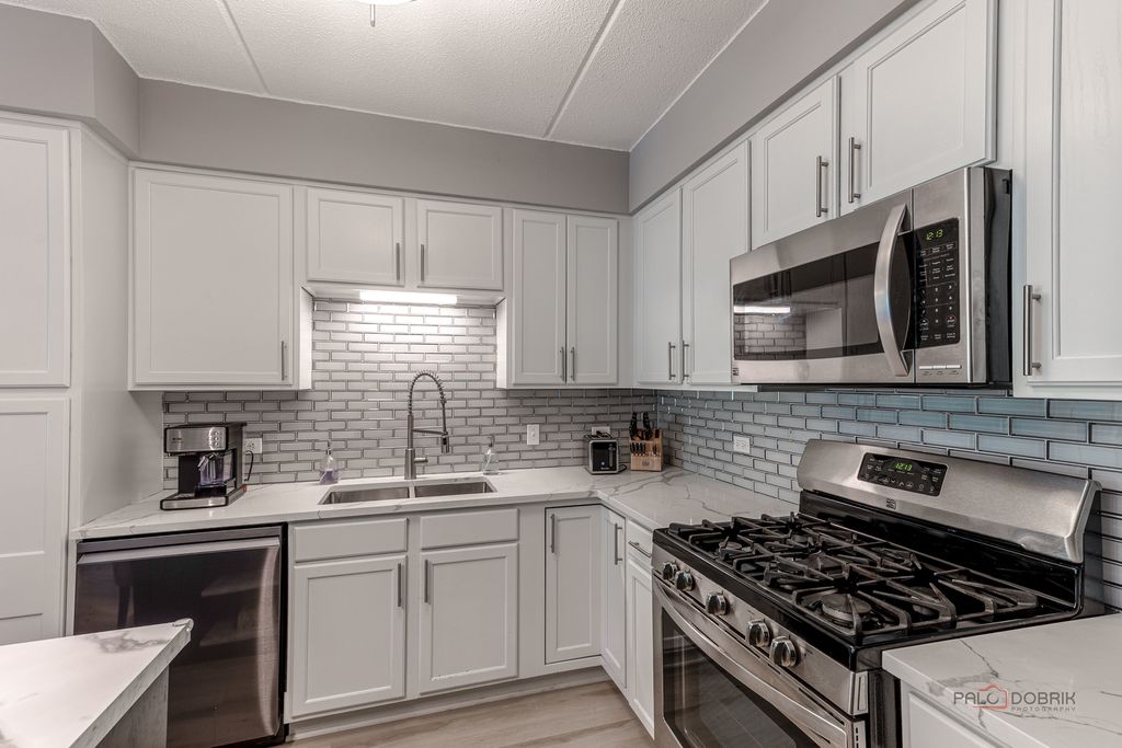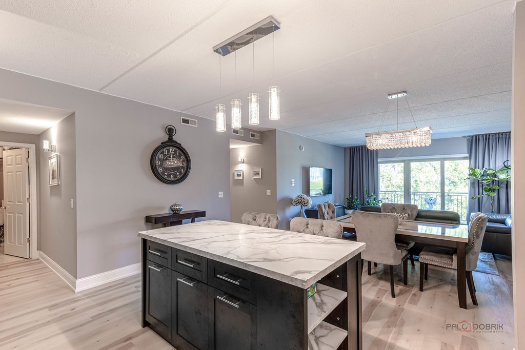 Modern and sleek unit with a white and gray color palette in the desirable Bryn Mawr complex. The kitchen features high-end appliances including a smart refrigerator, quartz countertops, a center island, and an open layout that flows into the living space with luxury vinyl flooring in a hickory wood pattern. Large bedrooms with plenty of closet space, an updated bath, in-unit laundry, and a private 5th-floor balcony add comfort and convenience. Heated garage parking with additional storage included. Close to a park with walking trails and just a short walk to the Blue Line. Nothing to do but move in!
