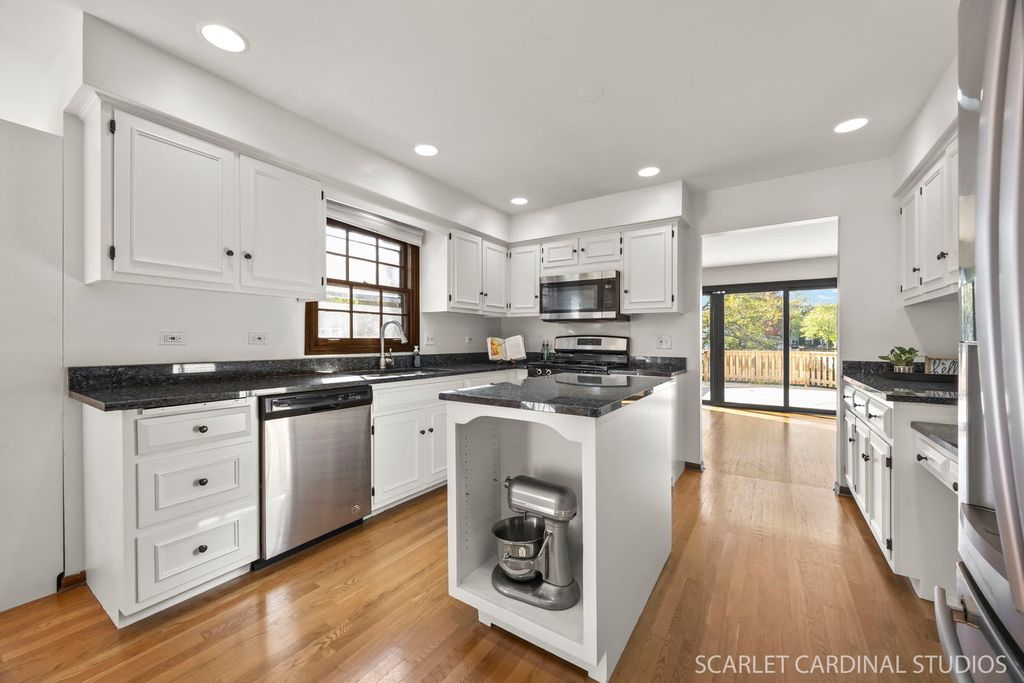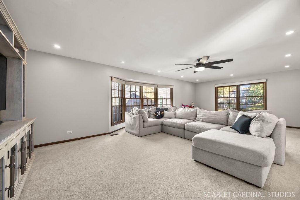 Spacious and inviting 4-bedroom, 2.1-bath home in the highly sought-after Pembroke Greens subdivision, featuring a finished basement and numerous updates throughout! The expansive family room welcomes you with a large bay window that fills the space with natural light. The updated kitchen boasts white cabinetry, granite countertops, stainless steel appliances, a pantry, and an adjacent eating area. The dining room features a cozy masonry fireplace and sliding doors leading to the back deck, perfect for entertaining or relaxing. A main-level office/den (currently used as a 5th bedroom), powder room, and dedicated laundry room add functionality and convenience. Upstairs, the spacious primary suite offers an updated en suite bath and generous walk-in closet. Three additional bedrooms with large closets and a full hall bath complete the second level. The finished basement expands the living space with a versatile recreation and game area. Outside, enjoy a large yard with a freshly refinished deck, ideal for outdoor gatherings. Additional highlights include neutral paint throughout, updated bathrooms, solid 6-panel doors, new carpet in the family room and stairs, newer mechanicals, and an extended driveway with ample parking. All of this in an unbeatable location near Downtown Naperville, Metra, I-88, shopping, dining, and multiple grocery options, plus highly rated Naperville 203 schools: Prairie Elementary, Washington Junior High, and Naperville North High School. Don't miss this exceptional home!