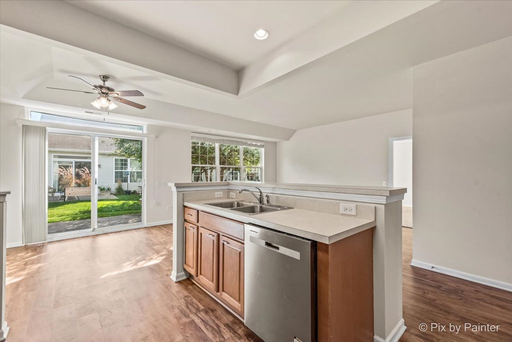 Welcome to this beautifully updated townhome, ready for immediate occupancy. Enjoy single-level living with fresh interior paint, new luxury vinyl plank flooring throughout common areas, professionally cleaned carpeting in bedrooms, new refrigerator, new stove, and new dishwasher in kitchen. The open-concept great room design is ideal for everyday living and entertaining, allowing you to stay connected with family and friends throughout the space. The primary suite features a generous walk-in closet and a private bath with double vanity and a two-person shower complete with built-in seating. All the hard work and expense have already been taken care of and ready for new homeowners. The backyard offers peaceful views, providing a sense of tranquility. Relax on your semi-private patio and take in the serene surroundings. Experience the Del Webb lifestyle in this 55+ active community with access to incredible amenities including golf, fitness, swimming, fishing, tennis, dining, crafts, card games, and more. Don't miss this wonderful opportunity to make this clean and stunning home yours!