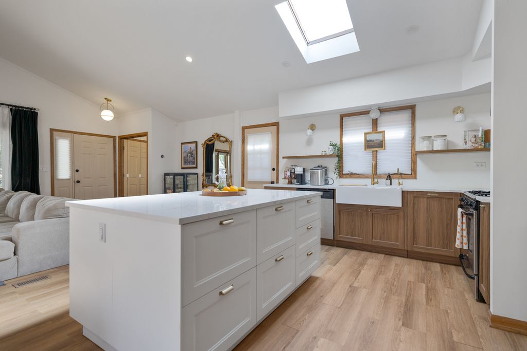 Start your next chapter here! You will fall in love with this brick split level home in the Big Oaks neighborhood in Chicago with 3 bedrooms, 3 full bathrooms, finished basement and 2 car detached garage. Lots of natural light throughout. The updated open concept living/dining area has a large bay window and vaulted ceiling and opens to the kitchen with skylight, wood cabinets with plenty of storage, quartz countertops, a large island, ss appliances and recessed lighting. Wood laminate flooring throughout the main level. Three good-sized bedrooms with hardwood floors on the upper level including the primary bedroom with ensuite. The finished basement has a family room with wood-burning fireplace, full bathroom, laundry w/ sink and utility room. Fenced backyard with deck is perfect for summer bbq's. Recent updates include: remodeled kitchen and main living room (2024) and furnace. Great neighborhood close to I-90, located near schools, shopping, restaurants, parks, forest preserves, transportation including O'Hare and so much more!! Don't miss out!!!
