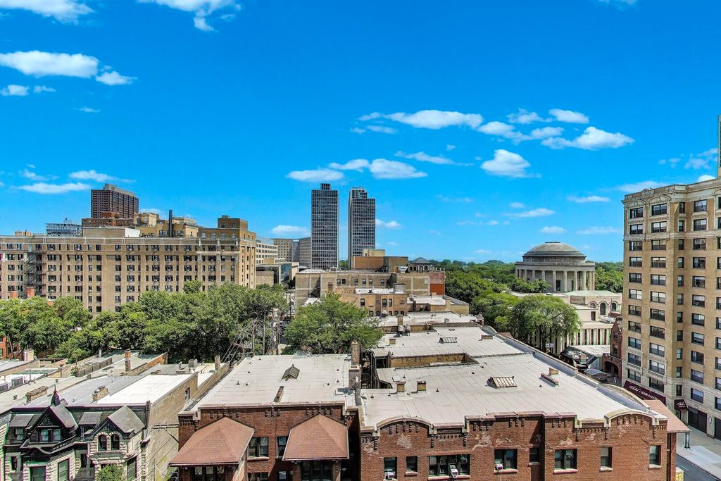 Iconic Landmark Living in Lake View East - Perched on the top floor of the historic Brewster Building, this completely remodeled 2-bedroom, 1-bath condo blends timeless charm with sophisticated modern updates. Soaring 10-foot ceilings and sunny eastern exposure fill the space with natural light, offering glimpses of Lake Michigan and surrounding architectural treasures. The stunning open-concept kitchen is a showstopper-featuring a full Bosch appliance suite, Quartz Calacatta Montage countertops, Studio41 Omega custom cabinetry, undermount lighting, and a vented hood/range. The spa-like bath has been reimagined with a floating frameless glass shower panel, floor-to-ceiling subway tile, striking ebony hexagonal floor tile, Kohler fixtures, and a new modern vanity and toilet. Other notable upgrades include: All-new plumbing and electrical, Wide-plank light oak flooring with soundproof underlayment, New Pella windows, Tankless hot water heater. This unique residence is housed within one of Chicago's most architecturally significant buildings, featuring a stately rusticated stone and terra cotta facade, stunning internal iron staircases, a European-style cage elevator, glass-block catwalks, common laundry facilities, bike room, storage, and on-site management with door staff. Located in vibrant Lake View East, you're just steps from shopping, dining, entertainment, public transit, and the lakefront. Don't miss your chance to own a piece of Chicago history with all the comforts of modern living.