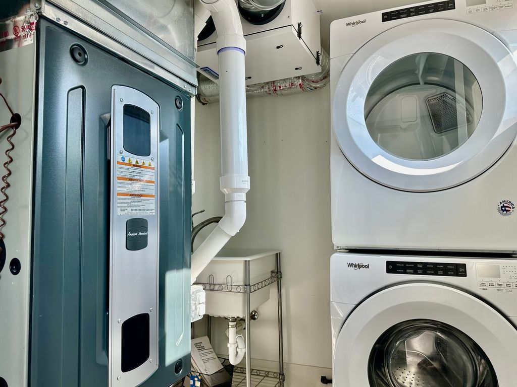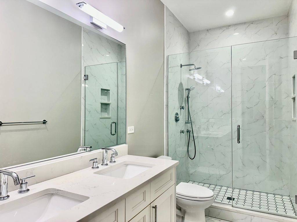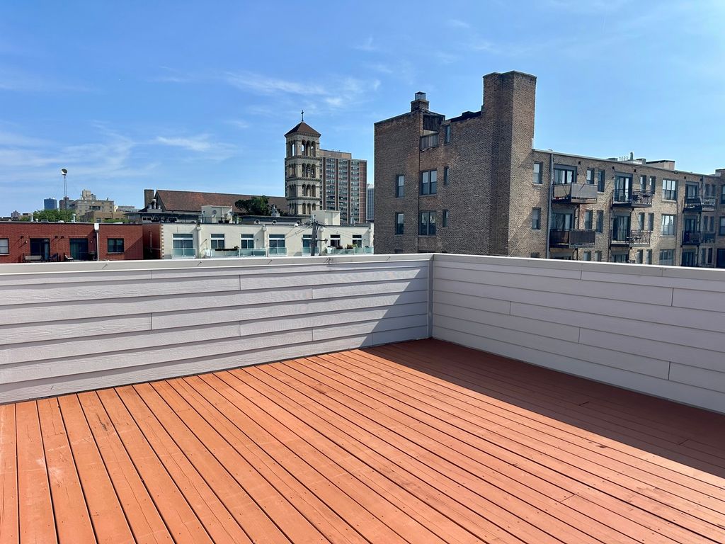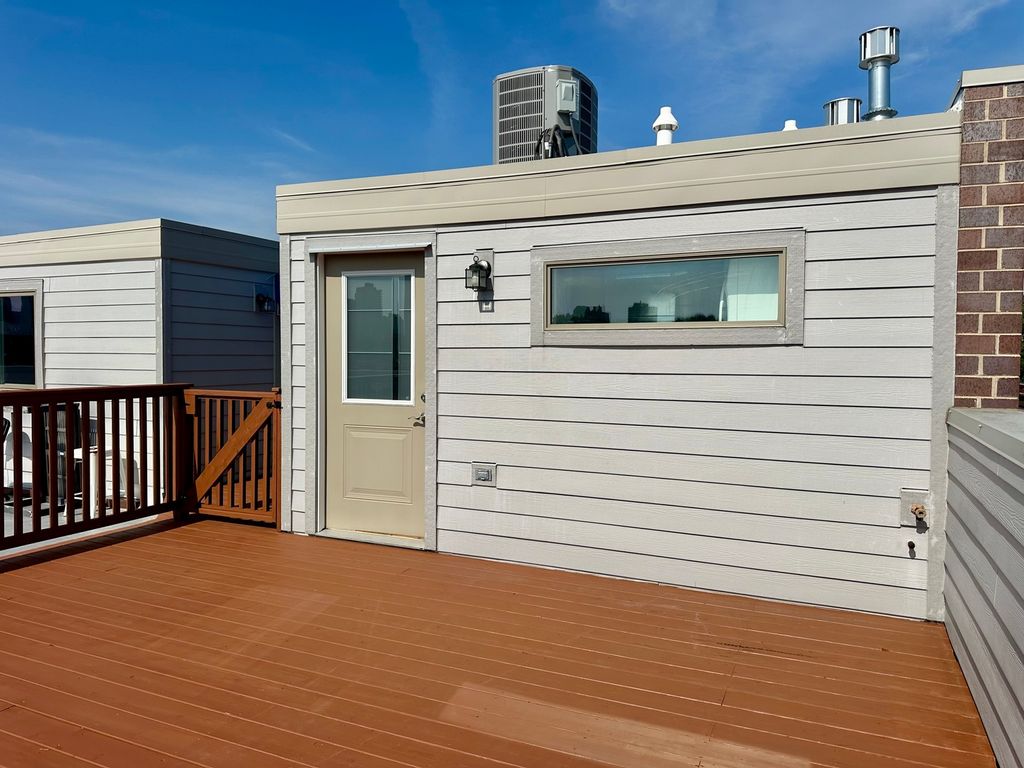 Penthouse duplex-up with interior stair access to a private rooftop deck with skyline and Wrigley Field light views. Main level includes hardwood floors, direct-vent gas fireplace, and an open balcony off the living room. Kitchen includes Bosch fridge, Thermador 6-burner stove and hood, wine chiller, quartz counters, and two-tone cabinetry. Upstairs: three bedrooms and full-size laundry. Includes tankless water heater, RenewAire ERV, American Standard HVAC, Cat-5/coax wiring, and garage parking. Buena Park location near Sheridan Red Line, Wrigley, lakefront parks, and Montrose Harbor.