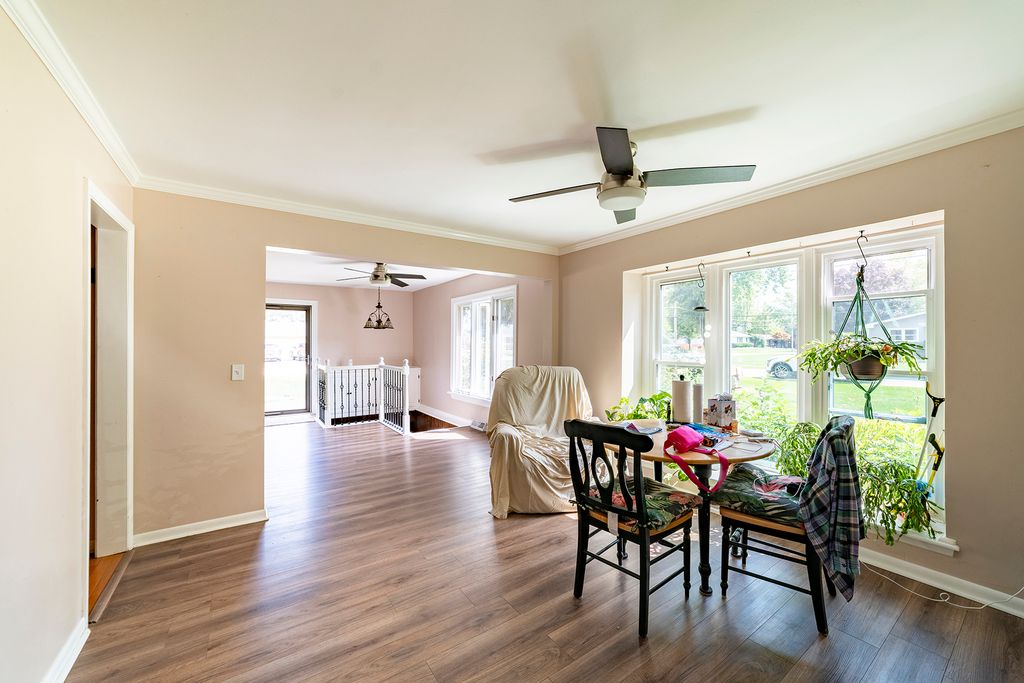 Welcome to this energy-efficient 5-bedroom, 3-bath home nestled in a quiet, highly desirable neighborhood just a 5-minute walk to the picturesque riverfront and the vibrant downtown Yorkville area, offering all the shops, dining, and entertainment you desire. Situated on a spacious corner lot adorned with mature trees and beautiful perennials, this charming residence boasts great bones, character, and a warm, inviting atmosphere. The home features three cozy fireplaces and an abundance of natural light that fills every room. Inside, you'll find newer vinyl flooring in the living and dining rooms, with hardwood flooring on the first level and beneath the vinyl in the living area. The updated kitchen showcases quartz countertops, a stylish backsplash, stained glass cabinet inserts, and modern stainless steel appliances. Step outside to the deck accessible from the large family room via sliding glass doors. The basement is 3/4 finished, complete with a wet bar and numerous unique storage areas, and it has always been dry. The oversized two-car garage offers a workbench and ample cabinet storage, providing plenty of space for projects and organization. Many recent upgrades have been thoughtfully completed, including newer windows, electric updated one year ago, and the roof replaced five years ago. Upstairs furnace and A/C are four years old. Refrigerator (5 years), stove (5), microwave (1), dishwasher (5). This home is truly a gem, ready for your personal touch to make it uniquely yours! The owner is offering this property **As Is**, presenting a fantastic opportunity for buyers looking to customize a home with great potential. Make an appointment today and see if this is the home you have been looking for!