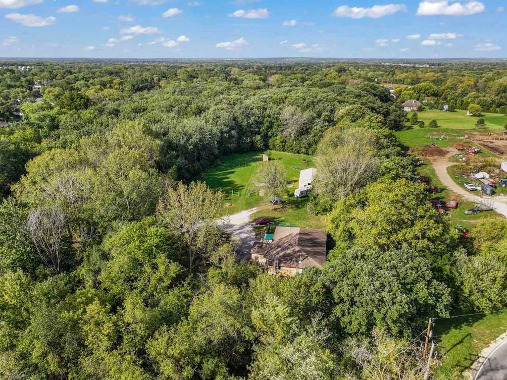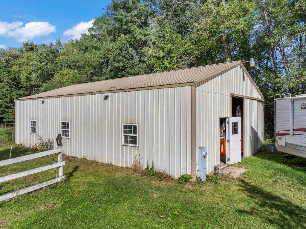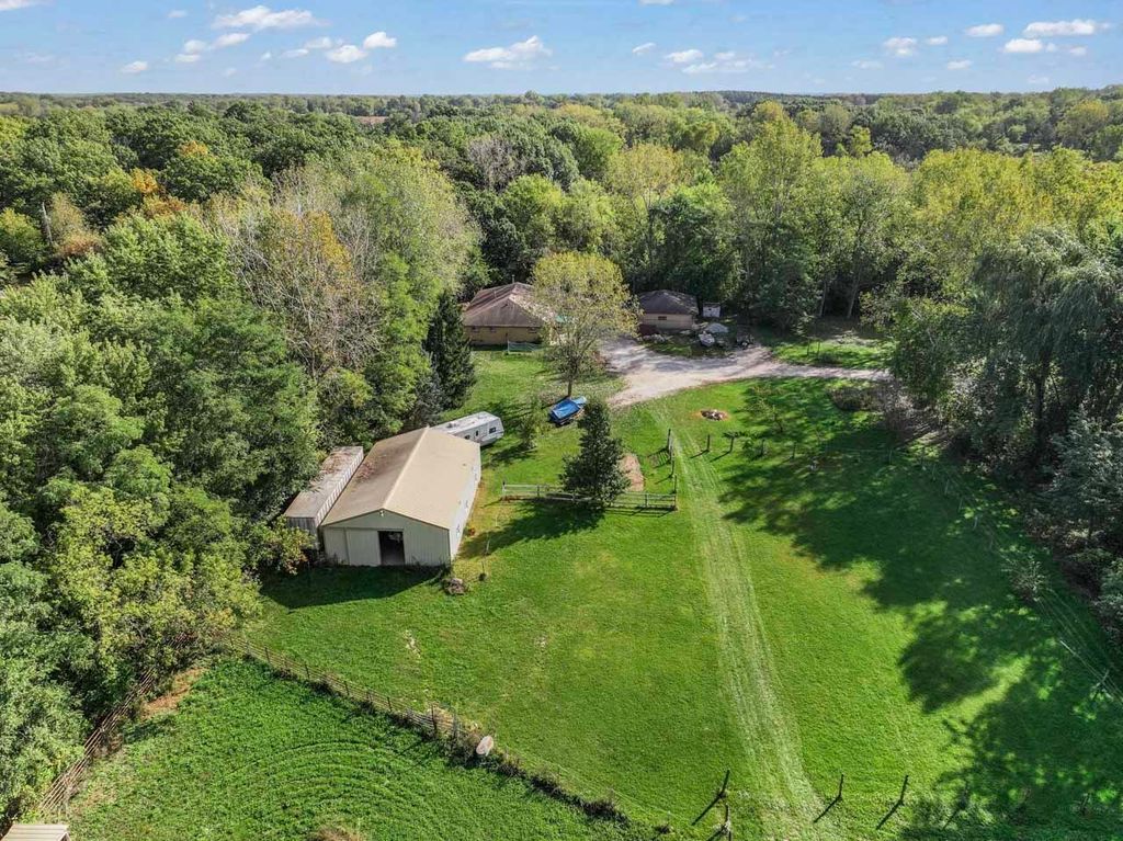Privacy & space galore on this 12-acre hobby farm, tucked away in a beautiful wooded setting w/ cleared pasture areas- perfect for horses, animals, or future expansion. The well-built all-brick ranch home features 4 spacious bedrooms, 1 full bath & 2 half baths, including a primary suite w/half bath, walk-in closet & double wall closet. Enjoy a HUGE eat-in kitchen w/walk-in pantry & oversized living room. Mostly unfinished basement features exterior access & includes an office, half bath & roughed-in shower room ready for finishing. SO much potential!!! Detached 3-car garage, plus a 5-7 stall horse barn with water, electric & 2 sliding barn doors. A semi trailer stays for extra storage. This rare offering combines privacy, acreage & opportunity- ready for your vision of country living!