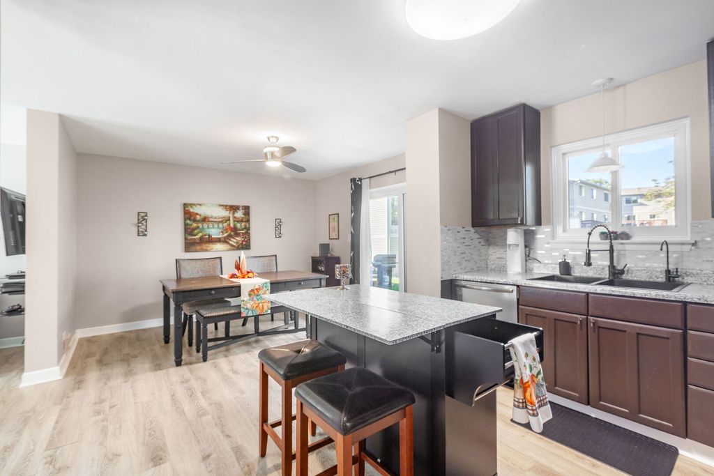 Welcome to this bright, spacious two-story townhome offering comfort and style in a prime location. Enjoy a private entrance and low-maintenance laminate flooring throughout, creating a warm and inviting feel. The full, freshly painted finished basement provides additional living space and ample storage. The main level features a spacious living room and a convenient powder room, perfect for guests. The kitchen boasts 42" cabinetry, room for a center island, and an open layout to the dining area-ideal for everyday living and entertaining. Off the dining room are patio doors to a private patio overlooking peaceful green space, perfect for relaxing or dining outdoors. Upstairs, you'll find two generously sized bedrooms and a shared full bath. Recent improvements: New refrigerator, dishwasher, kitchen sink and faucet, reverse osmosis system, tile backsplash, cabinet pulls, upstairs bathroom faucet all in 2024. Additional highlights include a high-efficiency furnace and A/C, low association dues, and an unbeatable location close to Schaumburg's Town Square, parks, library, shopping, dining, entertainment, Metra, and major expressways. Located in the highly rated Schaumburg High School District.