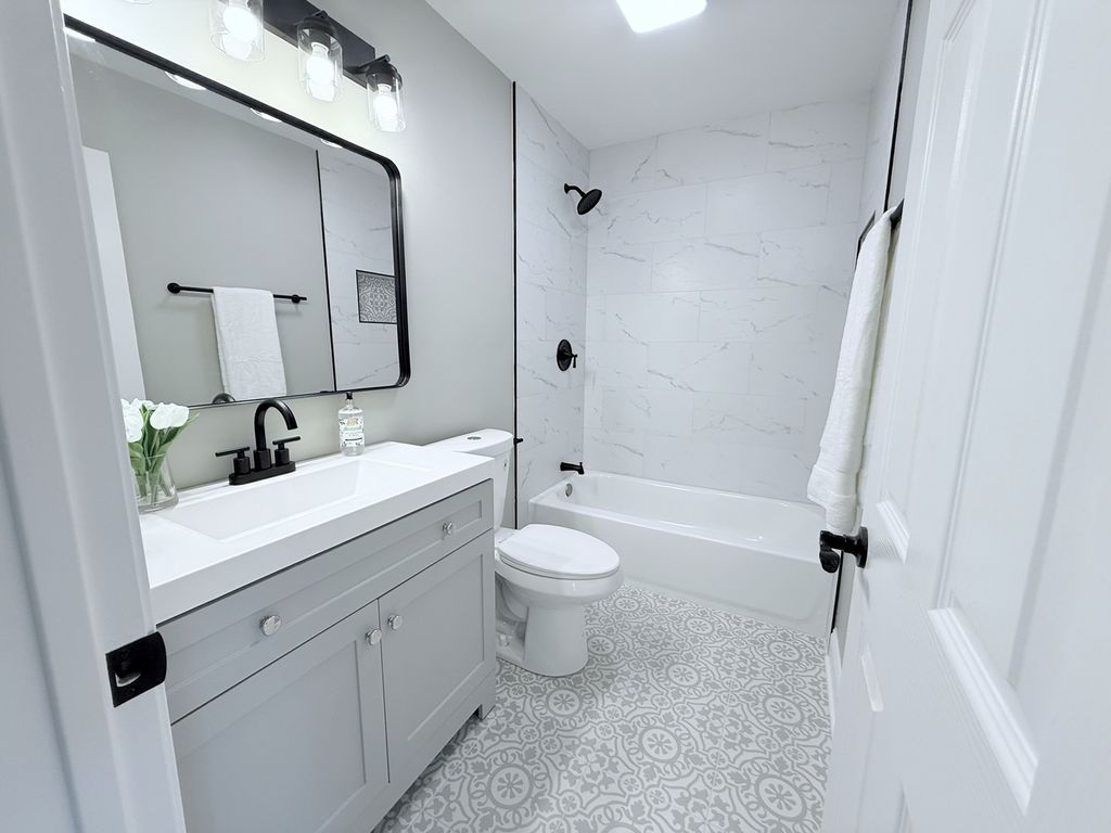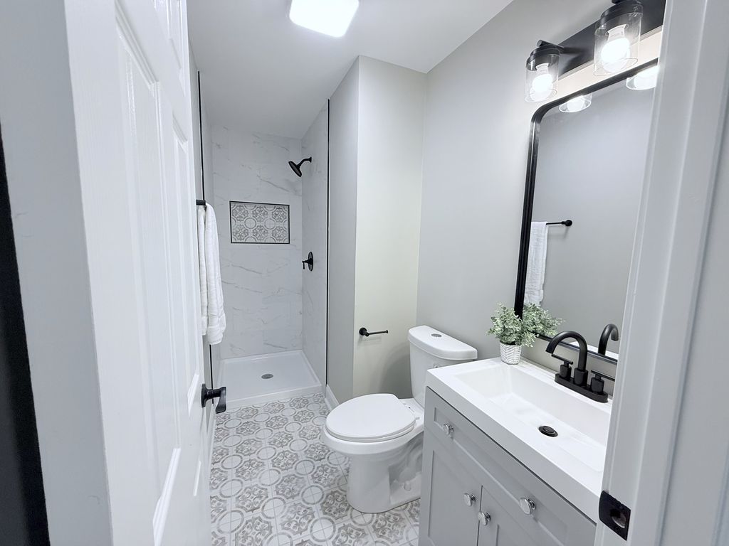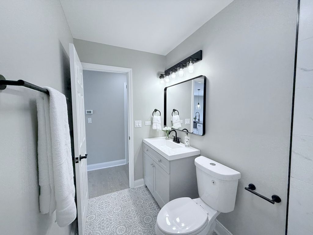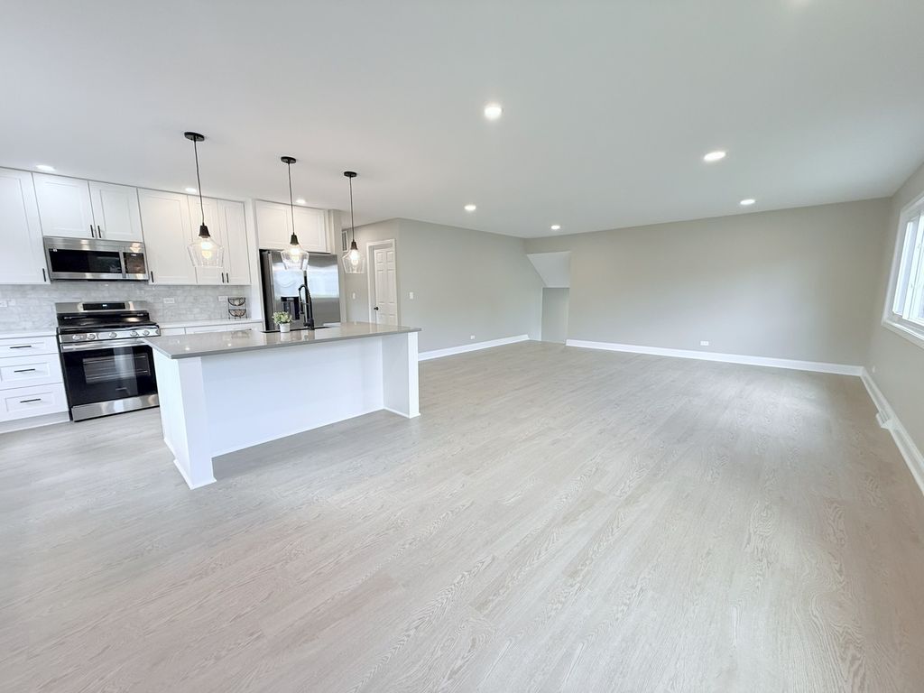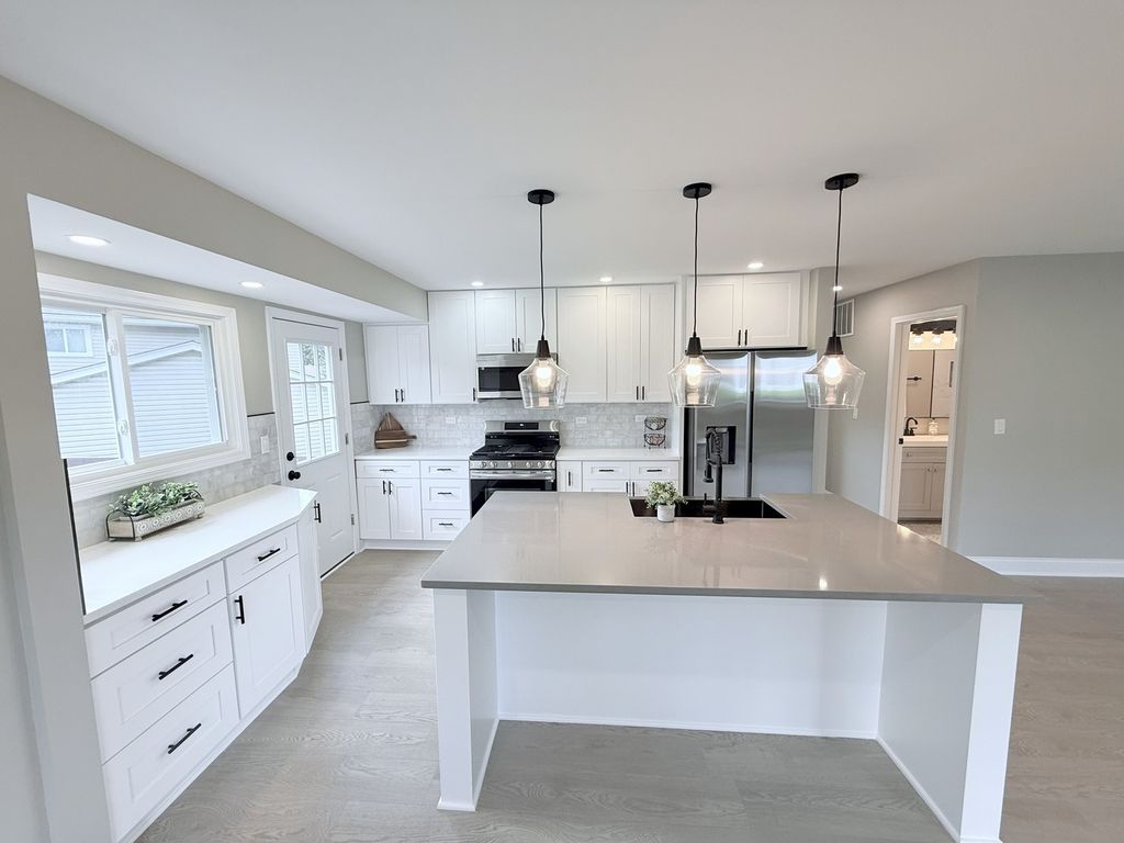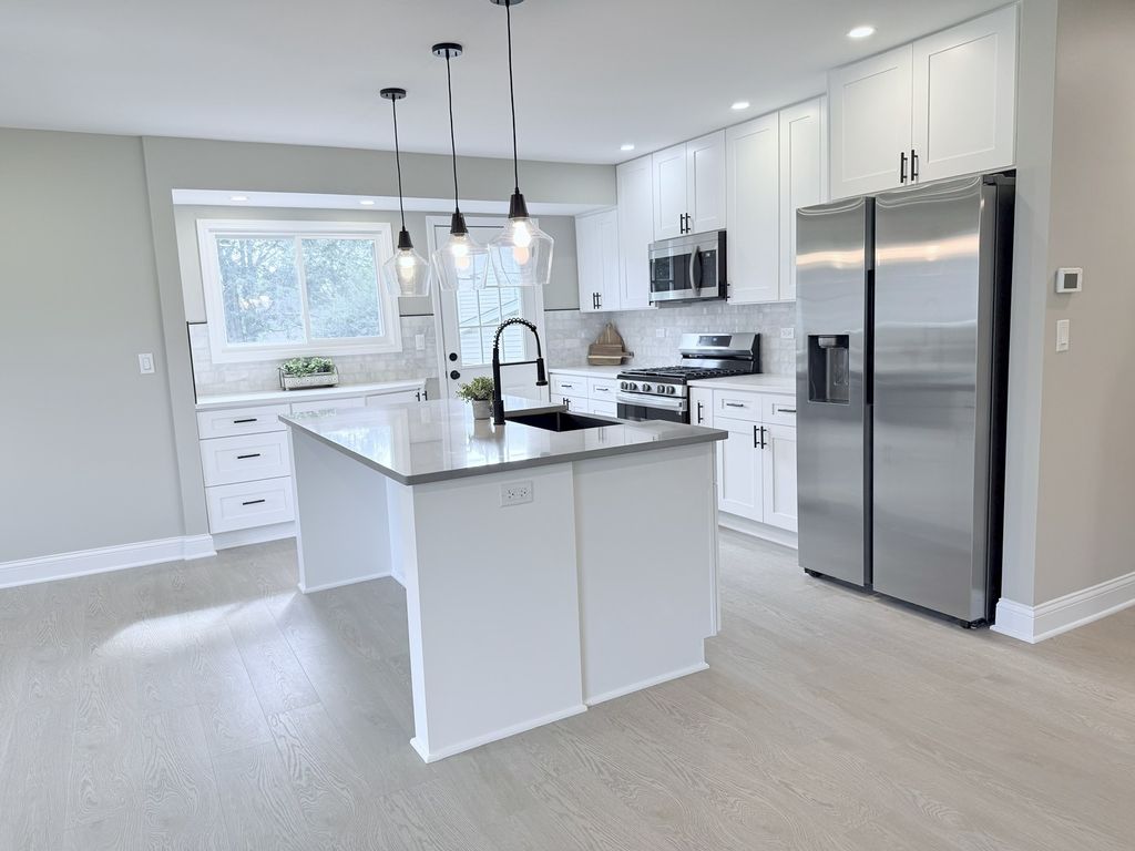 Your Dream Home Is Calling! This beautiful 5-bedroom, 3-bathroom home has been meticulously designed to balance style with everyday comfort. From the moment you step inside, you'll notice the thoughtful style choices-fresh paint, new waterproof luxury vinyl flooring, black finishes and recessed lighting that brightens every space. The open-concept main level is highlighted by a chef-inspired kitchen with quartz countertops, an oversized island, brand-new cabinets, stainless steel appliances, and a striking marble backsplash-perfect for both entertaining and special gatherings. The main bedroom offers a peaceful retreat with a walk-in closet and a full bathroom, while large windows throughout the home fill each room with an abundance of natural light. The full finished basement is a true showstopper, offering a spacious retreat with a cozy wood-burning fireplace. Whether you envision it as a home theater, game room, gym, or office, this versatile level provides endless possibilities for the way you live and enjoy your home. Additional highlights include an attached two-car garage and updates you'll appreciate: newer siding & roof, doors, and windows, a long asphalt driveway, along with beautifully updated bathrooms featuring detailed tilework. Outside, you'll love the ample backyard and side deck-ideal for outdoor fun, gardening, or simply unwinding outdoors. Nestled in a private cul-de-sac, yet just minutes from the Promenade, local dining and shopping, parks, and quick highway access, this home offers both convenience and tranquility. Move-in ready and thoughtfully updated throughout, this is truly the home you've been waiting for!