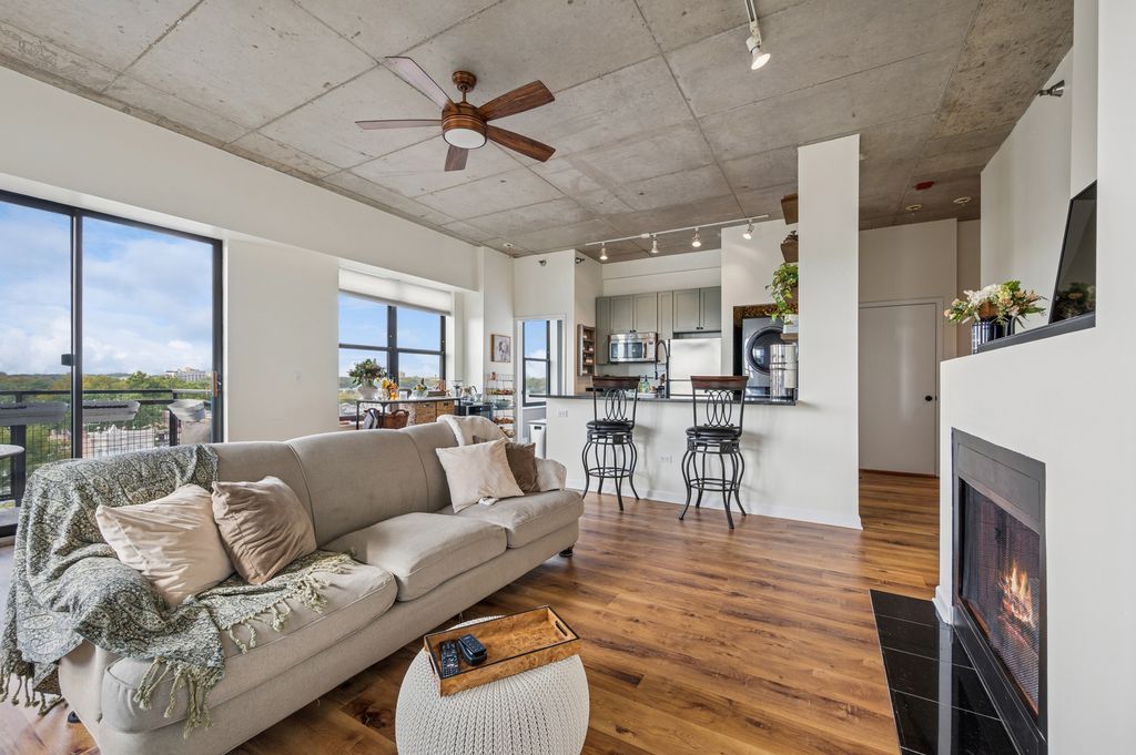 Edgewater modern loft living with sweeping west-facing views and incredible natural light! This corner unit boasts an open floor plan with 10' ceilings, oversized windows, and a cozy gas fireplace that anchors the living space. Step out to your private balcony for sunset views or entertain around the updated kitchen featuring tall custom cabinets, stainless steel appliances with a 5-burner stove, granite breakfast bar, and plenty of storage. The spacious primary suite includes a walk-in Elfa closet and a refreshed spa bath with new vanities, mirrors, and lighting, plus a soaking tub/shower. Brand-new luxury wide-plank vinyl floors run throughout, adding warmth and style. Additional highlights include in-unit laundry, a proper foyer, and a storage unit. The building offers a fitness center with lake views, a huge common rooftop deck, party room, dog run, on-site management, and a receiving room. Heated garage parking with private bike rack included. Conveniently located near Andersonville, Whole Foods, Jewel, Bryn Mawr restaurants, and just one block from the newly renovated Red Line.