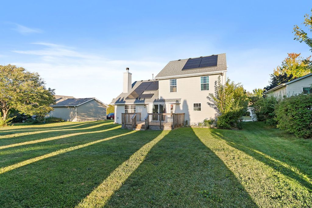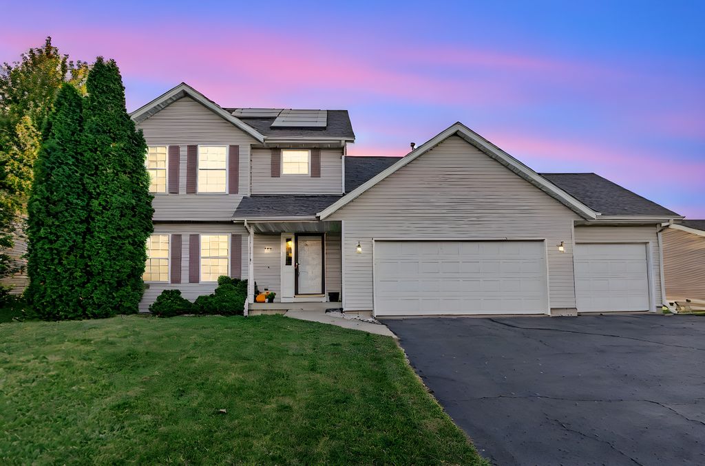 Modern comfort meets timeless charm in this beautifully updated two-story home offering 1,800 square feet of thoughtfully designed living space. Step inside to a bright front living room where updated LVP flooring flows seamlessly throughout the main level. The kitchen (remodeled in 2021) features painted cabinetry, quartz countertops, a beveled tile backsplash, and matte black fixtures, complemented by newer stainless-steel appliances (2018-2022). The open layout connects effortlessly to the dining area and cozy family room with a woodburning fireplace and gas starter, perfect for relaxing nights in. Step out to the expansive backyard with a large deck (2020) and no exterior neighbors for added privacy. A combined mudroom and laundry area (washer/dryer 2023) leads to the spacious 3-car garage. Pass by the main floor half-bath and head upstairs, where you'll find two generous bedrooms and full hall bath, along with a serene primary suite, complete with a tastefully remodeled bathroom featuring ceramic tile flooring and white subway tile walk-in shower with sliding glass door. The full unfinished basement offers ample storage and potential, equipped with a radon mitigation system, new sump pump (2020), and water heater (2021). Energy-efficient solar panels transfer to the new owner, while major updates-HVAC and roof (2018)-ensure peace of mind. Ideally located near Schnuck's, scenic bike paths, parks, and River Heights Golf Course, with quick access to I-88 for easy commuting, this home is the total package! Schedule your private showing today.