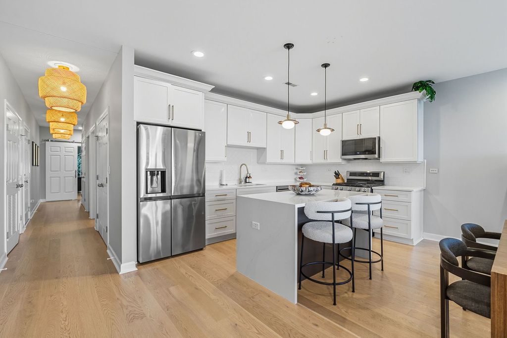 Welcome home to this spacious and beautifully updated 2-bedroom, 2-bath condo in an intimate 8-unit elevator building in prime Lake View location with only two units per floor. This extra-wide unit offers an open-concept kitchen, living, and dining area that lives larger than your average unit and features an accented electric fireplace. The living and dining areas provide plenty of room to entertain or relax, while the updated eat-in kitchen features two tone white and brown cabinetry with modern hardware, subway tile backsplash, white quartz countertops with a waterfall island, and updated appliances. Expansive front windows flood the space with natural light and open to a private balcony through sliding glass doors, with an adjacent nook that's perfect for a home office or reading area. Down the hallway toward the bedrooms, you'll find a spacious laundry room with side-by-side full-size washer and dryer, plus an ELFA storage system above. Across the hall is a generous coat closet, also outfitted with ELFA organization. The secondary bedroom features hardwood floors, dual closets, and is next to large secondary bathroom with walk-in shower and glass door. The primary suite impresses with gorgeous custom accent wall, updated wall sconces, and a massive walk-in closet with custom ELFA system. The spa-like ensuite bath has been updated with new black fixtures, and features massive tub and walk-in shower. Perfectly situated within the sought-after Burley School District, this home offers easy access to Lincoln Avenue's best restaurants, shopping, bars, and boutiques. Garage parking is included in the price.