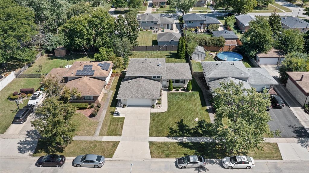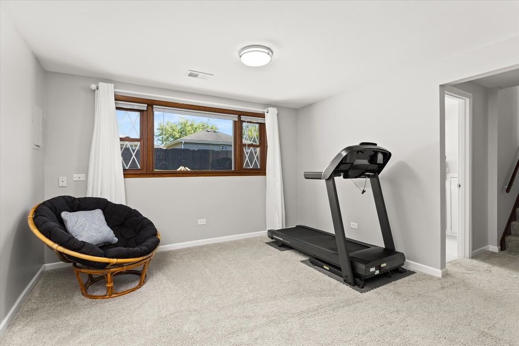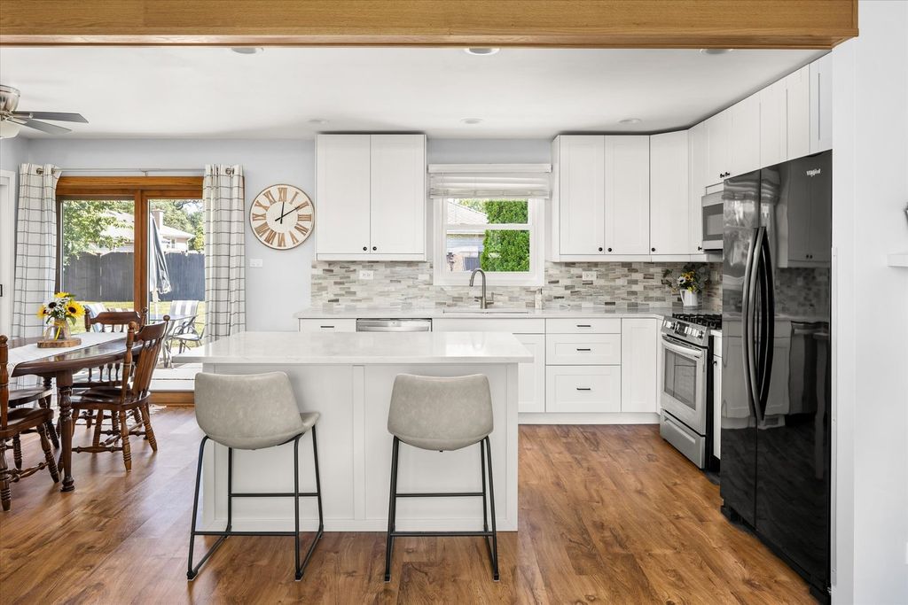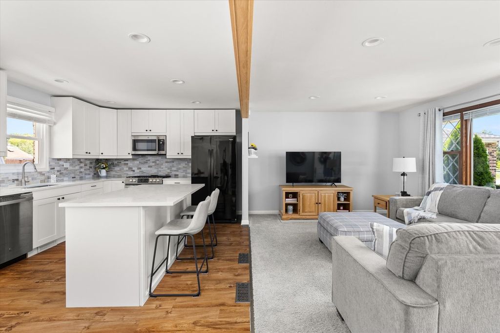 Welcome to this beautifully remodeled 3-bedroom, 2-bath tri-level in Lemont with 1,600 sq. ft. of modern living space. Step inside to a sunlight-filled living room that opens to the fully remodeled kitchen, where a striking wood beam separates the two spaces. The eat-in kitchen features 42" soft-close cabinets, quartz countertops, marble backsplash, GE Cafe microwave, gas range, a large island with seating, and a deep stainless sink with spot-free faucet. The Pella sliding glass doors leads to the concrete back patio and meticulously maintained back yard. Upstairs, the spacious primary bedroom offers a custom feature wall, ceiling fan, new blackout blinds, and a custom closet organizer. Two additional bedrooms and a fully updated hall bath with new vanity, quartz/marble top, tub/shower, tile flooring, and fixtures complete the second level. The lower level boasts English windows for natural light, a large family room with an extra area great a home office or hobby area, and a second remodeled bath with a glass shower, new vanity, tile flooring, and fixtures. The oversized utility room includes a utility sink and washer/dryer hookups with direct access to the 2.5 car garage with new isulated garage door and 16ft workbench with storage. Large dry concrete crawl space for additional storage. Major updates within the last 1-4 years include: new 30-year architectural roof, oversized gutters and downspouts, insulated garage door, high-efficiency HVAC, water heater, sump pump, Nest thermostat, attic insulation, high efficancy Quiet Cool whole-house fan 3 speeds with timmer. Ductwork has been professionally cleaned and sanitized. Exterior features include new Pella front door, cedar shutters, coach lights, freshly landscaped with rock bed and brick edging, a large concrete patio with gas line for grill, private yard, and quiet neighborhood setting. Located near grocery stores, coffee shops, Downtown Lemont, parks, dog parks, walking paths, and the Lemont Park District. Part of the award-winning Blue Ribbon School District with easy access to I-55, I-355, and the Metra station.This home is a rare find with modern updates, prime location, and true pride of ownership. Truly nothing to do but move in! Don't miss your chance to tour this beautiful property.