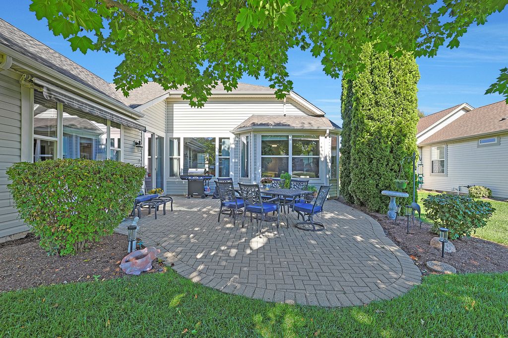 DEL WEBB TRAVERSE BAY ON THE PERFECT LOT~PRISTINE CONDITION~NO HOUSE BEHIND~CROWN MOLDING IN LIVING, DINING AND FAMILY ROOMS~FANTASTIC KITCHEN WITH NEWER APPLIANCES AND GRANITE COUNTERTOPS~HARDWOOD FLOORS IN ALL BUT BEDROOMS~FEATURES 3 BEDROOMS,(3rd BEDROOM COULD BE DEN )~MASTER BEDROOM INCLUDES BAY WINDOW,CLOSET SYSTEM IN ONE OF DUAL CLOSETS, AND A LARGE MASTER BATH WITH A JETTED TUB, SHOWER and DUAL VANITIES~ 2 1/2 CAR GARAGE WITH GOLF CART PARKING OR EXTRA STORAGE~ PULL DOWN STAIRS TO FLOORED ATTIC~ UNDERGROUND LAWN SPRINKLER SYSTEM~BEAUTIFULLY LANDSCAPED YARD~OVERSIZED BRICK PAVER PATIO FOR ENTERTAINING~NEWER ROOF (2014).~WALK TO WILDFLOWER LAKE AND THE PATH AROUND THE LAKE~AWNING INCLUDED AS-IS-SELLER HAS NEVER USED AWNING.~BRIGHT BEAUTIFUL HOME. COME ENJOY LIFE IN DEL WEBB SUN CITY HUNTLEY, A 55 PLUS COMMUNITY.