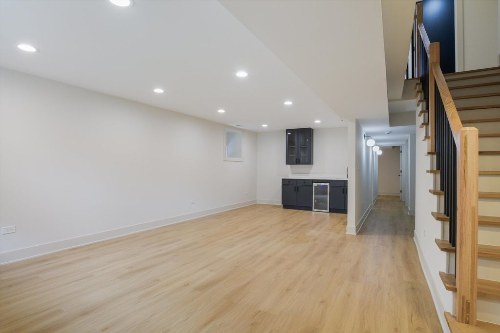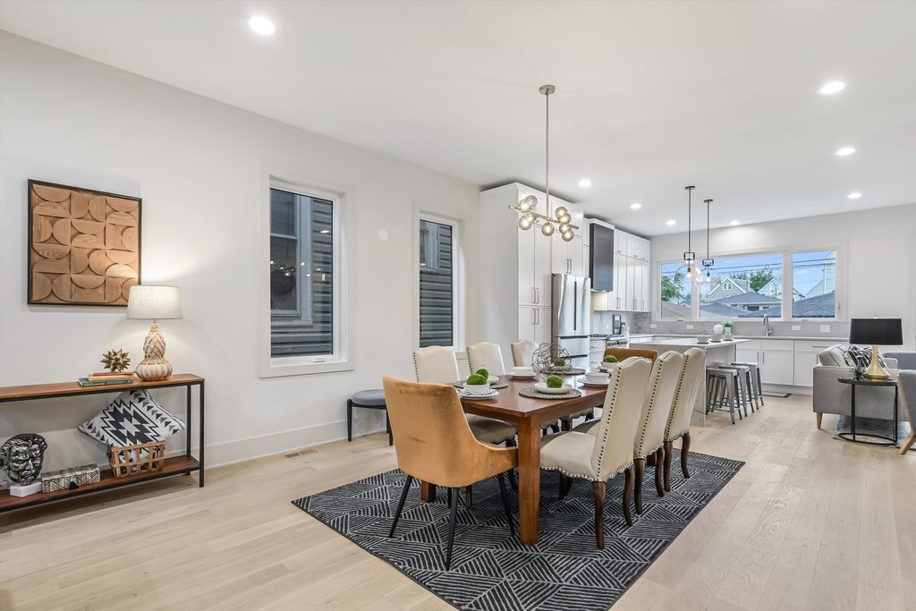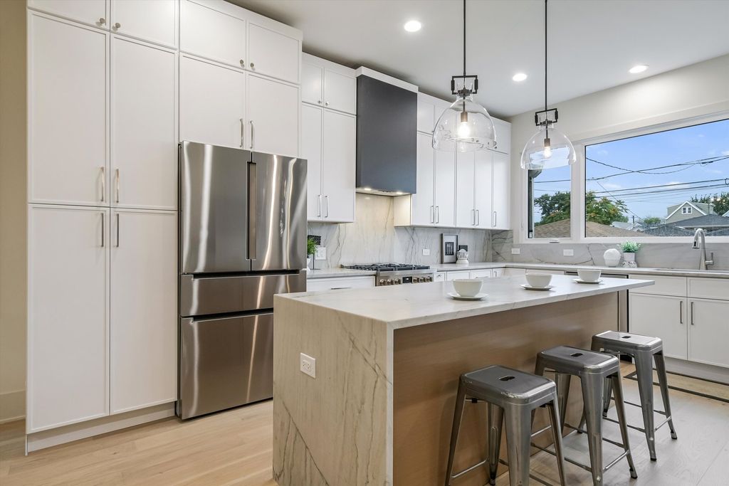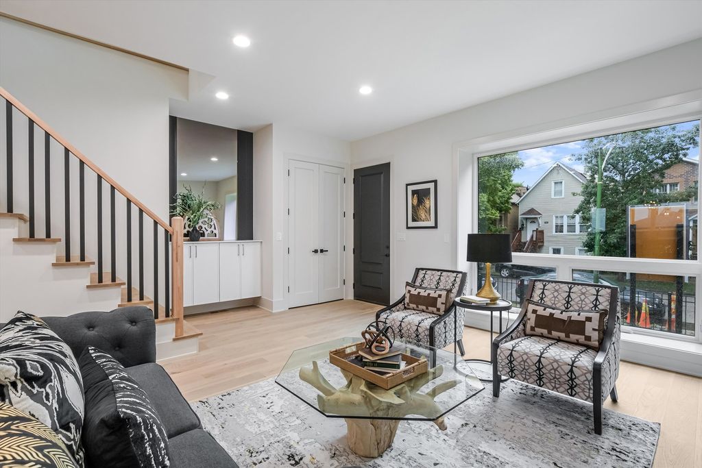 Located less than five blocks From the Logan Square Farmer's Market, this beautifully reimagined home boasts an extra wide interior foot print and designer grade finishes throughout. The Home features an expansive open-concept main level featuring ten foot tall ceilings, white oak hardwood flooring throughout, 8-foot solid core doors, and custom quartzite countertops in the kitchen and powder room. Some of the upgrades in this home include finished custom closets throughout, heated floors in the primary bathroom, a full height natural quartzite backsplash, and multiple custom built in features. Incredible natural light pours through oversized windows and a thoughtfully placed skylight, highlighting the home's exceptional craftsmanship and airy feel. The kitchen, thoughtfully appointed with Bosch appliances, custom cabinetry, and a large island perfect for entertaining. Upstairs, you'll find three spacious bedrooms and two luxurious bathrooms, including a stunning primary suite with vaulted ceilings, a spa-inspired bathroom featuring a freestanding soaking tub, double vanity, and a walk-in shower. The fully finished basement expands your living space with a large family room + Bar, additional bedroom, and full bathroom-ideal for guests or a home office setup. Dual-zone HVAC ensures year-round comfort throughout all three levels. Enjoy outdoor living with an oversized rear deck, green yard space, and a two-car garage for added convenience. Located under a mile from the Logan Square Farmers Market, you're steps away from some of the best dining, shopping, and community vibes the neighborhood has to offer. Crafted by an experienced local developer, this is not your typical new construction-every detail has been carefully curated to create a truly special home.