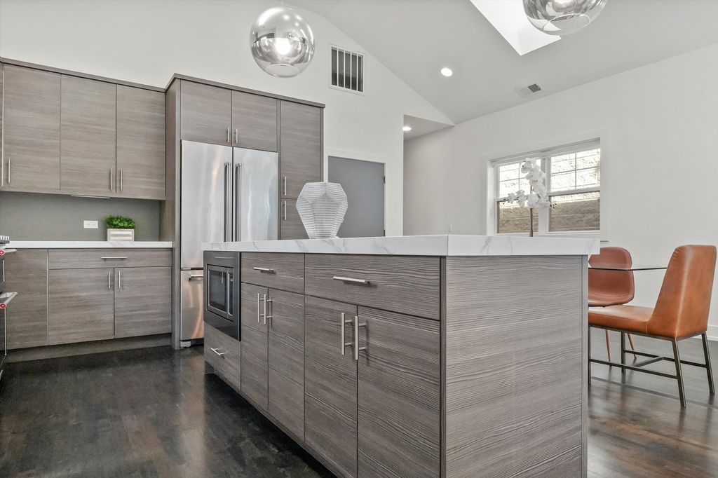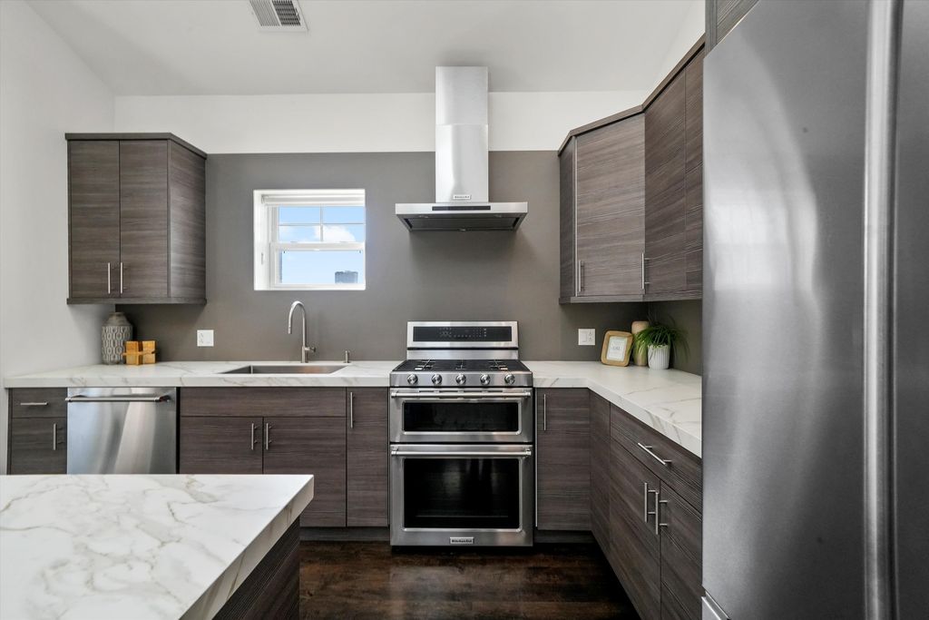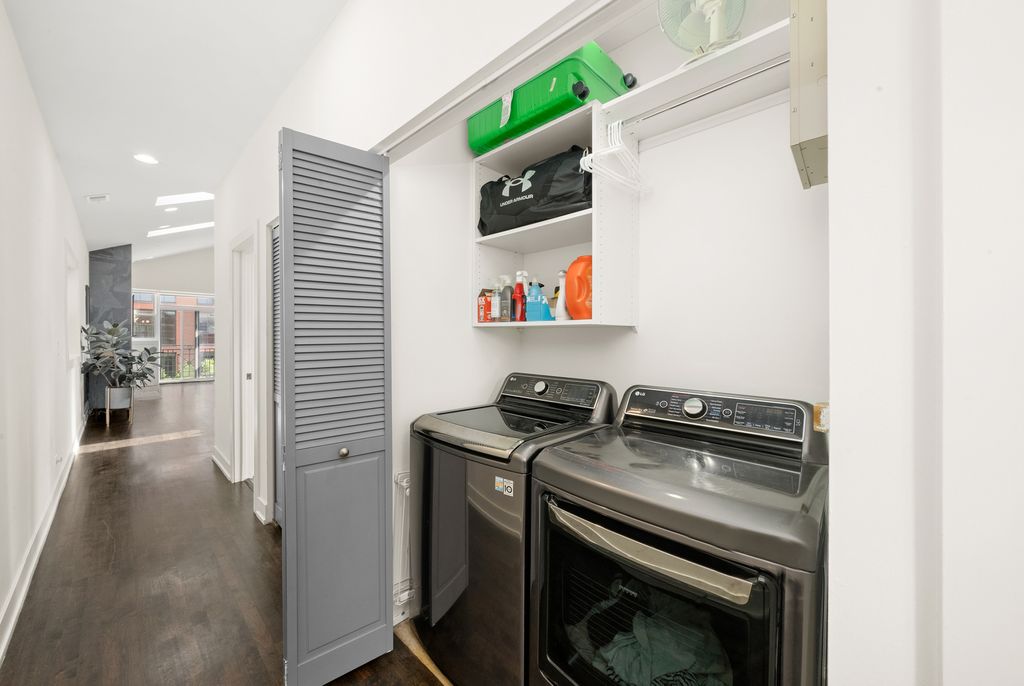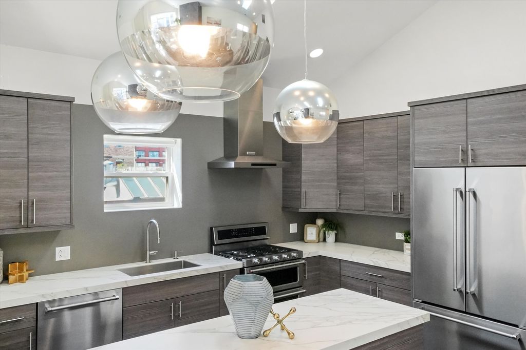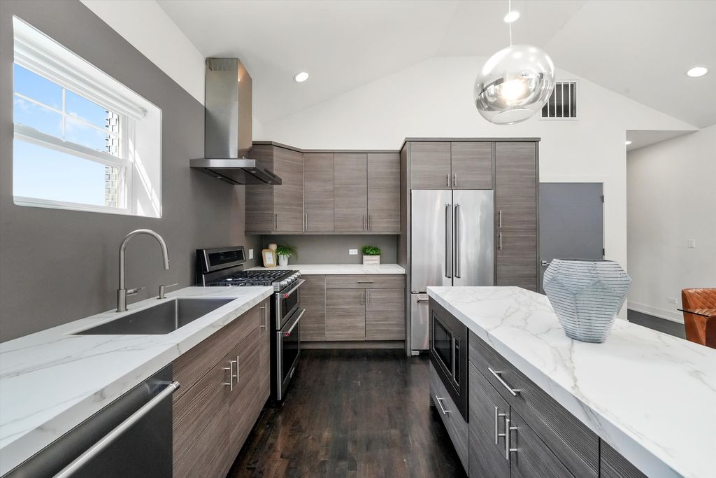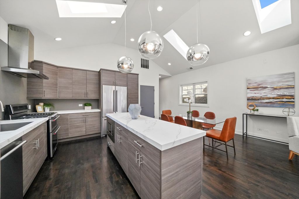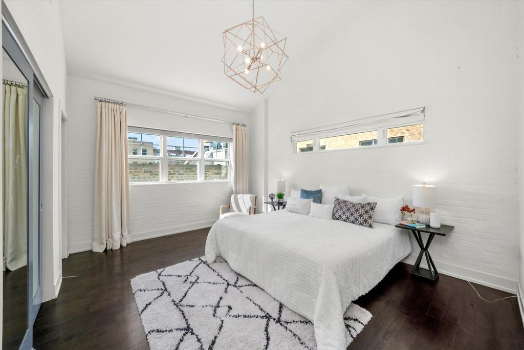 Spectacular, Sunny Penthouse in the Heart of Fulton Market! Top-floor 2 bed, 2 bath PENTHOUSE in the vibrant Fulton Market District with multiple outdoor spaces and incredible natural light! This highly upgraded home features vaulted cathedral ceilings, skylights, and panoramic views of the city and Fulton Market from the front balcony! The spacious, open floor plan is complemented by rich hardwood floors throughout and a modern gas fireplace. The chef's kitchen is beautifully appointed with Neolith countertops and extended island, stainless steel appliances, soft-close cabinetry, and an undermount farmhouse sink-perfect for cooking and entertaining. The extra-large primary suite includes a spa-like bath with a gorgeous standalone shower, skylight, and double vanity. Additional highlights include professionally organized closets, side-by-side washer/dryer, extra storage room, and garage parking-all included in the price. Outdoor space galore: enjoy a front balcony, rear deck, and access to a shared garage rooftop deck! Located just steps from renowned restaurants, bars, shops, parks, and the Green Line El stop. This is an incredible opportunity in an unbeatable location-don't miss your chance to enjoy the best of Chicago living! Explore the property in 3D! Click the 3D button to take a virtual tour and walk through every detail.