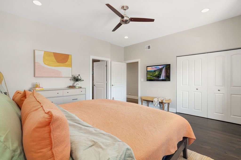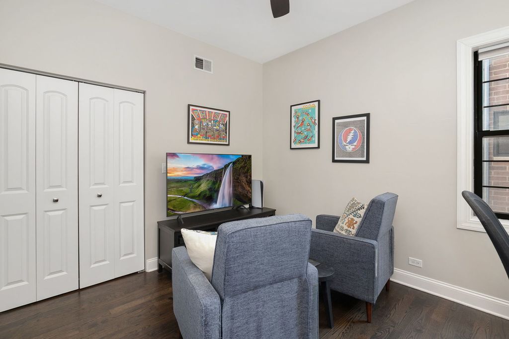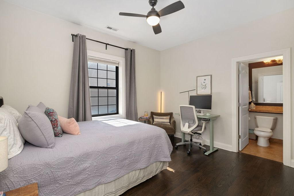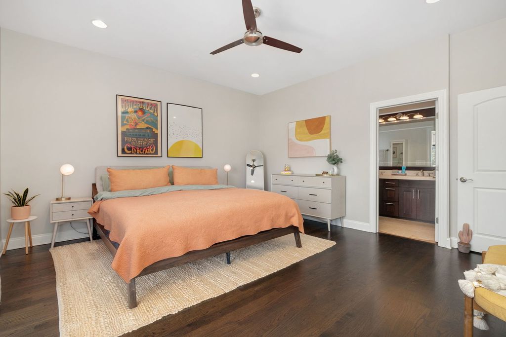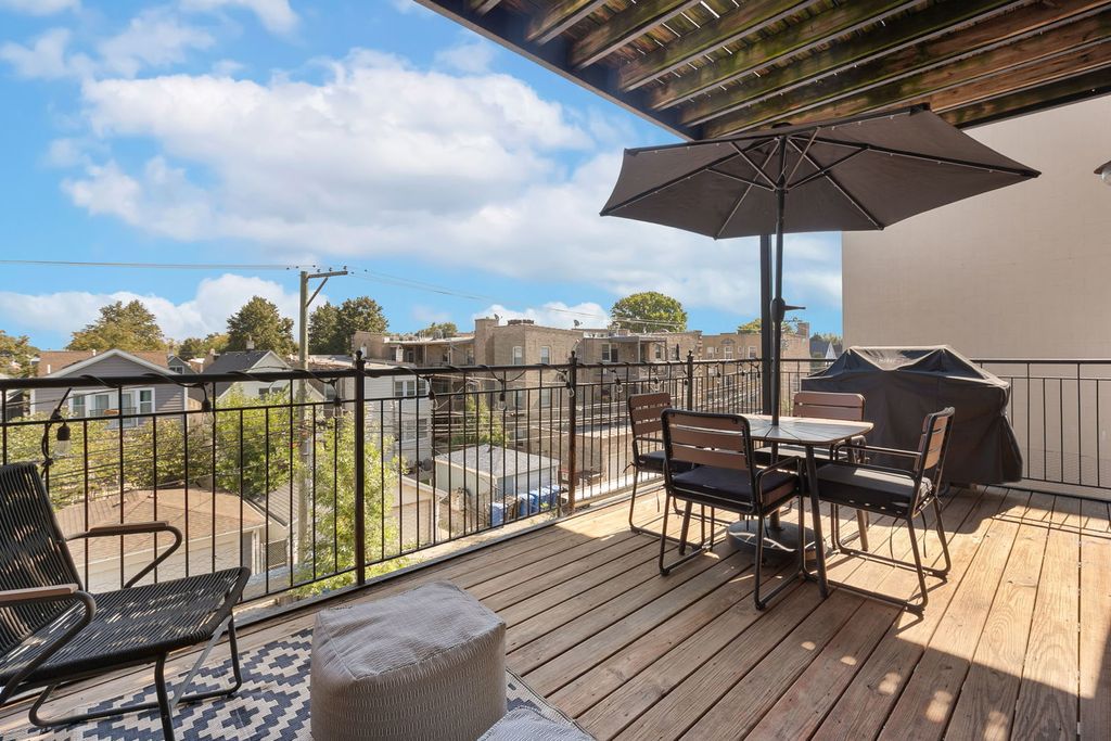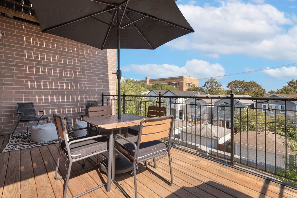 Welcome to this gorgeous, light-filled 3 bed, 2.5 bath condo in a boutique elevator building in East Irving Park-just minutes from Avondale and North Center! This spacious 1,800 square foot home was repainted in 2022 and features refinished oak hardwood floors (2023) throughout, soaring 12-foot ceilings, an open floor plan and modern finishes throughout. Large windows let in tons of natural light to the living and dining room. The kitchen is a chef's dream, featuring top-of-the-line Viking and Bosch appliances, Grohe fixtures, 42" walnut cabinets that were refinished in 2023, granite countertops and a breakfast bar. The large primary bedroom offers direct access to a private back deck and features a large closet, ceiling fan plus a luxurious en suite with whirlpool tub and walk in shower with multiple body sprays and shower heads. Two spacious secondary bedrooms including one with private en suite, a convenient half bath for guests and in unit laundry complete the unit. An attached heated garage space is included in the price - the space is conveniently right next to the elevator. Enjoy easy access to Horner Park, restaurants and shopping. Just blocks to the Addison Blue Line, multiple bus lines and with quick access to 90/94 it is a commuters dream location. A truly beautiful home offering space, style and location!